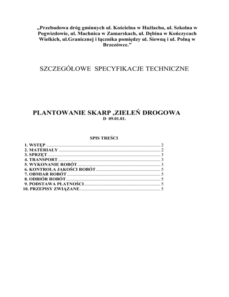 „Przebudowa dróg gminnych ul. Kościelna w HaŜlachu, ul. Szkolna w Pogwizdowie, ul. Machnica w Zamarskach, ul. Dębina w Kończycach Wielkich, ul.Granicznej i łącznika pomiędzy ul. Siewną i ul. Polną w Brzezówce.” SZCZEGÓŁOWE SPECYFIKACJE TECHNICZNE PLANTOWANIE SKARP ,ZIELEŃ DROGOWA D 09.01.01. SPIS TREŚCI 1. WSTĘP ................................................................................................... 2 2. MATERIAŁY ........................................................................................ 2 3. SPRZĘT .................................................................................................. 3 4. TRANSPORT ......................................................................................... 3 5. WYKONANIE ROBÓT ........................................................................ 3 6. KONTROLA JAKOŚCI ROBÓT ........................................................ 5 7. OBMIAR ROBÓT ................................................................................. 5 8. ODBIÓR ROBÓT.................................................................................. 5 9. PODSTAWA PŁATNOŚCI .................................................................. 5 10. PRZEPISY ZWIĄZANE ...................................................................... 5 „Przebudowa dróg gminnych ul. Kościelna w HaŜlachu, ul. Szkolna w Pogwizdowie, ul. Machnica w Zamarskach, ul. Dębina w Kończycach Wielkich, ul.Granicznej i łącznika pomiędzy ul. Siewną i ul. Polną w Brzezówce.” 1. WSTĘP 1.1. Przedmiot ST Przedmiotem niniejszej specyfikacji technicznej są wymagania dotyczące wykonania i odbioru robót związanych z plantowaniem skarp i urządzaniem zieleni drogowej w ramach realizacji zadania: „Przebudowa dróg gminnych ul. Kościelna w HaŜlachu, ul. Szkolna w Pogwizdowie, ul. Machnica w Zamarskach, ul. Dębina w Kończycach Wielkich, ul.Granicznej i łącznika pomiędzy ul. Siewną i ul. Polną w Brzezówce.” 1.2. Zakres stosowania ST Specyfikacja techniczna stanowi dokument przetargowy i kontraktowy przy zlecaniu i realizacji robót wymienionych w p. 1.1. 1.3. Zakres robót objętych SST Ustalenia zawarte w niniejszej specyfikacji dotyczą zasad prowadzenia robót związanych z: − zakładaniem i pielęgnacją trawników na terenie płaskim i na skarpach, − wykonaniem plantowania ziemi . 1.4. Określenia podstawowe 1.4.1. Ziemia urodzajna - ziemia posiadająca właściwości zapewniające roślinom prawidłowy rozwój. 1.4.2. Materiał roślinny - trawa. 1.4.7. Pozostałe określenia podstawowe są zgodne z obowiązującymi, odpowiednimi polskimi normami i z definicjami podanymi w SST D-M-00.00.00 „Wymagania ogólne” pkt 1.4. 1.5. Ogólne wymagania dotyczące robót Ogólne wymagania dotyczące robót podano w SST D-M-00.00.00 „Wymagania ogólne” pkt 1.5. 2. MATERIAŁY 2.1. Ogólne wymagania dotyczące materiałów Ogólne wymagania dotyczące materiałów, ich pozyskiwania i składowania, podano w SST D-M-00.00.00 „Wymagania ogólne” pkt 2. 2.2. Ziemia urodzajna Ziemia urodzajna, w zaleŜności od miejsca pozyskania, powinna posiadać następujące charakterystyki: − ziemia rodzima - powinna być zdjęta przed rozpoczęciem robót budowlanych i zmagazynowana w pryzmach nie przekraczających 2 m wysokości, − ziemia pozyskana w innym miejscu i dostarczona na plac budowy - nie moŜe być zagruzowana, przerośnięta korzeniami, zasolona lub zanieczyszczona chemicznie. 2.3. Ziemia kompostowa Do nawoŜenia gleby mogą być stosowane komposty, powstające w wyniku rozkładu róŜnych odpadków roślinnych i zwierzęcych (np. torfu, fekaliów, kory drzewnej, chwastów, plewów), przy kompostowaniu ich na otwartym powietrzu w pryzmach, w sposób i w warunkach zapewniających utrzymanie wymaganych cech i wskaźników jakości kompostu. Kompost fekaliowo-torfowy - wyrób uzyskuje się przez kompostowanie torfu z fekaliami i ściekami bytowymi z osadników, z osiedli mieszkaniowych. Kompost fekalowo-torfowy powinien odpowiadać wymaganiom BN-73/0522-01 [5], a torf uŜyty jako komponent do wyrobu kompostu - PN-G-98011 [1]. Kompost z kory drzewnej - wyrób uzyskuje się przez kompostowanie kory zmieszanej z mocznikiem i osadami z oczyszczalni ścieków pocelulozowych, przez okres około 3-ch miesięcy. Kompost z kory sosnowej moŜe być stosowany jako nawóz organiczny przy przygotowaniu gleby pod zieleń w okresie jesieni, przez zmieszanie kompostu z glebą. 2.4. Nasiona traw Nasiona traw najczęściej występują w postaci gotowych mieszanek z nasion róŜnych gatunków. 2 „Przebudowa dróg gminnych ul. Kościelna w HaŜlachu, ul. Szkolna w Pogwizdowie, ul. Machnica w Zamarskach, ul. Dębina w Kończycach Wielkich, ul.Granicznej i łącznika pomiędzy ul. Siewną i ul. Polną w Brzezówce.” Gotowa mieszanka traw powinna mieć oznaczony procentowy skład gatunkowy, klasę, numer normy wg której została wyprodukowana, zdolność kiełkowania. 2.6. Nawozy mineralne Nawozy mineralne powinny być w opakowaniu, z podanym składem chemicznym (zawartość azotu, fosforu, potasu - N.P.). Nawozy naleŜy zabezpieczyć przed zawilgoceniem i zbryleniem w czasie transportu i przechowywania. 3. SPRZĘT 3.1. Ogólne wymagania dotyczące sprzętu Ogólne wymagania dotyczące sprzętu podano w SST D-00.00.00 „Wymagania ogólne” pkt 3. 3.2. Sprzęt stosowany do wykonania zieleni drogowej Wykonawca przystępujący do wykonania zieleni drogowej powinien wykazać się moŜliwością korzystania z następującego sprzętu: − glebogryzarek, pługów, kultywatorów, bron do uprawy gleby, − wału kolczatki oraz wału gładkiego do zakładania trawników, − kosiarki mechanicznej do pielęgnacji trawników, − sprzętu do pozyskiwania ziemi urodzajnej (np. spycharki gąsiennicowej, koparki), a ponadto do pielęgnacji zadrzewień: 4. TRANSPORT 4.1. Ogólne wymagania dotyczące transportu Ogólne wymagania dotyczące transportu 