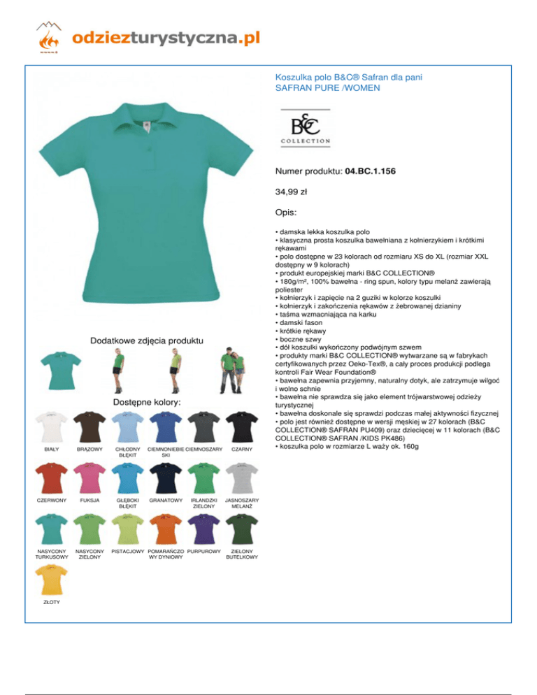 Koszulka polo B&C® Safran dla pani SAFRAN PURE /WOMEN Numer produktu: 04.BC.1.156 34,99 zł Opis: Dodatkowe zdjęcia produktu Dostępne kolory: BIAŁY BRĄZOWY CHŁODNY BŁĘKIT CZERWONY FUKSJA GŁĘBOKI BŁĘKIT NASYCONY TURKUSOWY NASYCONY ZIELONY ZŁOTY Powered by TCPDF (www.tcpdf.org) CIEMNONIEBIE CIEMNOSZARY SKI GRANATOWY IRLANDZKI ZIELONY PISTACJOWY POMARAŃCZO PURPUROWY WY DYNIOWY CZARNY JASNOSZARY MELANŻ ZIELONY BUTELKOWY • damska lekka koszulka polo • klasyczna prosta koszulka bawełniana z kołnierzykiem i krótkimi rękawami • polo dostępne w 23 kolorach od rozmiaru XS do XL (rozmiar XXL dostępny w 9 kolorach) • produkt europejskiej marki B&C COLLECTION® • 180g/m², 100% bawełna - ring spun, kolory typu melanż zawierają poliester • kołnierzyk i zapięcie na 2 guziki w kolorze koszulki • kołnierzyk i zakończenia rękawów z żebrowanej dzianiny • taśma wzmacniająca na karku • damski fason • krótkie rękawy • boczne szwy • dół koszulki wykończony podwójnym szwem • produkty marki B&C COLLECTION® wytwarzane są w fabrykach certyfikowanych przez Oeko-Tex®, a cały proces produkcji podlega kontroli Fair Wear Foundation® • bawełna zapewnia przyjemny, naturalny dotyk, ale zatrzymuje wilgoć i wolno schnie • bawełna nie sprawdza się jako element trójwarstwowej odzieży turystycznej • bawełna doskonale się sprawdzi podczas małej aktywności fizycznej • polo jest również dostępne w wersji męskiej w 27 kolorach (B&C COLLECTION® SAFRAN PU409) oraz dziecięcej w 11 kolorach (B&C COLLECTION® SAFRAN /KIDS PK486) • koszulka polo w rozmiarze L waży ok. 160g