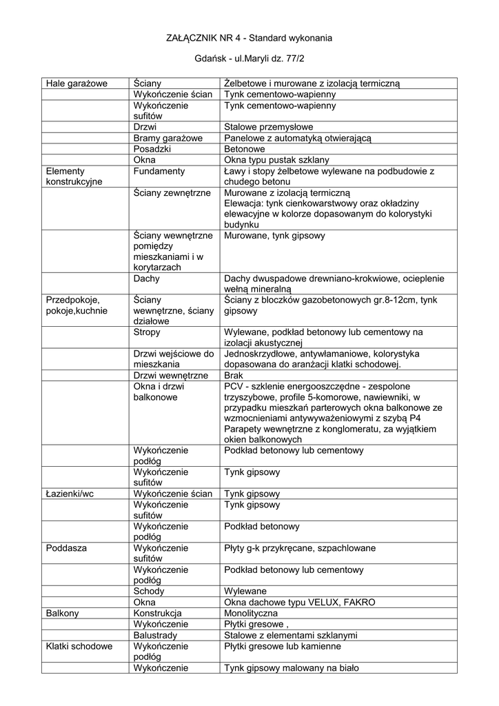ZAŁĄCZNIK NR 4 - Standard wykonania Gdańsk - ul.Maryli dz. 77/2 Hale garażowe Elementy konstrukcyjne Ściany Wykończenie ścian Wykończenie sufitów Drzwi Bramy garażowe Posadzki Okna Fundamenty Ściany zewnętrzne Ściany wewnętrzne pomiędzy mieszkaniami i w korytarzach Dachy Przedpokoje, pokoje,kuchnie Ściany wewnętrzne, ściany działowe Stropy Drzwi wejściowe do mieszkania Drzwi wewnętrzne Okna i drzwi balkonowe Łazienki/wc Poddasza Balkony Klatki schodowe Wykończenie podłóg Wykończenie sufitów Wykończenie ścian Wykończenie sufitów Wykończenie podłóg Wykończenie sufitów Wykończenie podłóg Schody Okna Konstrukcja Wykończenie Balustrady Wykończenie podłóg Wykończenie Żelbetowe i murowane z izolacją termiczną Tynk cementowo-wapienny Tynk cementowo-wapienny Stalowe przemysłowe Panelowe z automatyką otwierającą Betonowe Okna typu pustak szklany Ławy i stopy żelbetowe wylewane na podbudowie z chudego betonu Murowane z izolacją termiczną Elewacja: tynk cienkowarstwowy oraz okładziny elewacyjne w kolorze dopasowanym do kolorystyki budynku Murowane, tynk gipsowy Dachy dwuspadowe drewniano-krokwiowe, ocieplenie wełną mineralną Ściany z bloczków gazobetonowych gr.8-12cm, tynk gipsowy Wylewane, podkład betonowy lub cementowy na izolacji akustycznej Jednoskrzydłowe, antywłamaniowe, kolorystyka dopasowana do aranżacji klatki schodowej. Brak PCV - szklenie energooszczędne - zespolone trzyszybowe, profile 5-komorowe, nawiewniki, w przypadku mieszkań parterowych okna balkonowe ze wzmocnieniami antywyważeniowymi z szybą P4 Parapety wewnętrzne z konglomeratu, za wyjątkiem okien balkonowych Podkład betonowy lub cementowy Tynk gipsowy Tynk gipsowy Tynk gipsowy Podkład betonowy Płyty g-k przykręcane, szpachlowane Podkład betonowy lub cementowy Wylewane Okna dachowe typu VELUX, FAKRO Monolityczna Płytki gresowe , Stalowe z elementami szklanymi Płytki gresowe lub kamienne Tynk gipsowy malowany na biało sufitów Balustrady Drzwi wejściowe Wykończenie ścian Zagospodarowanie Dojścia i dojazdy terenu Oświetlenie Miejsce gromadzenia odpadów stałych Ogrodzenie Bramy, furtki wejściowe Teren Stalowe, z elementami szklanymi lub drewnianymi, kolorystyka dopasowana do wystroju wnętrza Drzwi aluminiowe Płytki gresowe lub ceramiczne lub tapeta, tynk gipsowy malowany na biało, elementy wystroju wnętrza wg decyzji architekta Z kostki betonowej Niskie oprawy Wydzielone Drewniane i/lub panelowe, słupki betonowe i/lub stalowe Stalowe w kolorze dopasowanym do kolorystyki budynku, z automatyką otwierającą Ziemia i trawa oraz elementy zielone wg decyzji architekta INSTALACJE ELEKTRYCZNE - na podstawie karty technicznej lokalu INSTALACJE TELETECHNICZNE - na podstawie karty technicznej lokalu Liczniki pomiarowe na zewnątrz budynku oraz w częściach wspólnych, 1 licznik administracyjny INSTALACJE SANITARNE I GRZEWCZE Liczniki pomiarowe wewnątrz budynku oraz w części zewnętrznej Instalacja grzewcza Grzejniki W pokojach : płytowe typu Diamond W łazienkach : grzejniki drabinkowe Głowice termostatyczne. Piece gazowe Każdy lokal będzie wyposażony w indywidualny energooszczędny piec gazowy kondensacyjny Instalacja wod-kan Podejścia pod umywylkę, wc wannę lub prysznic wg projektu Podejścia pod pralkę, zmywarkę i zlewozmywak Wentylacje Grawitacyjne WYSOKOŚCI POMIESZCZEŃ - ok 275cm na parterze, ok.275cm na piętrze, ok.250cm na poddaszu