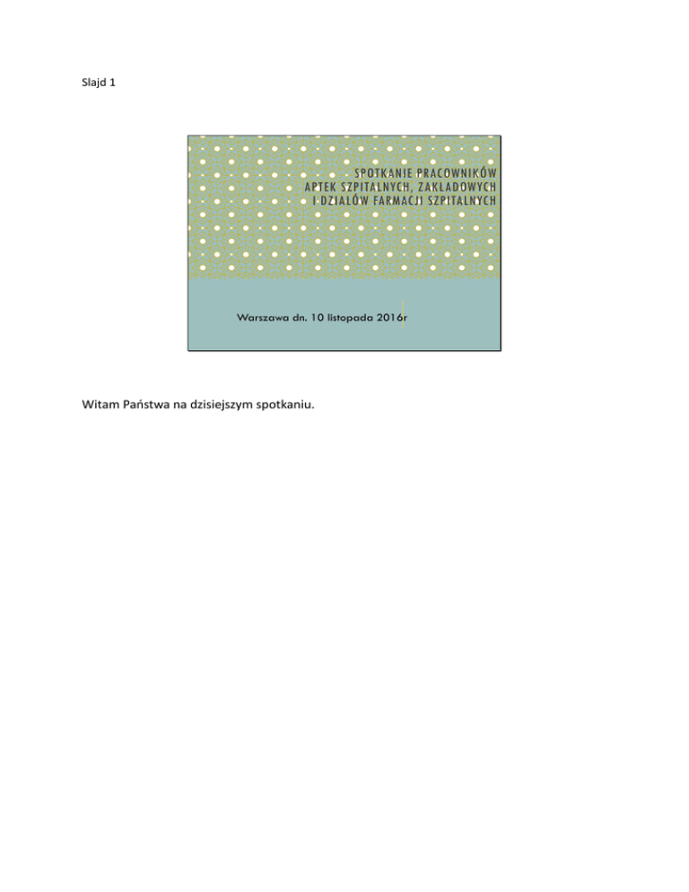 Slajd 1 SPOTKANIE PRACOWNIKÓW APTEK SZPITALNYCH, ZAKŁADOWYCH I DZIAŁÓW FARMACJI SZPITALNYCH Warszawa dn. 10 listopada 2016r Witam Państwa na dzisiejszym spotkaniu. Slajd 2 RELACJA Z PRAC NIA… * Parlamentarny Zespół ds. regulacji rynku farmaceutycznego o projekcie ustawy Prawo Farmaceutyczne (20.10.16r i 04.11.16r) * Konferencja dot. wdrażania Dyrektywy Fałszywkowej (relacja wideo 12.10.2016r) * XXV-lecie Odrodzonego Samorządu Aptekarskiego (9.11.2016r) * Spotkanie w GIF-ie z ministrem Zbigniewem Niewójtem Na stronie naszej Izby umieszczone są linki do stron z nagranymi posiedzeniami Parlamentarnego Zespołu ds. rynku farmaceutycznego, zachęcam do obejrzenia tych posiedzeń, dotyczą one planowanych korzystnych dla farmaceutów zmian w ustawie Prawo Farmaceutyczne. Umieszczona jest również relacja wideo z konferencji dotyczącej unijnej dyrektywy fałszywkowej. W dniu wczorajszym obchodziliśmy centralne uroczystości XXV-lecia Samorządu Aptekarskiego, w trakcie których nasza koleżanka mgr farm. Ewa Steckiewicz-Bartnicka została odznaczona medalem im. prof. Bronisława Koskowskiego. Jest to najwyższe odznaczenie, jakim może uhonorować farmaceutę samorząd aptekarski. Koleżance serdecznie gratulujemy tego wyróżnienia! W październiku odbyło się spotkanie szpitalników z pełniącym obowiązki GIF-a Zbigniewem Niewójtem. Poruszone zostały problemy z występującymi brakami leków stosowanych w lecznictwie zamkniętym. W trakcie dyskusji uczestnicy spotkania doszli do wniosku, że nasze zgłoszenia braków lekowych giną w „gąszczu” zgłoszeń z aptek ogólnodostępnych. Pan minister zadecydował, że poleci przygotowanie WIF-om oddzielnej zakładki/strony do zgłoszeń dla szpitalników. Dyskutowano również nad problemem rozliczania w NFZ części leków cytostatycznych niewykorzystanych w trakcie sporządzania podań dla pacjentów. Takie „resztki” są obecnie stratą apteki/szpitala. Minister Niewójt obiecał przyjrzeć się bliżej tej sprawie. Slajd 3 NASZE PYTANIA -Jak najszybciej odróżnić produkt leczniczy/wyrób medyczny (rejestr produktów leczniczych?) -Koncentraty produktów leczniczych Nasze pytania: Produkt leczniczy umieszczony jest na stronie Rejestru Produktów Leczniczych (http://pub.rejestrymedyczne.csioz.gov.pl/#results). Znajdują się tam wszystkie produkty lecznicze wpisane do Rejestru Produktów Leczniczych Dopuszczonych do Obrotu na terytorium Rzeczpospolitej Polskiej oraz wpisane do Wspólnotowego Rejestru Produktów Leczniczych. Dla wyrobów medycznych nie utworzono takiego rejestru, najprościej – wyrób medyczny jest oznakowany znakiem CE. Umieszcza się go: - na wyrobie; - w instrukcji używania wyrobu; - na opakowaniu handlowym wyrobu; - na opakowaniu zapewniającym sterylność aktywnego wyrobu medycznego do implantacji; - na wyrobie medycznym do diagnostyki in vitro – jeżeli to możliwe; - na wyrobie medycznym lub jego opakowaniu zapewniającym sterylność – jeżeli to możliwe. - jeśli chodzi o zestawienie dostępnych koncentratów produktów leczniczych to w dyskusji stwierdziliśmy, że nie ma takiego zestawienia, każdy z nas tworzy je indywidualnie na podstawie używanych w danej jednostce koncentratów. Slajd 4 WARSZTATY „KOMUNIKACJA INTERPERSONALNA” 19.10.2016R - Podsumowanie - Inny temat: praca w zespole, motywacja i kierowanie zespołem (?) Uczestnicy warsztatów chwalili profesjonalizm i przygotowanie prowadzącej, mam nadzieję że poruszane tematy i proponowane rozwiązania będą dla Państwa przydatne w pracy jak i w życiu prywatnym. Jeśli znajdą się chętni, to powtórzymy warsztaty wiosną przyszłego roku. Natomiast jesienią 2017r proponuję trochę inną tematykę szkolenia (oczywiście również w formie warsztatów). Slajd 5 WARSZTATY 30 LISTOPADA 2016R mec. Zbigniew Pawlak (Kancelaria Prawna w Radomiu) „Udzielanie zamówień publicznych przez podmioty lecznicze po zmianach Ustawy Prawo zamówień Publicznych w 2016 r. Wybrane aspekty proceduralne na przykładzie dostawy produktów leczniczych” 30.11.2016r (środa) godz. 16.00 -zgłoszenie na formularzu do Izby (do 18 listopada) Przypominam o zgłoszeniach na szkolenie z zamówień publicznych, które odbędzie się 30 listopada br. Slajd 6 RÓŻNE 23-26.10.2016r XVII Ogólnopolskie Spotkanie Farmacji Onkologicznej 18-19.11.2016r. - XI Ogólnopolska Konferencja Naukowa Sekcji Do- i Pozajelitowego PTFarm Warszawa „Znaczenie wsparcia żywieniowego w chorobach przewlekłych i opiece hospicyjnej” - VIII Ogólnopolska Konferencja Lekarsko-Farmaceutyczna BEZPIECZNA FARMAKOTERAPIA Kraków Najbliższe wydarzenia ogólnopolskie dla szpitalników opisane zostały w skrócie na slajdzie. Slajd 7 RÓŻNE * 30.11.2016r (środa) Spotkanie Andrzejkowo-Mikołajkowe dla dzieci Bemowski Dom Kultury (bezpłatne zaproszenia w OIA) * bezpłatne bilety do teatru, kabaretu dla członków Izby * strona internetowa Izby dla szpitalników Okręgowa Izba Aptekarska w Warszawie zaprasza farmaceutów ze swoimi pociechami na spotkanie Andrzejkowo-Mikołajkowe, wystarczy odebrać w siedzibie Izby bezpłatne zaproszenie. Co jakiś czas pojawiają się też bezpłatne bilety na wydarzenia kulturalne, takie informacje umieszczane są na stronie Izby. W dalszym ciągu czekamy na uruchomienie nowej strony internetowej, jeśli ktoś z Państwa ma pomysły jak ma być skonstruowana nasza (tj. dla szpitalników) zakładka, co ma zawierać, w jakiej formie, to już teraz zapraszam do współpracy. Slajd 8 ZEBRANIE 8 GRUDNIA 2016R * Spotkanie wigilijne* Na spotkanie wigilijne zapraszam wszystkich Państwa w czwartek 8 grudnia. Slajd 9 PYTANIA??? Na dzisiaj to wszystko, dziękuję za przybycie na zebranie.