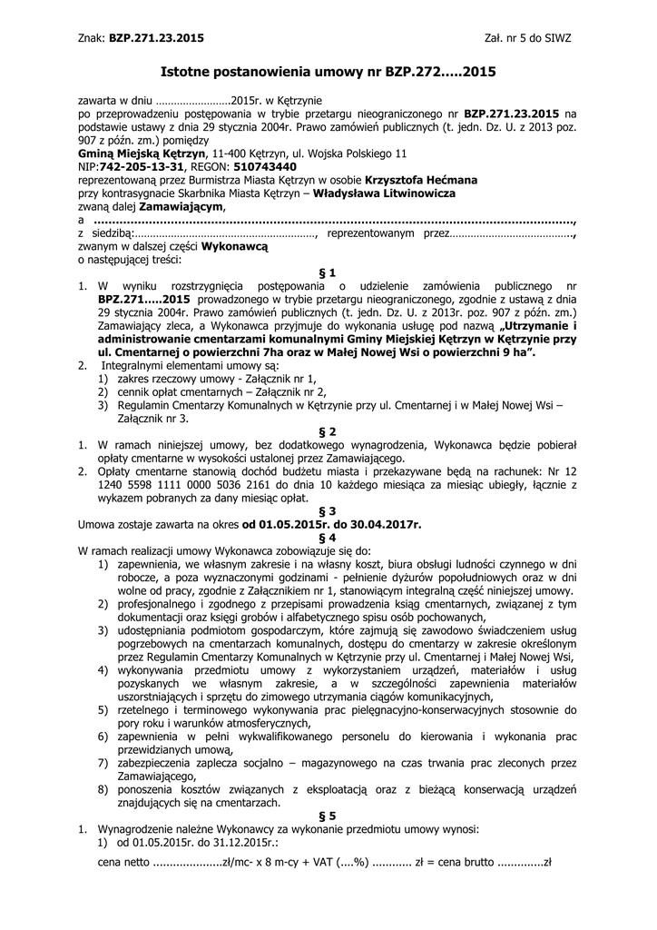 Znak: BZP.271.23.2015 Zał. nr 5 do SIWZ Istotne postanowienia umowy nr BZP.272…..2015 zawarta w dniu …………………….2015r. w Kętrzynie po przeprowadzeniu postępowania w trybie przetargu nieograniczonego nr BZP.271.23.2015 na podstawie ustawy z dnia 29 stycznia 2004r. Prawo zamówień publicznych (t. jedn. Dz. U. z 2013 poz. 907 z późn. zm.) pomiędzy Gminą Miejską Kętrzyn, 11-400 Kętrzyn, ul. Wojska Polskiego 11 NIP:742-205-13-31, REGON: 510743440 reprezentowaną przez Burmistrza Miasta Kętrzyn w osobie Krzysztofa Hećmana przy kontrasygnacie Skarbnika Miasta Kętrzyn – Władysława Litwinowicza zwaną dalej Zamawiającym, a …………………………………………………………………………………………………………….……., z siedzibą:……………………………………………………, reprezentowanym przez………………………………….., zwanym w dalszej części Wykonawcą o następującej treści: §1 1. W wyniku rozstrzygnięcia postępowania o udzielenie zamówienia publicznego nr BPZ.271…..2015 prowadzonego w trybie przetargu nieograniczonego, zgodnie z ustawą z dnia 29 stycznia 2004r. Prawo zamówień publicznych (t. jedn. Dz. U. z 2013r. poz. 907 z późn. zm.) Zamawiający zleca, a Wykonawca przyjmuje do wykonania usługę pod nazwą „Utrzymanie i administrowanie cmentarzami komunalnymi Gminy Miejskiej Kętrzyn w Kętrzynie przy ul. Cmentarnej o powierzchni 7ha oraz w Małej Nowej Wsi o powierzchni 9 ha”. 2. Integralnymi elementami umowy są: 1) zakres rzeczowy umowy - Załącznik nr 1, 2) cennik opłat cmentarnych – Załącznik nr 2, 3) Regulamin Cmentarzy Komunalnych w Kętrzynie przy ul. Cmentarnej i w Małej Nowej Wsi – Załącznik nr 3. §2 1. W ramach niniejszej umowy, bez dodatkowego wynagrodzenia, Wykonawca będzie pobierał opłaty cmentarne w wysokości ustalonej przez Zamawiającego. 2. Opłaty cmentarne stanowią dochód budŜetu miasta i przekazywane będą na rachunek: Nr 12 1240 5598 1111 0000 5036 2161 do dnia 10 kaŜdego miesiąca za miesiąc ubiegły, łącznie z wykazem pobranych za dany miesiąc opłat. §3 Umowa zostaje zawarta na okres od 01.05.2015r. do 30.04.2017r. §4 W ramach realizacji umowy Wykonawca zobowiązuje się do: 1) zapewnienia, we własnym zakresie i na własny koszt, biura obsługi ludności czynnego w dni robocze, a poza wyznaczonymi godzinami - pełnienie dyŜurów popołudniowych oraz w dni wolne od pracy, zgodnie z Załącznikiem nr 1, stanowiącym integralną część niniejszej umowy. 2) profesjonalnego i zgodnego z przepisami prowadzenia ksiąg cmentarnych, związanej z tym dokumentacji oraz księgi grobów i alfabetycznego spisu osób pochowanych, 3) udostępniania podmiotom gospodarczym, które zajmują się zawodowo świadczeniem usług pogrzebowych na cmentarzach komunalnych, dostępu do cmentarzy w zakresie określonym przez Regulamin Cmentarzy Komunalnych w Kętrzynie przy ul. Cmentarnej i Małej Nowej Wsi, 4) wykonywania przedmiotu umowy z wykorzystaniem urządzeń, materiałów i usług pozyskanych we własnym zakresie, a w szczególności zapewnienia materiałów uszorstniających i sprzętu do zimowego utrzymania ciągów komunikacyjnych, 5) rzetelnego i terminowego wykonywania prac pielęgnacyjno-konserwacyjnych stosownie do pory roku i warunków atmosferycznych, 6) zapewnienia w pełni wykwalifikowanego personelu do kierowania i wykonania prac przewidzianych umową, 7) zabezpieczenia zaplecza socjalno – magazynowego na czas trwania prac zleconych przez Zamawiającego, 8) ponoszenia kosztów związanych z eksploatacją oraz z bieŜącą konserwacją urządzeń znajdujących się na cmentarzach. §5 1. Wynagrodzenie naleŜne Wykonawcy za wykonanie przedmiotu umowy wynosi: 1) od 01.05.2015r. do 31.12.2015r.: cena netto .....................zł/mc- x 8 m-cy + VAT (....%) ............ zł = cena brutto ..............zł 2) od 01.01.2016r. do 30.04.2017r.: cena netto …...............zł/m-c x ……. 16 m-cy + VAT (....%) ............ zł = cena brutto ..............zł 2. Łączna wartość wynagrodzenia w całym okresie obowiązywania umowy, z zastrzeŜeniem § 5 ust. 1 umowy: ……………………………..(słownie……………………………………………………………………………….). 3. Wynagrodzenie rozliczane będzie fakturami przejściowymi w okresach miesięcznych, wystawionymi na podstawie protokołu odbioru prac, podpisanego przez strony tj. Wykonawcę i Zamawiającego. 4. Faktury VAT za wykonane prace płatne będą przelewem na rachunek Wykonawcy nr ..............................................................., w banku ……………....................................., w terminie ……….. dni od dnia otrzymania prawidłowo wystawionej faktury, przy czym za datę zapłaty przyjmuje się datę złoŜenia przez Zamawiającego przelewu w banku na konto Wykonawcy. §6 1. Zamawiający ma prawo kontrolować prawidłowość i terminowość wykonywania prac w dowolnym czasie, spisując protokół z przeprowadzonej kontroli, który będzie podstawą do egzekwowania kar umownych. 2. Ze strony Zamawiającego do nadzoru nad realizacją zadania uprawniona jest ………………..…….., tel. 89 752-05-…………………. 3. Ze strony Wykonawcy do uczestnictwa w kontrolach prawidłowości i terminowość wykonywania prac oraz odbiorach robót uprawnionymi są: ............................................, tel.............................................. 4. Wykonawca jest zobowiązany do bezzwłocznego usunięcia wszelkich nieprawidłowości i niedociągnięć stwierdzonych przez zamawiającego i osoby przez niego wskazane. §7 1. Za niewykonanie albo nienaleŜyte lub nieterminowe wykonanie zobowiązań wynikających z niniejszej Umowy, strony ustalają kary umowne. 2. Wykonawca jest zobowiązany zapłacić Zamawiającemu karę umowną w następujących przypadkach: 1) za nieterminowe bądź nienale