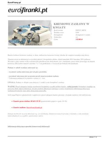 EuroFirany.pl KREMOWE ZASŁONY W KWIATY Kod towaru: Średnia ocen: Dostępność: Jednostka: Cena: DZ015_MCD 0.00 dostępność 4 sztuki szt. 115.00 zł Bardzo kobiece kremowe zasłony w duże, turkusowo-lazurowe kwiaty idealne do wnętrza romantycznej duszy. Tkanina użyta na dekorację to wysokiej jakości, hiszpańskie płótno, skład materiału 50% bawełna, 50% polieser. Wycięte u góry zasłon oczka wykończono plastikowymi obrączkami, tzw. remizkami, przez które przeciąga się drążek karnisza. Dół zasłon stanowi szerokie 7 x 7 cm podłożenie z wszytymi po bokach obciążnikami. Podane w tabeli wymiary mierzone są: - wysokość zasłon mierzona jest od góry przelotki, - szerokość mierzona jest na prosto przed zmarszczeniem zasłony. * Tolerancja podanych wymiarów wynosi +/- 1cm. UWAGA. Podana w sklepie cena dotyczy 1 sztuki (a nie kompletu!) zasłony. WAŻNE. Przed zakupem istnieje możliwość bezpłatnej wysyłki próbek tkanin - zadaj pytanie (formularz znajduje się powyżej obok zdjęcia dekoracji, tuż przy kodzie dekoracji) wpisując w treści wiadomości informację dotyczącą wybranych kolorów oraz adres doręczenia przesyłki. Jeśli mają Państwo jakiekolwiek wątpliwości przed zakupem bardzo prosimy o kontakt mailowy lub telefoniczny. Zamów przez telefon: 85 651 35 35 (poniedziałek-piątek w godz.10-18) Zamów mailem: [email protected] Istnieje możliwość uszycia dekoracji wg. życzeń klienta. Zainteresowanych prosimy o kontakt w celu ustalenia indywidualnych szczegółów zamówienia i oferty. Informacja dotycząca sposobu konserwacji dekoracji: strona 1 / 2 EuroFirany.pl UWAGA. Dozując proszek do prania należy zwracać uwagę na zalecane ilości, zgodnie ze stopniami zabrudzenia tekstyliów. Informację dotyczącą zalecanych ilości można znaleźć na każdym opakowaniu proszku do prania. strona 2 / 2 Powered by TCPDF (www.tcpdf.org)