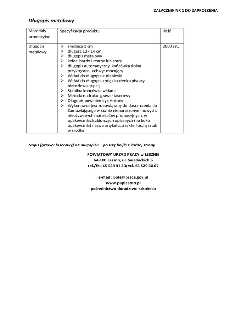 ZAŁĄCZNIK NR 1 DO ZAPROSZENIA Długopis metalowy Materiały promocyjne Specyfikacja produktu Ilość Długopis metalowy 2000 szt. średnica 1 cm długość 13 - 14 cm długopis metalowy kolor: bordo i czarny lub szary długopis automatyczny, końcówka dolna przykręcana, uchwyt mocujący Wkład do długopisu: niebieski Wkład do długopisu miękko cienko piszący, nierozlewający się Stabilna końcówka wkładu Metoda nadruku: grawer laserowy Długopis powinien być złożony Wykonawca jest zobowiązany do dostarczenia do Zamawiającego w stanie nienaruszonym nowych, nieużywanych materiałów promocyjnych, w opakowaniach zbiorczych opisanych (na boku opakowania) nazwa artykułu, a także ilością sztuk w środku Napis (grawer laserowy) na długopisie - po trzy linijki z każdej strony POWIATOWY URZĄD PRACY w LESZNIE 64-100 Leszno, ul. Śniadeckich 5 tel./fax 65 529 94 33; tel. 65 529 50 67 e-mail : [email protected] www.pupleszno.pl pośrednictwo-doradztwo-szkolenia Długopis plastikowy Materiały promocyjne Specyfikacja produktu Ilość Długopis 10.000 szt. średnica 1 cm długość 14 cm plastik, guma kolor: biało-bordowy 5.000 szt., biało-czarny 5.000 szt. długopis automatyczny wkład do długopisu: niebieski miękko piszący napis na długopisie – wg wzoru podanego przez Zamawiającego Wykonawca jest zobowiązany do dostarczenia do Zamawiającego w stanie nienaruszonym nowych, nieużywanych materiałów promocyjnych, w opakowaniach zbiorczych opisanych (na boku opakowania) nazwa artykułu, jego zdjęciem, a także ilością sztuk w środku Napis (grawer laserowy) na długopisie - po trzy linijki z każdej strony POWIATOWY URZĄD PRACY w LESZNIE 64-100 Leszno, ul. Śniadeckich 5 tel./fax 65 529 94 33; tel. 65 529 50 67 e-mail : [email protected] www.pupleszno.pl pośrednictwo-doradztwo-szkolenia (kolor długopisu: bordowy 5.000 szt., biało-czarny 5.000 szt.) Teczka z gumką Materiały promocyjne Specyfikacja produktu Ilość Teczka z gumką 1200 sztuk teczka na dokumenty A4; wymiar teczki: 320x235(wysokość x szerokość) Teczka wykonana z barwionego i foliowanego z jednej strony kartonu o gramaturze 400g/m² Trzy zakładki chroniące dokument przed wypadnięciem Grzbiet teczki z możliwością regulowanej grubości (pozwoli zmieścić przynajmniej 100 kartek) Teczka zamykana na gumkę, która przebiega wzdłuż teczki z prawej strony; szerokość gumki: 7mm, gumka płaska, kolor gumki w odcieniu teczki Teczki pakowane po 50 szt., złożone Wykonawca jest zobowiązany do dostarczenia do Zamawiającego w stanie nienaruszonym nowych, nieużywanych materiałów promocyjnych, w opakowaniach zbiorczych opisanych (na boku opakowania) nazwa artykułu, a także ilością sztuk w środku Informacje zawarte na przedniej okładce teczki: Powiatowy Urząd Pracy w Lesznie Informacje zawarte na tylnej okładce teczki: POŚREDNICTWO PRACY USŁUGI EURES SZKOLENIA DORADZTWO ZAWODOWE DOSTĘP DO INTERNETU KLUB PRACY PRACE INTERWENCYJNE ROBOTY PUBLICZNE STAŻE ŚRODKI NA PODJĘCIE DZIAŁALNOŚCI GOSPODARCZEJ WYPOSAŻENIE LUB DOPOSAŻENIE STANOWISKA PRACY REJESTRACJA I EWIDENCJA POWIATOWY URZĄD PRACY W LESZNIE UL. ŚNIADECKICH 5 64 – 100 LESZNO tel./fax 65 529 94 33; tel. 65 529 50 67 e-mail: [email protected] www.pupleszno.pl tel. 65 529 81 89 tel. 65 529 94 33 lub 65 529 50 67 tel. 65 520 20 58 tel. 65 529 81 88 tel. 65 529 81 87 Kalendarz książkowy B5 Materiały promocyjne Specyfikacja produktu Ilość Kalendarz książkowy B5 na rok 2014 150 szt. kalendarz książkowy (2014 r.) format: B5 ilość stron: 368/ 1 dzień= 1 strona kalendarium: PL-GB-D-RUS + imieniny sobota i niedziela na jednej stronie druk: 2-kolorowy; czarno-bordowy druk offsetowy wysokiej jakości papier: 70mg/m2, bez chlorowy, biały Wykonawca jest zobowiązany do dostarczenia do Zamawiającego w stanie nienaruszonym nowych, nieużywanych materiałów promocyjnych, w opakowaniach zbiorczych opisanych (na boku opakowania) nazwa artykułu, a także ilością sztuk w środku Zamawiający prosi o przedstawienie 5 propozycji okładki dla kalendarza książkowego. Treść nadruku: Okładka przód Okładka tył Kalendarz ścienny trójdzielny Materiały promocyjne Specyfikacja produktu Ilość Kalendarz trójdzielny ścienny 2014 200 szt. główka wymiary ok. 34 cm x 21 cm na tekturze o grubości ok. 2 mm + folia połysk, podkład pełen kolor + lakier offsetowy, główka kaszerowana (wypukła) kalendarium duże cyfry, w trzech blokach, język polski, imieniny, zadruk 3 kolory (czarny, szary, czerwony) góra z otworem lub zawieszką do powieszania na ścianie kalendarz powinien zawierać pasek z czerwonym oczkiem wskazującym aktualną datę, opakowanie: koperta biała kalendarze przy dostawie powinny być oddzielenie zapakowane w białe koperty Wykonawca jest zobowiązany do dostarczenia do Zamawiającego w stanie nienaruszonym nowych, nieużywanych materiałów promocyjnych, w opakowaniach zbiorczych opisanych (na boku opakowania) nazwa artykułu, a także ilością sztuk w środku Informacje zawarte na kalendarzu trójdzielnym ściennym: Powiatowy Urząd Pracy w Lesznie ul. Śniadeckich 5 64 – 100 Leszno Tel: 65 529 50 67 Tel/fax: 65 529 94 33 www.pupleszno.pl e-mail: [email protected] POŚREDNICTWO PRACY USŁUGI EURES SZKOLENIA DORADZTWO ZAWODOWE DOSTĘP DO INTERNETU KLUB PRACY PRACE INTERWENCYJNE ROBOTY PUBLICZNE STAŻE ŚRODKI NA PODJĘCIE DZIAŁALNOŚCI GOSPODARCZEJ WYPOSAŻENIE LUB DOPOSAŻENIE STANOWISKA PRACY REJESTRACJA I EWIDENCJA tel. 65 529 81 89 tel. 65 529 94 33 lub 65 529 50 67 tel. 65 520 20 58 tel. 65 529 81 88 tel. 65 529 81 87 Kalendarzyk listkowy Materiały promocyjne Specyfikacja produktu Ilość Kalendarzyk listkowy na rok 2014 5.000 sztuk format karty kredytowej 80x55 mm druk: 4x4 kreda matowa bezchlorkowa 350 g lakier UV błysk dwustronnie sztancowanie – zaokrąglone naroża, nadruk na jednej ze stron zaprojektowany przez Wykonawcę zgodnie z informacjami podanymi poniżej, na odwrotnej stron