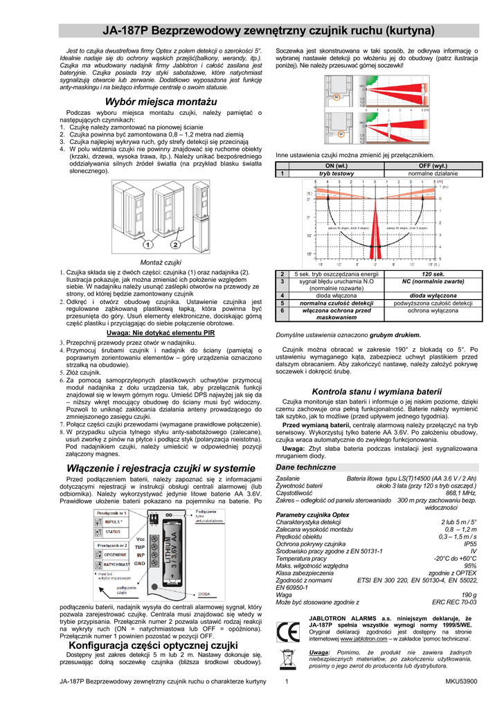 JA-187P Bezprzewodowy zewnętrzny czujnik ruchu (kurtyna) Jest to czujka dwustrefowa firmy Optex z polem detekcji o szerokości 5°. Idealnie nadaje się do ochrony wąskich przejść(balkony, werandy, itp.). Czujka ma wbudowany nadajnik firmy Jablotron i całość zasilana jest bateryjnie. Czujka posiada trzy styki sabotażowe, które natychmiast sygnalizują otwarcie lub zerwanie. Dodatkowo wyposażona jest funkcję anty-maskingu i na bieżąco informuje centralę o swoim statusie. Soczewka jest skonstruowana w taki sposób, że odkrywa informację o wybranej nastawie detekcji po włożeniu jej do obudowy (patrz ilustracja poniżej). Nie należy przesuwać górnej soczewki! Wybór miejsca montażu Podczas wyboru miejsca montażu czujki, należy pamiętać o następujących czynnikach: 1. Czujkę należy zamontować na pionowej ścianie 2. Czujka powinna być zamontowana 0,8 – 1,2 metra nad ziemią 3. Czujka najlepiej wykrywa ruch, gdy strefy detekcji się przecinają 4. W polu widzenia czujki nie powinny znajdować się ruchome obiekty (krzaki, drzewa, wysoka trawa, itp.). Należy unikać bezpośredniego oddziaływania silnych źródeł światła (na przykład blasku światła słonecznego). Inne ustawienia czujki można zmienić jej przełącznikiem. 1 ON (wł.) tryb testowy OFF (wył.) normalne działanie 5 sek. tryb oszczędzania energii sygnał błędu uruchamia N.O (normalnie rozwarte) dioda włączona normalna czułość detekcji włączona ochrona przed maskowaniem 120 sek. NC (normalnie zwarte) Montaż czujki Czujka składa się z dwóch części: czujnika (1) oraz nadajnika (2). Ilustracja pokazuje, jak można zmieniać ich położenie względem siebie. W nadajniku należy usunąć zaślepki otworów na przewody ze strony, od której będzie zamontowany czujnik Odkręć i otwórz obudowę czujnika. Ustawienie czujnika jest regulowane ząbkowaną plastikową łapką, która powinna być przesunięta do góry. Usuń elementy elektroniczne, dociskając górną część plastiku i przyciągając do siebie połączenie obrotowe. Uwaga: Nie dotykać elementu PIR Przepchnij przewody przez otwór w nadajniku. Przymocuj śrubami czujnik i nadajnik do ściany (pamiętaj o poprawnym zorientowaniu elementów – górę urządzenia oznaczono strzałką na obudowie). Złóż czujnik. Za pomocą samoprzylepnych plastikowych uchwytów przymocuj moduł nadajnika z dołu urządzenia tak, aby przełącznik funkcji znajdował się w lewym górnym rogu. Umieść DPS najwyżej jak się da – niższy wkręt mocujący obudowę do ściany musi być widoczny. Pozwoli to uniknąć zakłócania działania anteny prowadzącego do zmniejszonego zasięgu czujki. Połącz części czujki przewodami (wymagane prawidłowe połączenie). W przypadku użycia tylnego styku anty-sabotażowego (zalecane), usuń zworkę z pinów na płytce i podłącz styk (polaryzacja nieistotna). Pod nadajnikiem czujki, należy umieścić w odpowiedniej pozycji załączony magnes. Włączenie i rejestracja czujki w systemie Przed podłączeniem baterii, należy zapoznać się z informacjami dotyczącymi rejestracji w instrukcji obsługi centrali alarmowej (lub odbiornika). Należy wykorzystywać jedynie litowe baterie AA 3.6V. Prawidłowe ułożenie baterii pokazano na pojemniku na baterie. Po podłączeniu baterii, nadajnik wysyła do centrali alarmowej sygnał, który pozwala zarejestrować czujkę. Centrala musi znajdować się wtedy w trybie przypisania. Przełącznik numer 2 pozwala ustawić rodzaj reakcji na wykryty ruch (ON = natychmiastowa lub OFF = opóźniona). Przełącznik numer 1 powinien pozostać w pozycji OFF. 2 3 4 5 6 Domyślne ustawienia oznaczono grubym drukiem. Czujnik można obracać w zakresie 190° z blokadą co 5°. Po ustawieniu wymaganego kąta, zabezpiecz uchwyt plastikiem przed dalszym obracaniem. Aby zakończyć nastawę, należy założyć pokrywę soczewek i dokręcić śrubę. Kontrola stanu i wymiana baterii Czujka monitoruje stan baterii i informuje o jej niskim poziome, dzięki czemu zachowuje ona pełną funkcjonalność. Baterie należy wymienić tak szybko, jak to możliwe (przed upływem jednego tygodnia). Przed wymianą baterii, centralę alarmową należy przełączyć na tryb serwisowy. Wykorzystuj tylko baterie AA 3.6V. Po założeniu obudowy, czujka wraca automatycznie do zwykłego funkcjonowania. Uwaga: Zbyt słaba bateria podczas instalacji jest sygnalizowana mruganiem diody. Dane techniczne Zasilanie Bateria litowa typu LS(T)14500 (AA 3.6 V / 2 Ah) Żywotność baterii około 3 lata (przy 120 s tryb oszczęd.) Częstotliwość 868,1 MHz, Zakres – odległość od panelu sterowaniado 300 m przy zachowaniu bezp. widoczności Parametry czujnika Optex Charakterystyka detekcji 2 lub 5 m / 5° Zalecana wysokość montażu 0,8 – 1,2 m Prędkość obiektu 0,3 – 1,5 m / s Ochrona pokrywy czujnika IP55 Środowisko pracy zgodne z EN 50131-1 IV Temperatura pracy -20°C do +60°C Maks. wilgotność względna 95% Klasa zabezpieczenia zgodnie z OPTEX Zgodność z normami ETSI EN 300 220, EN 50130-4, EN 55022, EN 60950-1 Waga 190 g Może być stosowane zgodnie z ERC REC 70-03 JABLOTRON ALARMS a.s. niniejszym deklaruje, że JA-187P spełnia wszystkie wymogi normy 1999/5/WE. Oryginał deklaracji zgodności jest dostępny na stronie internetowej www.jablotron.com – w zakładce ‘pomoc techniczna’. Konfiguracja części optycznej czujki Uwaga: Pomimo, że produkt nie zawiera żadnych niebezpiecznych materiałów, po zakończeniu użytkowania, prosimy o jego zwrot do producenta lub dystrybutora. Dostępny jest zakres detekcji 5 m lub 2 m. Nastawy dokonuje się, przesuwając dolną soczewkę czujnika (bliższa środkowi obudowy). JA-187P Bezprzewodowy zewnętrzny czujnik ruchu o charakterze kurtyny dioda wyłączona podwyższona czułość detekcji ochrona wyłączona 1 MKU53900 JA-187P Bezprzewodowy zewnętrzny czujnik ruchu (kurtyna) JA-187P Bezprzewodowy zewnętrzny czujnik ruchu o charakt