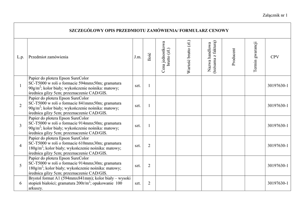 Załącznik nr 1 1 2 3 4 5 6 Papier do plotera Epson SureColor SC-T5000 w roli o formacie 594mmx50m; gramatura 90g/m2; kolor biały; wykończenie nośnika: matowy; średnica gilzy 5cm; przeznaczenie CAD/GIS. Papier do plotera Epson SureColor SC-T5000 w roli o formacie 841mmx50m; gramatura 90g/m2; kolor biały; wykończenie nośnika: matowy; średnica gilzy 5cm; przeznaczenie CAD/GIS. Papier do plotera Epson SureColor SC-T5000 w roli o formacie 914mmx50m; gramatura 90g/m2; kolor biały; wykończenie nośnika: matowy; średnica gilzy 5cm; przeznaczenie CAD/GIS. Papier do plotera Epson SureColor SC-T5000 w roli o formacie 610mmx30m; gramatura 180g/m2; kolor biały; wykończenie nośnika: matowy; średnica gilzy 5cm; przeznaczenie CAD/GIS. Papier do plotera Epson SureColor SC-T5000 w roli o formacie 914mmx30m; gramatura 180g/m2; kolor biały; wykończenie nośnika: matowy; średnica gilzy 5cm; przeznaczenie CAD/GIS. Brystol format A1 (594mmx841mm); kolor biały – wysoki stopień białości; gramatura 200r/m2; opakowanie 100 arkuszy. Termin gwarancji Producent Nazwa handlowa (tożsama z fakturą) Wartość brutto (zł.) Przedmiot zamówienia J.m. Ilość L.p. Cena jednostkowa brutto (zł.) SZCZEGÓŁOWY OPIS PRZEDMIOTU ZAMÓWIENIA/ FORMULARZ CENOWY szt. 1 30197630-1 szt. 1 30197630-1 szt. 1 30197630-1 szt. 2 30197630-1 szt. 2 30197630-1 szt. 2 30197630-1 CPV Załącznik nr 1 7 Brystol format A0 (841mmx1189mm); kolor biały – wysoki stopień białości; gramatura 200r/m2; opakowanie 100 arkuszy. szt. 1 30197630-1 8 Wkład atramentowy EPSON BK UltraChrome XD T6941; pojemność 700ml; kolor czarny fotograficzny. szt. 1 30192113-6 9 Wkład atramentowy EPSON C UltraChrome XD T6942; pojemność 700ml; kolor błękitny. szt. 1 30192113-6 10 Wkład atramentowy EPSON M UltraChrome XD T6943; pojemność 700ml; kolor purpurowy. szt. 1 30192113-6 11 Wkład atramentowy EPSON Y UltraChrome XD T6944; pojemność 700ml; kolor żółty. szt. 1 30192113-6 12 Wkład atramentowy EPSON MK UltraChrome XD T6945; szt. pojemność 700ml; kolor czarny matowy. 1 30192113-6 RAZEM