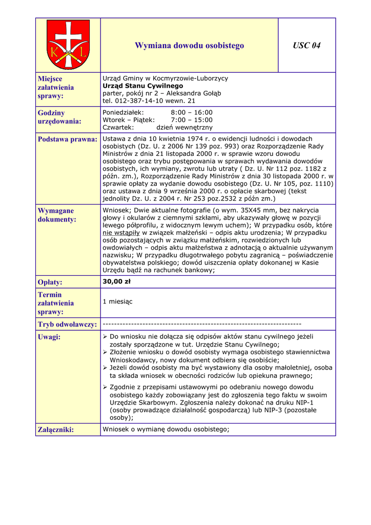 Wymiana dowodu osobistego Miejsce załatwienia sprawy: Urząd Gminy w Kocmyrzowie-Luborzycy Urząd Stanu Cywilnego parter, pokój nr 2 – Aleksandra Gołąb tel. 012-387-14-10 wewn. 21 Godziny urzędowania: Poniedziałek: 8:00 – 16:00 Wtorek – Piątek: 7:00 – 15:00 Czwartek: dzień wewnętrzny USC 04 Podstawa prawna: Ustawa z dnia 10 kwietnia 1974 r. o ewidencji ludności i dowodach osobistych (Dz. U. z 2006 Nr 139 poz. 993) oraz Rozporządzenie Rady Ministrów z dnia 21 listopada 2000 r. w sprawie wzoru dowodu osobistego oraz trybu postępowania w sprawach wydawania dowodów osobistych, ich wymiany, zwrotu lub utraty ( Dz. U. Nr 112 poz. 1182 z późn. zm.), Rozporządzenie Rady Ministrów z dnia 30 listopada 2000 r. w sprawie opłaty za wydanie dowodu osobistego (Dz. U. Nr 105, poz. 1110) oraz ustawa z dnia 9 września 2000 r. o opłacie skarbowej (tekst jednolity Dz. U. z 2004 r. Nr 253 poz.2532 z późn zm.) Wymagane dokumenty: Wniosek; Dwie aktualne fotografie (o wym. 35X45 mm, bez nakrycia głowy i okularów z ciemnymi szkłami, aby ukazywały głowę w pozycji lewego półprofilu, z widocznym lewym uchem); W przypadku osób, które nie wstąpiły w związek małŜeński – odpis aktu urodzenia; W przypadku osób pozostających w związku małŜeńskim, rozwiedzionych lub owdowiałych – odpis aktu małŜeństwa z adnotacją o aktualnie uŜywanym nazwisku; W przypadku długotrwałego pobytu zagranicą – poświadczenie obywatelstwa polskiego; dowód uiszczenia opłaty dokonanej w Kasie Urzędu bądź na rachunek bankowy; Opłaty: 30,00 zł Termin załatwienia sprawy: 1 miesiąc Tryb odwoławczy: ---------------------------------------------------------------------Uwagi: ➢ Do wniosku nie dołącza się odpisów aktów stanu cywilnego jeŜeli zostały sporządzone w tut. Urzędzie Stanu Cywilnego; ➢ ZłoŜenie wniosku o dowód osobisty wymaga osobistego stawiennictwa Wnioskodawcy, nowy dokument odbiera się osobiście; ➢ JeŜeli dowód osobisty ma być wystawiony dla osoby małoletniej, osoba ta składa wniosek w obecności rodziców lub opiekuna prawnego; ➢ Zgodnie z przepisami ustawowymi po odebraniu nowego dowodu osobistego kaŜdy zobowiązany jest do zgłoszenia tego faktu w swoim Urzędzie Skarbowym. Zgłoszenia naleŜy dokonać na druku NIP-1 (osoby prowadzące działalność gospodarczą) lub NIP-3 (pozostałe osoby); Załączniki: Wniosek o wymianę dowodu osobistego;
