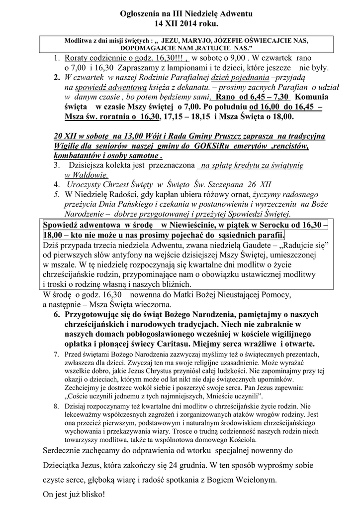 Ogłoszenia na III Niedzielę Adwentu 14 XII 2014