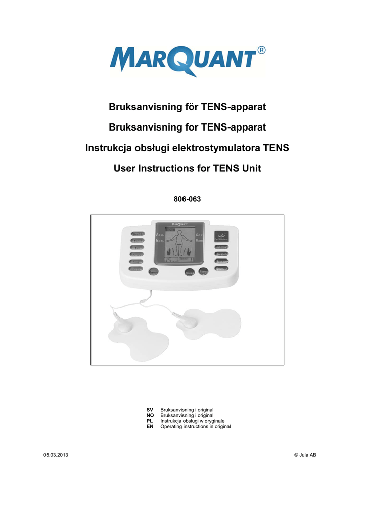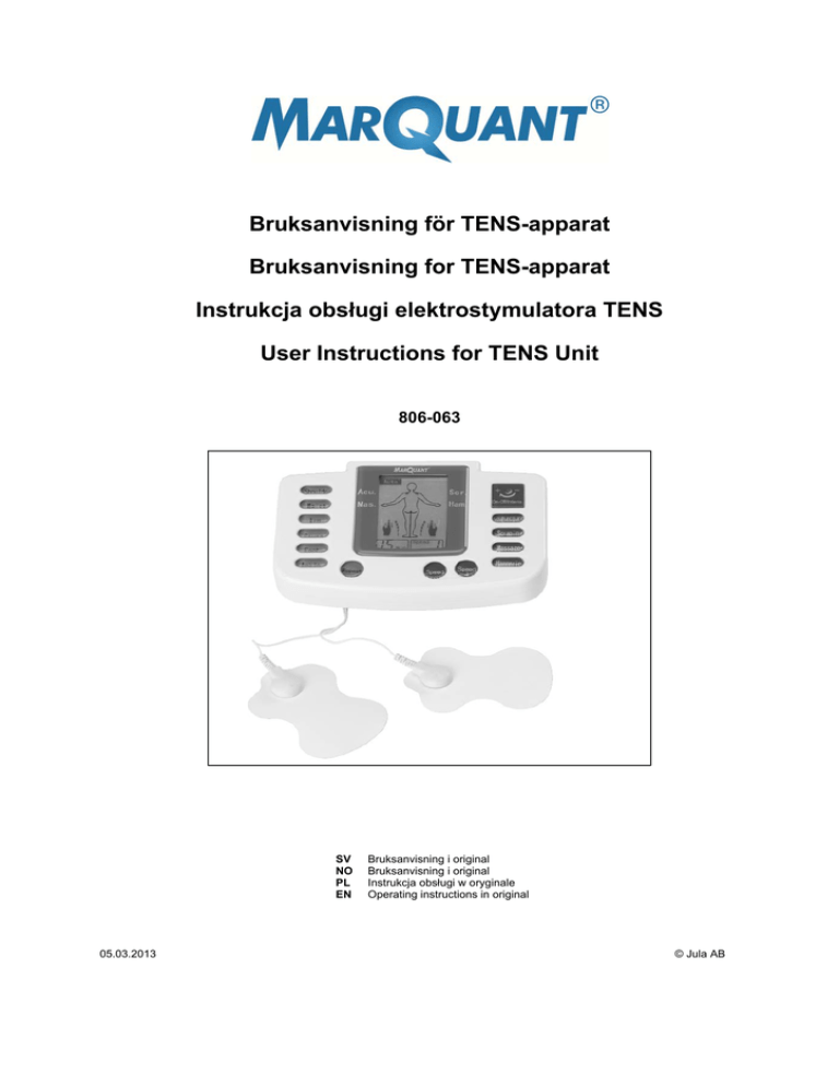 Bruksanvisning för TENS-apparat Bruksanvisning for TENS-apparat Instrukcja obsługi elektrostymulatora TENS User Instructions for TENS Unit 806-063 SV NO PL EN 05.03.2013 Bruksanvisning i original Bruksanvisning i original Instrukcja obsługi w oryginale Operating instructions in original © Jula AB SVENSKA 4 SÄKERHETSANVISNINGAR ....................................................................................................................... 4 TEKNISKA DATA ......................................................................................................................................... 5 BESKRIVNING ............................................................................................................................................. 5 Funktion ............................................................................................................................................... 5 Delar .................................................................................................................................................... 6 HANDHAVANDE .......................................................................................................................................... 6 Förberedelser....................................................................................................................................... 6 Ställ in önskat läge ............................................................................................................................... 6 Start ..................................................................................................................................................... 6 Användning .......................................................................................................................................... 6 Elektrodplacering vid vanliga besvär ................................................................................................... 7 Tillsats för fotmassage ......................................................................................................................... 7 UNDERHÅLL ................................................................................................................................................ 7 Rengöring ............................................................................................................................................ 7 NORSK 8 SIKKERHETSANVISNINGER ...................................................................................................................... 8 TEKNISKE DATA ......................................................................................................................................... 9 BESKRIVELSE ............................................................................................................................................. 9 Funksjon .............................................................................................................................................. 9 Deler .................................................................................................................................................. 10 BRUK .......................................................................................................................................................... 10 Forberedelser..................................................................................................................................... 10 Velg program ..................................................................................................................................... 10 Start ................................................................................................................................................... 10 Bruk .................................................................................................................................................... 10 Elektrodeplassering ved vanlige plager ............................................................................................. 11 Tilleggsutstyr for fotmassasje ............................................................................................................ 11 VEDLIKEHOLD .......................................................................................................................................... 11 Rengjøring ......................................................................................................................................... 11 POLSKI 12 ZASADY BEZPIECZEŃSTWA ................................................................................................................... 12 DANE TECHNICZNE ................................................................................................................................. 13 OPIS ........................................................................................................................................................... 13 Działanie ............................................................................................................................................ 13 Części ................................................................................................................................................ 14 OBSŁUGA .................................................................................................................................................. 14 Przygotowania ................................................................................................................................... 14 Ustawianie żądanego trybu ............................................................................................................... 15 Uruchamianie ..................................................................................................................................... 15 Sposób użycia........................