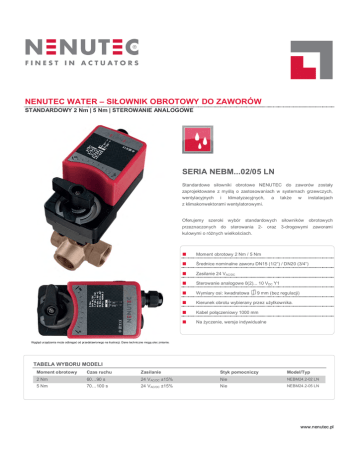 NENUTEC WATER – SIŁOWNIK OBROTOWY DO ZAWORÓW STANDARDOWY 2 Nm | 5 Nm | STEROWANIE ANALOGOWE SERIA NEBM...02/05 LN Standardowe siłowniki obrotowe NENUTEC do zaworów zostały zaprojektowane z myślą o zastosowaniach w systemach grzewczych, wentylacyjnych i klimatyzacyjnych, z klimakonwektorami wentylatorowymi. Oferujemy szeroki wybór a standardowych przeznaczonych do sterowania kulowymi o różnych wielkościach. 2- oraz także w instalacjach siłowników obrotowych 3-drogowymi ■ ■ ■ ■ ■ Moment obrotowy 2 Nm / 5 Nm ■ ■ ■ Kierunek obrotu wybierany przez użytkownika. zaworami Średnice nominalne zaworu DN15 (1/2“) / DN20 (3/4“) Zasilanie 24 VAC/DC Sterowanie analogowe 0(2)... 10 VDC Y1 Wymiary osi: kwadratowa 9 mm (bez regulacji) Kabel połączeniowy 1000 mm Na życzenie, wersje indywidualne Wygląd urządzenia może odbiegać od przedstawionego na ilustracji. Dane techniczne mogą ulec zmianie. TABELA WYBORU MODELI Moment obrotowy Czas ruchu Zasilanie Styk pomocniczy Model/Typ 2 Nm 60…90 s 24 VAC/DC ±15% Nie NEBM24.2-02 LN 5 Nm 70…100 s 24 VAC/DC ±15% Nie NEBM24.2-05 LN www.nenutec.pl NENUTEC WATER – SIŁOWNIK OBROTOWY DO ZAWORÓW STANDARDOWY 2 Nm | 5 Nm | STEROWANIE ANALOGOWE WYMIARY SIŁOWNIKA [mm] DANE TECHNICZNE NEBM24.2... Moment obrotowy 2 Nm / 5 Nm Średnice nominalne zaworu DN15 (1/2“) / DN20 (3/4“) Wymiary osi Przekrój kwadratowy (bez regulacji) Zasilanie 24 V AC / 24 V DC ± 15% Częstotliwość 50 - 60 Hz Sygnał nastawczy (wejście) 0(2)…10 V DC Y1 Sygnał położenia (wyjście) 0…10 V DC μ 9 mm Pobór mocy – Praca 0,66 W / 0,95 VA – W pozycji krańcowej 1,1 W / 1,7 VA Moc znamionowa 9,8 W / 14 VA Klasa ochrony III Kąt obrotu maks. 90° (ograniczenie mechaniczne 95°) Ograniczenie kąta obrotu zderzak mechaniczny Masa < 0,8 kg Żywotność 60 000 obrotów Poziom hałasu - silnik / funkcja EFS 42 dB (A) Kategoria ochronna obudowy IP 54 (ochrona przed kurzem i zachlapaniem wodą) Zakres temperatur pracy -20 …+50 °C / IEC 721-3-3 Temperatura składowania -30 ...+ 80 °C / IEC 721-3-2 Wilgotność otoczenia 5…95% wilg. wzgl. (brak kondensacji) Konserwacja Bezobsługowy Zasada działania Typ 1 (wg EN 60730-1) Kompatybilność elektromagnetyczna CE zgodnie z 2004/108/EWG www.nenutec.pl NENUTEC WATER – SIŁOWNIK OBROTOWY DO ZAWORÓW STANDARDOWY 2 Nm | 5 Nm | STEROWANIE ANALOGOWE Schemat połączeń NEBM24.2… ■ Zmienianie kierunku obrotu siłownika NEBM24.2-... Zasilanie 24 VAC / DC Ustawienie fabryczne – obrót w lewo (CCW)! M czarny 1 czerwony szary 2 5 24 VAC ±15% pomarańczowy 6 Y1 U 24 VDC ±15% Kierunek obrotu można zmieniać przełącznikiem CW/CCW znajdującym się na obudowie siłownika. Siłowniki do zaworów kulowych muszą obracać się w lewo (CCW)! 0(2)…10 VDC 0…10 VDC Schemat połączeń NEBM24.2… ■ Uwaga Połączenie równoległe Urządzenie podrzędne czarny czerwony Urządzenie nadrzędne czarny czerwony szary pomarańczowy 0…10 VDC szary Gdy siłowniki NEBM… mają pracować równolegle (maks. 5 siłowników), sygnał wyjściowy U = 0…10 V (zacisk 6) siłownika nadrzędnego trzeba doprowadzić do zacisku 5 następnego siłownika podrzędnego, itd. Sprawdzić pobór a podrzędnym. mocy oraz odległość miedzy siłownikiem nadrzędnym pomarańczowy 0(2)…10 VDC 24 VAC ±10% 24 VDC ±10% www.nenutec.pl NENUTEC WATER – SIŁOWNIK OBROTOWY DO ZAWORÓW STANDARDOWY 2 Nm | 5 Nm | STEROWANIE ANALOGOWE Mieszający otwarty A = zamknięty B = otwarty C = otwarty Położenie siłownika Wymiennik ciepła Wymiennik ciepła Mieszający zamknięty A = zamknięty B = otwarty C = otwarty otwarty zamknięty Zawsze obrót w lewo (CCW)! 2-drogowy zamknięty 2-drogowy otwarty 3-drogowy zamknięty 3-drogowy otwarty WERSJA INDYWIDUALNA WAŻNE INFORMACJE Siłownik zawiera podzespoły elektryczne i elektroniczne. Dlatego nie wolno wyrzucać go wraz z odpadami domowymi. Zużyte/uszkodzone urządzenia trzeba przekazać do utylizacji zgodnie z obowiązującymi przepisami. 24 VAC/DC: Podłączać poprzez transformator bezpieczeństwa. 230 V AC: W celu odłączania zasilania sieciowego, instalacja musi zawierać element rozłączający przewód fazowy (odstęp styków minimum 3 mm). Na życzenie firma NENUTEC oferuje siłowniki w wersjach indywidualnych, np. z umieszczoną nazwą klienta, o określonej kolorystyce, itp. W celu uzyskania dokładniejszych informacji prosimy o kontakt z dystrybutorem. W celu uzyskania informacji o specyficznych wymaganiach oraz doborze materiałów, dotyczących zamierzonego zastosowania, prosimy skontaktować się z przedstawicielem firmy NENUTEC. Cała zawartość niniejszej karty katalogowej jest chroniona prawem autorskim. Wszelkie prawa zastrzeżone ©. Powyższe dane techniczne są nominalne i odpowiadają powszechnie uznanym standardom przemysłowym. Firma NENUTEC nie odpowiada za szkody wynikłe z niewłaściwego stosowania albo użytkowania swoich produktów. NENUTEC AG Nenutec Polska Schachenstrasse 80 CH - 8645 Jona/SG - Switzerland T: +41 55 224 40 60 F: +41 55 224 40 69 www.nenutec.com 00-213 Warszawa ul. Bonifraterska 14 tel.: +48-(0)-504-050225 [email protected] www.nenutec.pl