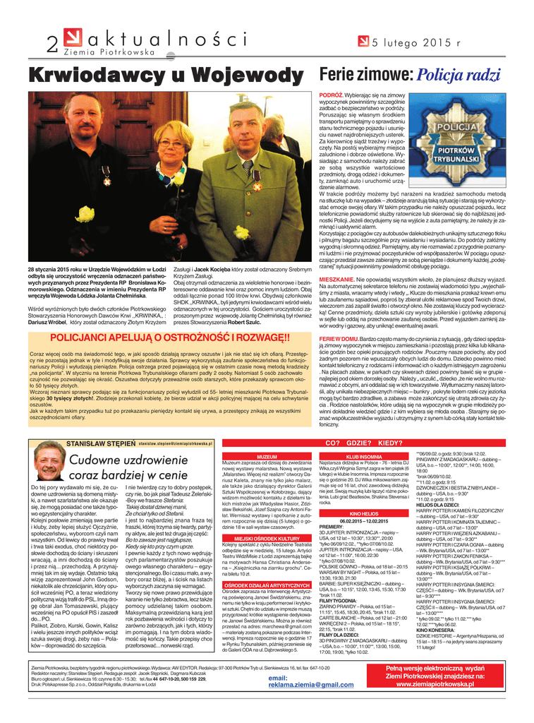 2 aktualności 5 lutego 2015 r Ziemia Piotrkowska Krwiodawcy u Wojewody Ferie zimowe: Policja radzi 28 stycznia 2015 roku w Urzędzie Wojewódzkim w Łodzi odbyła się uroczystość wręczenia odznaczeń państwowych przyznanych przez Prezydenta RP Bronisława Komorowskiego. Odznaczenia w imieniu Prezydenta RP wręczyła Wojewoda Łódzka Jolanta Chełmińska. Wśród wyróżnionych było dwóch członków Piotrkowskiego Stowarzyszenia Honorowych Dawców Krwi ,,KRWINKA,, : Dariusz Wróbel, który został odznaczony Złotym Krzyżem Zasługi i Jacek Kocięba który został odznaczony Srebrnym Krzyżem Zasługi. Obaj otrzymali odznaczenia za wieloletnie honorowe i bezinteresowne oddawanie krwi oraz pomoc innym ludziom. Obaj oddali łącznie ponad 100 litrów krwi. Obydwaj członkowie SHDK ,,KRWINKA,, byli jedynymi krwiodawcami wśród wielu odznaczonych w tej uroczystości. Gościem uroczystości zaproszonym przez wojewodę Jolantę Chełmińską był również prezes Stowarzyszenia Robert Szulc. POLICJANCI APELUJĄ O OSTROŻNOŚĆ I ROZWAGĘ!! Coraz więcej osób ma świadomość tego, w jaki sposób działają sprawcy oszustw i jak nie stać się ich ofiarą. Przestępcy nie pozostają jednak w tyle i modyfikują swoje działania. Sprawcy wykorzystują zaufanie społeczeństwa do funkcjonariuszy Policji i wyłudzają pieniądze. Policja ostrzega przed pojawiającą się w ostatnim czasie nową metodą kradzieży „na policjanta”. W styczniu na terenie Piotrkowa Trybunalskiego ofiarami padły 2 osoby. Natomiast 5 osób zachowało czujność nie pozwalając się okraść. Oszustwa dotyczyły przeważnie osób starszych, które przekazały sprawcom około 50 tysięcy złotych. Wczoraj nieznani sprawcy podając się za funkcjonariuszy policji wyłudzili od 55- letniej mieszkanki Piotrkowa Trybunalskiego 30 tysięcy złotych!. Złodzieje przekonali kobietę, że bierze udział w akcji policyjnej mającej na celu schwytanie oszustów. Jak w każdym takim przypadku tuż po przekazaniu pieniędzy kontakt się urywa, a przestępcy znikają ze wszystkimi oszczędnościami ofiary. STANISŁAW STĘPIEŃ Do tej pory wydawało mi się, że cudowne uzdrowienia są domeną mistyki, a nawet szarlataństwa ale okazuje się, że mogą posiadać one także typowo egzystencjalny charakter. Kolejni posłowie zmieniają swe partie i kluby, żeby lepiej służyć Ojczyźnie, społeczeństwu, wyborcom czyli nam wszystkim. Od lewicy do prawicy trwał i trwa taki exodus, choć niektórzy posłowie dochodzą do ściany i skruszeni wracają, a inni dochodzą do ściany i przez nią... przechodzą. A przynajmniej tak im się wydaje. Ostatnio taką wizję zaprezentował John Godson, niekatolik ale chrześcijanin, który opuścił wcześniej PO, a teraz wiedziony polityczną wizją trafił do PSL. Inną drogę obrał Jan Tomaszewski, plujący wcześniej na PO opuścił PiS i zaszedł do... PO. Palikot, Ziobro, Kurski, Gowin, Kalisz i wielu jeszcze innych polityków wciąż szuka swojej drogi, żeby nas – Polaków – doprowadzić do szczęścia. I nie twierdzę czy to dobry postępek, czy nie, bo jak pisał Tadeusz Żeleński-Boy we fraszce Stefania: Takiej dostał dziwnej manii, Że chciał tylko od Stefanii. i jest to najbardziej znana fraza tej fraszki, której trzyma się twardy, partyjny aktyw, ale jest też druga jej część: Bo to zawsze jest najgłupsze, Kiedy się kto przy czym uprze. I pewnie każdy z tych nowo wędrujących parlamentarzystów poszukuje owego własnego charakteru – egzystencjonalnego.Bo i czasu mało, a wybory coraz bliżej, a i ścisk na listach wyborczych zaczyna się wzmagać. Tworzy się nowe prawo przewidujące karanie nie tylko żebractwa, lecz także pomocy udzielanej takim osobom. Maksymalną przewidzianą karą jest rok pozbawienia wolności i dotyczy to zarówno żebrzących, jak i tych, którzy im pomagają. I na tym dobra wiadomość się kończy. Takie przepisy chce przeforsować... norweski rząd. MIESZKANIE. Nie opowiadaj wszystkim wkoło, że planujesz dłuższy wyjazd. Na automatycznej sekretarce telefonu nie zostawiaj wiadomości typu „wyjechaliśmy z miasta, wracamy wtedy i wtedy „. Klucze do mieszkania przekaż krewn emu lub zaufanemu sąsiadowi, poproś by zbierał ulotki reklamowe spod Twoich drzwi, wieczorem zaś zapalił światło i otworzył okno. Nie zostawiaj kluczy pod wycieraczką! Cenne przedmioty, dzieła sztuki czy wyroby jubilerskie i gotówkę zdeponuj w sejfie lub oddaj na przechowanie zaufanej osobie. Przed wyjazdem zamknij zawór wodny i gazowy, aby uniknąć ewentualnej awarii. FERIE W DOMU.Bardzo często mamy do czynienia z sytuacją , gdy dzieci spędzają zimowy wypoczynek w miejscu zamieszkania i pozostają przez kilka lub kilkanaście godzin bez opieki pracujących rodziców .Pouczmy nasze pociechy, aby pod żadnym pozorem nie wpuszczały obcych ludzi do domu. Dziecko powinno mieć kontakt telefoniczny z rodzicami i informować ich o każdym istniejącym zagrożeniu . Na placach zabaw, w parkach czy skwerach dzieci powinny bawić się w grupie najlepiej pod okiem dorosłej osoby .Należy „ uczulić „ dziecko ,że nie wolno mu rozmawiać z obcymi, ani oddalać się w ich towarzystwie .Wytłumaczmy naszej latorośli, aby unikała niebezpiecznych miejsc – bunkry , pokryte lodem rzeki czy jeziorka mogą być bardzo zdradliwe, a zabawa może zakończyć się utratą zdrowia czy życia . Rodzice nastolatków, które udają się na wypoczynek w grupie młodzieży powinni dokładnie wiedzieć gdzie i z kim wybiera się młoda osoba . Starajmy się poznać współuczestników wyjazdu i utrzymujmy z synem lub córką stały kontakt telefoniczny. CO? [email protected] Cu d o wn e u zd r ow i en i e c or az bar dzi ej w c en i e PODRÓŻ. Wybierając się na zimowy wypoczynek powinniśmy szczególnie zadbać o bezpieczeństwo w podróży. Poruszając się własnym środkiem transportu pamiętajmy o sprawdzeniu stanu technicznego pojazdu i usuni