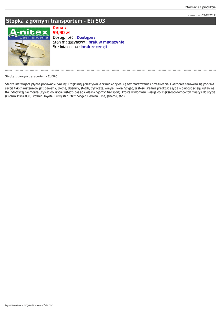 Informacje o produkcie Utworzono 03-03-2017 Stopka z górnym transportem - Eti 503 Cena : 99,90 zł Dostępność : Dostępny Stan magazynowy : brak w magazynie Średnia ocena : brak recenzji Stopka z górnym transportem - Eti 503 Stopka ułatwiająca płynne podawanie tkaniny. Dzięki niej przeszywanie tkanin odbywa się bez marszczenia i przesuwania. Doskonale sprawdza się podczas szycia takich materiałów jak: bawełna, płótna, dzianiny, stetch, trykotaże, winyle, skóra. Szyjąc, zastosuj średnia prędkość szycia a długość ściegu ustaw na 0-4. Stopki tej nie można używać do szycia wstecz (posiada własny "górny" transport). Prosta w montażu. Pasuje do większości domowych maszyn do szycia (Łucznik klasa 800, Brother, Toyota, Huskystar, Pfaff, Singer, Bernina, Elna, Janome, etc.). Wygenerowano w programie www.oscGold.com