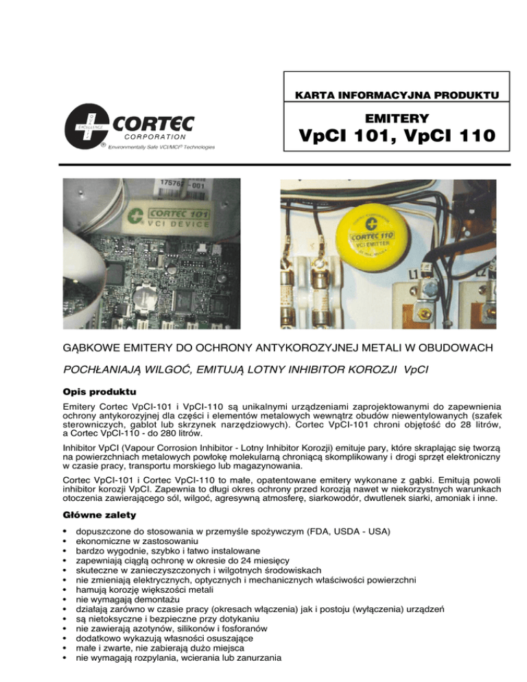 KARTA INFORMACYJNA PRODUKTU EMITERY VpCI 101, VpCI 110 GÑBKOWE EMITERY DO OCHRONY ANTYKOROZYJNEJ METALI W OBUDOWACH POCH¸ANIAJÑ WILGOå, EMITUJÑ LOTNY INHIBITOR KOROZJI VpCI Opis produktu Emitery Cortec VpCI-101 i VpCI-110 sà unikalnymi urzàdzeniami zaprojektowanymi do zapewnienia ochrony antykorozyjnej dla cz´Êci i elementów metalowych wewnàtrz obudów niewentylowanych (szafek sterowniczych, gablot lub skrzynek narz´dziowych). Cortec VpCI-101 chroni obj´toÊç do 28 litrów, a Cortec VpCI-110 - do 280 litrów. Inhibitor VpCI (Vapour Corrosion Inhibitor - Lotny Inhibitor Korozji) emituje pary, które skraplajàc si´ tworzà na powierzchniach metalowych pow∏ok´ molekularnà chroniàcà skomplikowany i drogi sprz´t elektroniczny w czasie pracy, transportu morskiego lub magazynowania. Cortec VpCI-101 i Cortec VpCI-110 to ma∏e, opatentowane emitery wykonane z gàbki. Emitujà powoli inhibitor korozji VpCI. Zapewnia to d∏ugi okres ochrony przed korozjà nawet w niekorzystnych warunkach otoczenia zawierajàcego sól, wilgoç, agresywnà atmosfer´, siarkowodór, dwutlenek siarki, amoniak i inne. G∏ówne zalety • dopuszczone do stosowania w przemyÊle spo˝ywczym (FDA, USDA - USA) • • • • • • • • • • • • • ekonomiczne w zastosowaniu bardzo wygodnie, szybko i ∏atwo instalowane zapewniajà ciàg∏à ochron´ w okresie do 24 miesi´cy skuteczne w zanieczyszczonych i wilgotnych Êrodowiskach nie zmieniajà elektrycznych, optycznych i mechanicznych w∏aÊciwoÊci powierzchni hamujà korozj´ wi´kszoÊci metali nie wymagajà demonta˝u dzia∏ajà zarówno w czasie pracy (okresach w∏àczenia) jak i postoju (wy∏àczenia) urzàdzeƒ sà nietoksyczne i bezpieczne przy dotykaniu nie zawierajà azotynów, silikonów i fosforanów dodatkowo wykazujà w∏asnoÊci osuszajàce ma∏e i zwarte, nie zabierajà du˝o miejsca nie wymagajà rozpylania, wcierania lub zanurzania www.inhibitory.pl • karta informacyjna Cortec VpCI 101, Cortec VpCI 110 strona 2 spe∏niajà wymagania norm czystoÊci powietrza Po∏udniowej Kaliforni (niskie wartoÊci VOC) i innych przepisów lokalnych Typowe zastosowania Cortec VpCI-101 i Cortec VpCI-110 mogà byç skutecznie u˝yte do ochrony wszystkich dzia∏ajàcych, zapakowanych lub zmagazynowanych urzàdzeƒ elektrycznych, m.in.: sprz´tu komunikacji i nawigacji morskiej, lotniczych uk∏adów sterowania, silników elektrycznych, urzàdzeƒ prze∏àczajàcych, skrzynek bezpiecznikowych, szafek zasilajàcych, sprz´tu medycznego, kana∏ów kablowych, krosownic, przyrzàdów pomiarowych i naukowych, sprz´tu telekomunikacyjnego i urzàdzeƒ zdalnego sterowania. Instrukcja stosowania Cortec VpCI-101 i Cortec VpCI-110 sà wyjàtkowo ∏atwe i wygodne w instalacji. Powinny byç zainstalowane mo˝liwie jak najwczeÊniej i je˝eli to mo˝liwe, przed transportem morskim. Cortec VpCI-101 i Cortec VpCI-110 mogà byç instalowane w dowolnej pozycji. Nale˝y wybraç miejsce wewnàtrz obudowy (lub opakowania) i sprawdziç czy powierzchnia do której zamocowany b´dzie emiter jest czysta i niezat∏uszczona. Odkleiç pasek pokrywajàcy przylepiec na spodzie emitera i docisnàç emiter do czystej powierzchni obudowy. Na ka˝de 28 litrów obj´toÊci obudowy instaluje si´ jeden emiter Cortec VpCI-101, a w wi´kszych obudowach, na ka˝de 280 litrów instaluje si´ jeden emiter Cortec VpCI-110. JeÊli obudowa nie jest ca∏kowicie szczelna lub jeÊli jest cz´sto otwierana, nale˝y wymieniaç emitery Cortec VpCI-101 i Cortec VpCI-110 cz´Êciej ni˝ co 2 lata. Po okresach d∏ugotrwa∏ego otwarcia (np. wzmo˝onej konserwacji) nale˝y zmieniç emitery lub bardzo delikatnie spryskaç wn´trze obudowy aerozolem Cortec VpCI-238. Typowe w∏aÊciwoÊci emitera Cortec VpCI-101 samoprzylepna wk∏adka z gàbki wymiary : ............................................................. 76 mm x 32 mm x 6 mm obj´toÊç chroniona:................................................ 28 dm 3 opakowania: ......................................................... 50 osobno zapakowanych sztuk w kartonie równowa˝nik osuszania:......................................... 3 jednostki Typowe w∏aÊciwoÊci emitera Cortec VpCI-110 samoprzylepna wk∏adka z gàbki wymiary : ............................................................. Êrednica 64 mm, wysokoÊç 51 mm obj´toÊç chroniona:................................................ 280 dm3 opakowania: ......................................................... 12 osobno zapakowanych sztuk w kartonie • • • • PRODUKTY WY¸ÑCZNIE DO ZASTOSOWA¡ PRZEMYS¸OWYCH CHRONIå PRZED DZIEåMI ZAMYKAå SZCZELNIE OPAKOWANIA ZAPOZNAå SI¢ Z KARTÑ BEZPIECZE¡STWA PRODUKTU PRODUKT WYTWORZONY ZGODNIE ZE STANDARDAMI JAKOÂCI ISO 9001 ORAZ ISO 14001 Wszystkie stwierdzenia, informacje techniczne i zalecenia zawarte w niniejszej karcie oparte sà na najlepszej wiedzy i doÊwiadczeniach , co do których jesteÊmy przekonani ˝e sà wiarygodne i odpowiadajà rzeczywistemu stanowi teorii i praktyki. Nie sà one jednak wià˝àce i nie tworzà ˝adnego stosunku prawnego lub umownego ani te˝ dodatkowych zobowiàzaƒ do umowy kupna - sprzeda˝y, a ich dok∏adnoÊç i kompletnoÊç nie jest gwarantowana. Cortec Corporation gwarantuje, ˝e jego produkty wysy∏ane do nabywcy sà wolne od defektów. Gwarancja ta jest ograniczona do wymiany produktu w przypadku udowodnienia jego defektu. ˚eby uzyskaç prawo do wymiany produktu w ramach niniejszej gwarancji nabywca produktu musi powiadomiç Cortec Corporation o przypisywanym defekcie w przeciàgu szeÊciu miesi´cy od daty wysy∏ki produktu do nabywcy. Wszyskie koszty wysy∏ki zwiàzane z wymianà produktu ponosi nabywca. Cortec Corporation nie ponosi ˝adnej odpowiedzialnoÊci za jakiekolwiek szkody, straty lub uszkodzenia wynikajàce z u˝ycia bàdê niemo˝noÊci u˝ycia nabytych produktów.Przed u˝yciem nabywca musi sam okreÊliç przydatnoÊç produktu do zamierzonego 