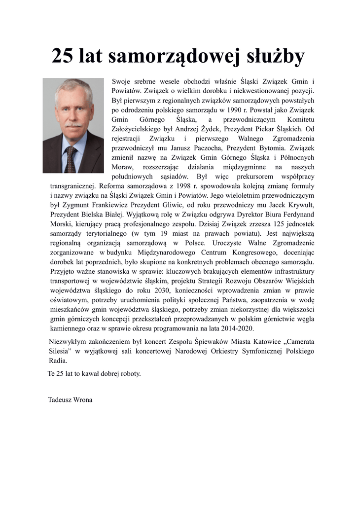 25 lat samorządowej służby Swoje srebrne wesele obchodzi właśnie Śląski Związek Gmin i Powiatów. Związek o wielkim dorobku i niekwestionowanej pozycji. Był pierwszym z regionalnych związków samorządowych powstałych po odrodzeniu polskiego samorządu w 1990 r. Powstał jako Związek Gmin Górnego Śląska, a przewodniczącym Komitetu Założycielskiego był Andrzej Żydek, Prezydent Piekar Śląskich. Od rejestracji Związku i pierwszego Walnego Zgromadzenia przewodniczył mu Janusz Paczocha, Prezydent Bytomia. Związek zmienił nazwę na Związek Gmin Górnego Śląska i Północnych Moraw, rozszerzając działania międzygminne na naszych południowych sąsiadów. Był więc prekursorem współpracy transgranicznej. Reforma samorządowa z 1998 r. spowodowała kolejną zmianę formuły i nazwy związku na Śląski Związek Gmin i Powiatów. Jego wieloletnim przewodniczącym był Zygmunt Frankiewicz Prezydent Gliwic, od roku przewodniczy mu Jacek Krywult, Prezydent Bielska Białej. Wyjątkową rolę w Związku odgrywa Dyrektor Biura Ferdynand Morski, kierujący pracą profesjonalnego zespołu. Dzisiaj Związek zrzesza 125 jednostek samorządy terytorialnego (w tym 19 miast na prawach powiatu). Jest największą regionalną organizacją samorządową w Polsce. Uroczyste Walne Zgromadzenie zorganizowane w budynku Międzynarodowego Centrum Kongresowego, doceniając dorobek lat poprzednich, było skupione na konkretnych problemach obecnego samorządu. Przyjęto ważne stanowiska w sprawie: kluczowych brakujących elementów infrastruktury transportowej w województwie śląskim, projektu Strategii Rozwoju Obszarów Wiejskich województwa śląskiego do roku 2030, konieczności wprowadzenia zmian w prawie oświatowym, potrzeby uruchomienia polityki społecznej Państwa, zaopatrzenia w wodę mieszkańców gmin województwa śląskiego, potrzeby zmian niekorzystnej dla większości gmin górniczych koncepcji przekształceń przeprowadzanych w polskim górnictwie węgla kamiennego oraz w sprawie okresu programowania na lata 2014-2020. Niezwykłym zakończeniem był koncert Zespołu Śpiewaków Miasta Katowice „Camerata Silesia” w wyjątkowej sali koncertowej Narodowej Orkiestry Symfonicznej Polskiego Radia. Te 25 lat to kawał dobrej roboty. Tadeusz Wrona