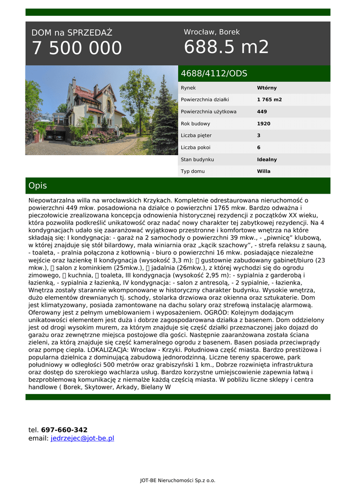 DOM na SPRZEDAŻ 7 500 000 Wrocław, Borek 688.5 m2 4688/4112/ODS Rynek Wtórny Powierzchnia działki 1 765 m2 Powierzchnia użytkowa 449 Rok budowy 1920 Liczba pięter 3 Liczba pokoi 6 Stan budynku Idealny Typ domu Willa Opis Niepowtarzalna willa na wrocławskich Krzykach. Kompletnie odrestaurowana nieruchomość o powierzchni 449 mkw. posadowiona na działce o powierzchni 1765 mkw. Bardzo odważna i pieczołowicie zrealizowana koncepcja odnowienia historycznej rezydencji z początków XX wieku, która pozwoliła podkreślić unikatowość oraz nadać nowy charakter tej zabytkowej rezydencji. Na 4 kondygnacjach udało się zaaranżować wyjątkowo przestronne i komfortowe wnętrza na które składają się: I kondygnacja: - garaż na 2 samochody o powierzchni 39 mkw., - „piwnicę” klubową, w której znajduje się stół bilardowy, mała winiarnia oraz „kącik szachowy”, - strefa relaksu z sauną, - toaleta, - pralnia połączona z kotłownią - biuro o powierzchni 16 mkw. posiadające niezależne wejście oraz łazienkę II kondygnacja (wysokość 3,3 m): gustownie zabudowany gabinet/biuro (23 mkw.), salon z kominkiem (25mkw.), jadalnia (26mkw.), z której wychodzi się do ogrodu zimowego, kuchnia, toaleta, III kondygnacja (wysokość 2,95 m): - sypialnia z garderobą i łazienką, - sypialnia z łazienką, IV kondygnacja: - salon z antresolą, - 2 sypialnie, - łazienka, Wnętrza zostały starannie wkomponowane w historyczny charakter budynku. Wysokie wnętrza, dużo elementów drewnianych tj. schody, stolarka drzwiowa oraz okienna oraz sztukaterie. Dom jest klimatyzowany, posiada zamontowane na dachu solary oraz strefową instalację alarmową. Oferowany jest z pełnym umeblowaniem i wyposażeniem. OGRÓD: Kolejnym dodającym unikatowości elementem jest duża i dobrze zagospodarowana działka z basenem. Dom oddzielony jest od drogi wysokim murem, za którym znajduje się część działki przeznaczonej jako dojazd do garażu oraz zewnętrzne miejsca postojowe dla gości. Następnie zaaranżowana została ściana zieleni, za którą znajduje się część kameralnego ogrodu z basenem. Basen posiada przeciwprądy oraz pompę ciepła. LOKALIZACJA: Wrocław - Krzyki. Południowa część miasta. Bardzo prestiżowa i popularna dzielnica z dominującą zabudową jednorodzinną. Liczne tereny spacerowe, park południowy w odległości 500 metrów oraz grabiszyński 1 km., Dobrze rozwinięta infrastruktura oraz dostęp do szerokiego wachlarza usług. Bardzo korzystne umiejscowienie zapewnia łatwą i bezproblemową komunikację z niemalże każdą częścią miasta. W pobliżu liczne sklepy i centra handlowe ( Borek, Skytower, Arkady, Bielany W tel. 697-660-342 email: [email protected] JOT-BE Nieruchomości Sp.z o.o. Powered by TCPDF (www.tcpdf.org)