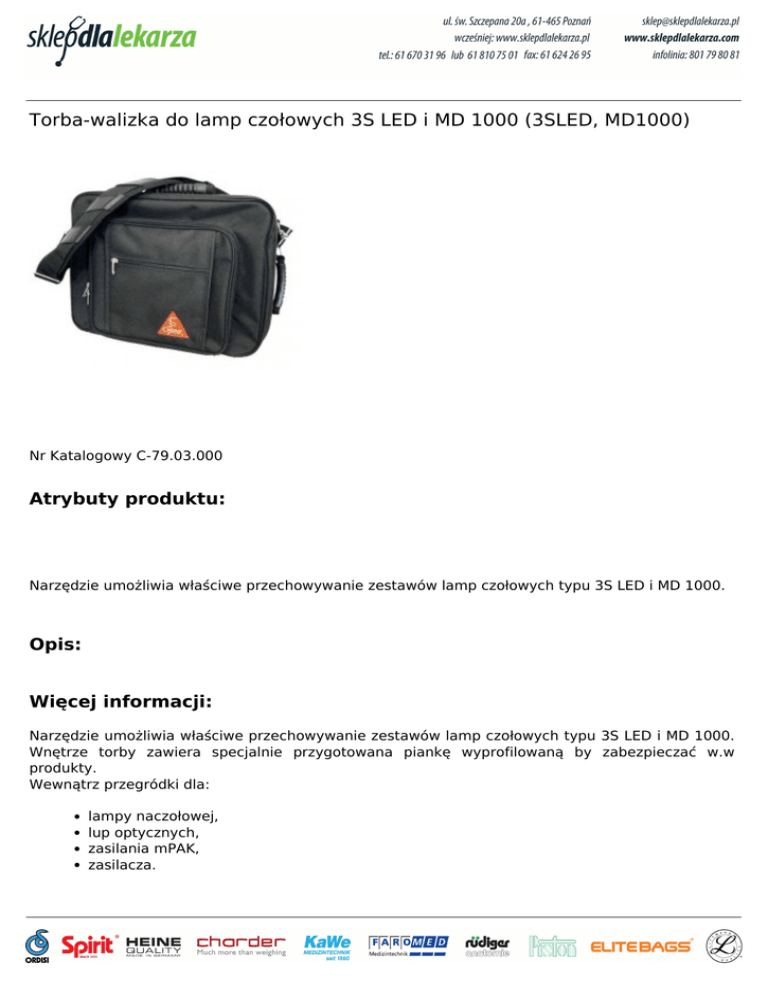 Torba-walizka do lamp czołowych 3S LED i MD 1000 (3SLED, MD1000) Nr Katalogowy C-79.03.000 Atrybuty produktu: Narzędzie umożliwia właściwe przechowywanie zestawów lamp czołowych typu 3S LED i MD 1000. Opis: Więcej informacji: Narzędzie umożliwia właściwe przechowywanie zestawów lamp czołowych typu 3S LED i MD 1000. Wnętrze torby zawiera specjalnie przygotowana piankę wyprofilowaną by zabezpieczać w.w produkty. Wewnątrz przegródki dla: lampy naczołowej, lup optycznych, zasilania mPAK, zasilacza. Powered by TCPDF (www.tcpdf.org)