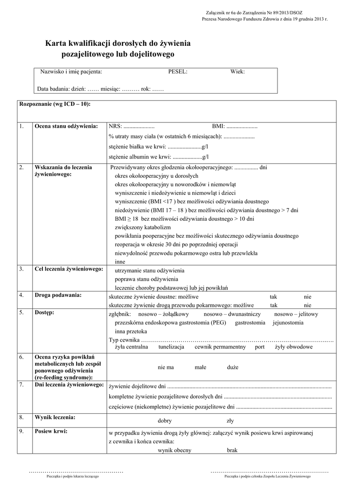 Załącznik nr 6a do Zarządzenia Nr 89/2013/DSOZ Prezesa Narodowego Funduszu Zdrowia z dnia 19 grudnia 2013 r. Karta kwalifikacji dorosłych do żywienia pozajelitowego lub dojelitowego Nazwisko i imię pacjenta: PESEL: Wiek: Data badania: dzień: …… miesiąc: ……… rok: …… Rozpoznanie (wg ICD – 10): 1. Ocena stanu odżywienia: NRS: ..................... BMI: ..................... % utraty masy ciała (w ostatnich 6 miesiącach): ..................... stężenie białka we krwi: .......................g/l stężenie albumin we krwi: ....................g/l 2. 3. 4. 5. 6. 7. Przewidywany okres głodzenia okołooperacyjnego: ................ dni okres okołooperacyjny u dorosłych okres okołooperacyjny u noworodków i niemowląt wyniszczenie i niedożywienie u niemowląt i dzieci wyniszczenie (BMI <17 ) bez możliwości odżywiania doustnego niedożywienie (BMI 17 – 18 ) bez możliwości odżywiania doustnego > 7 dni BMI ≥ 18 bez możliwości odżywiania doustnego > 10 dni zwiększony katabolizm powikłania pooperacyjne bez możliwości skutecznego odżywiania doustnego reoperacja w okresie 30 dni po poprzedniej operacji niewydolność przewodu pokarmowego ostra lub przewlekła inne Cel leczenia żywieniowego: utrzymanie stanu odżywienia poprawa stanu odżywienia leczenie choroby podstawowej lub jej powikłań Droga podawania: skuteczne żywienie doustne: możliwe tak nie skuteczne żywienie drogą przewodu pokarmowego: możliwe tak nie Dostęp: zgłębnik: nosowo – żołądkowy nosowo – dwunastniczy nosowo – jelitowy przezskórna endoskopowa gastrostomia (PEG) gastrostomia jejunostomia inna przetoka Typ cewnika ………………………………………………………………………………….…. żyła centralna tunelizacja cewnik permamentny port żyły obwodowe Wskazania do leczenia żywieniowego: Ocena ryzyka powikłań metabolicznych lub zespół nie ma małe duże ponownego odżywienia (re-feeding syndrome): Dni leczenia żywieniowego: żywienie dojelitowe dni ............................................................................................................... kompletne żywienie pozajelitowe dorosłych dni ......................................................................... częściowe (niekompletne) żywienie pozajelitowe dni ................................................................. 8. Wynik leczenia: 9. Posiew krwi: dobry w przypadku żywienia drogą żyły głównej: załączyć wynik posiewu krwi aspirowanej z cewnika i końca cewnika: wynik obecny brak ………………………………………… Pieczątka i podpis lekarza leczącego zły …………………………………………………… Pieczątka i podpis członka Zespołu Leczenia Żywieniowego