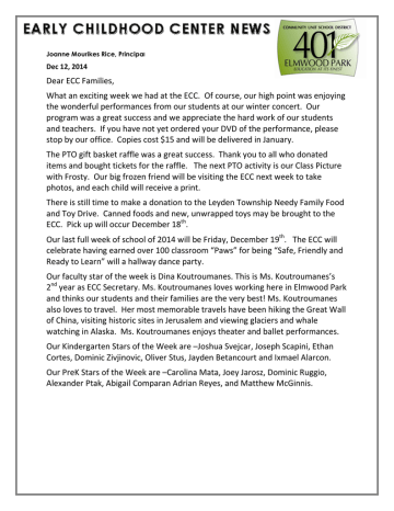 Joanne Mourikes Rice, Principal Dec 12, 2014 Dear ECC Families, What an exciting week we had at the ECC. Of course, our high point was enjoying the wonderful performances from our students at our winter concert. Our program was a great success and we appreciate the hard work of our students and teachers. If you have not yet ordered your DVD of the performance, please stop by our office. Copies cost $15 and will be delivered in January. The PTO gift basket raffle was a great success. Thank you to all who donated items and bought tickets for the raffle. The next PTO activity is our Class Picture with Frosty. Our big frozen friend will be visiting the ECC next week to take photos, and each child will receive a print. There is still time to make a donation to the Leyden Township Needy Family Food and Toy Drive. Canned foods and new, unwrapped toys may be brought to the ECC. Pick up will occur December 18th. Our last full week of school of 2014 will be Friday, December 19th. The ECC will celebrate having earned over 100 classroom “Paws” for being “Safe, Friendly and Ready to Learn” will a hallway dance party. Our faculty star of the week is Dina Koutroumanes. This is Ms. Koutroumanes’s 2nd year as ECC Secretary. Ms. Koutroumanes loves working here in Elmwood Park and thinks our students and their families are the very best! Ms. Koutroumanes also loves to travel. Her most memorable travels have been hiking the Great Wall of China, visiting historic sites in Jerusalem and viewing glaciers and whale watching in Alaska. Ms. Koutroumanes enjoys theater and ballet performances. Our Kindergarten Stars of the Week are –Joshua Svejcar, Joseph Scapini, Ethan Cortes, Dominic Zivjinovic, Oliver Stus, Jayden Betancourt and Ixmael Alarcon. Our PreK Stars of the Week are –Carolina Mata, Joey Jarosz, Dominic Ruggio, Alexander Ptak, Abigail Comparan Adrian Reyes, and Matthew McGinnis. Estimadas Familias del Centro ECC, ¡Qué semana tan emocionante hemos tenido en el Centro ECC! Por supuesto, nuestro punto culminante fue el poder disfrutar de la maravillosa actuación de nuestros estudiantes en nuestro Consierto de Invierno. Nuestro programa fue un gran éxito y apreciamos el duro trabajo de nuestros estudiantes y maestras. Si es que usted todavía no ha ordenado su DVD de la presentación del concierto, favor de pasar por la oficina. El precio de las copias es de $15 y se estarán entregando durante mes de enero. Las Canastas para la rifa de la PTO fueron todo un éxito. Muchísimas gracias a todos ustedes los que donaron artículos y los que compraron boletos para la rifa. La próxima actividad de la PTO será nuestra foto de la clase con El Señor de Las Nieves. Nuestro gran amigo El Señor de las Nieves estará visitando nuestro Centro ECC la semana que viene, para tomarse fotos con los estudiantes y cada estudiante recibirá una copia. Todavía hay tiempo para hacer una donación para la recaudación de alimentos y juguetes del Pueblito de Leyden, para familias necesitadas. Alimentos enlatados y juguetes nuevos sin envolver pueden traerse al Centro ECC. Estos se recogerán el 18 de diciembre. Nuestra última semana completa del 2014 será el viernes 19 de diciembre. El Centro ECC estará celebrando el haber completado más de 100 “Paws” de los salones de clases par haber sido “Seguros, Amigables y Listos para Aprender”, con una fiesta de baile en los pasillos. Nuestro personal Estrella de la Semana es la Señora Dina Koutroumanes. Este es el segundo año de la Señora Ms. Koutroumanes de ser la secretaria del Centro ECC. ! A la Señora Koutroumanes le encanta trabajar aquí en Elmwood Park y siente que nuestros estudiantes y sus familias son lo mejor! A la Señora Koutroumanes también le encanta viajar. Los viajes más memorables para ella ha sido el trepar por la Gran Muralla de China, visitar lugares históricos en Jerusalén y ver los glaciares y las ballenas de Alaska. La Señora Koutroumanes disfruta de ver presentaciones teatrales y de valet. Nuestros estudiantes Estrella de la Semana para Kínder son –Joshua Svejcar, Joseph Scapini, Ethan Cortes, Dominic Zivjinovic, Oliver Stus, Jayden Betancourt y Ixmael Alarcon. Nuestros estudiantes Estrella para Pre Kínder son –Carolina Mata, Joey Jarosz, Dominic Ruggio, Alexander Ptak, Abigail Comparan, Matthew McGinnis, y Adrián Reyes. Joanne Mourikes Rice Dyrektor 12 grudzien , 2014 Drodzy rodzice, Mijajcy tydzien w ECC byl bardzo ekscytujacy. Oczywiscie, najjasniejszym punktem tygodnia byly cudowne wystepy naszych uczniow w czasie koncertu zimowego. Koncert byl wielkiem sukcesem. Dziekujemy bardzo za ciezka prace wszystkich wystepujacych i ich wychowawcow. Jesli nie zlozyli jeszcze Panstwo zamowienia na nagranie DVD z koncertu, nadal mozna to zrobic w biurze szkoly. Koszt plyty to $15. Nagrania beda do odebrania w styczniu. Loteria fantowa koordynowana przez nasze PTO rowniez zakonczyla sie powodzeniem. Dziekujemy wszystkim rodzinom, ktore podarowaly prezenty, czy zakupily losy. Nastpnym wydarzeniem organizowanym przez ta organizacje beda zdjecia z balwankiem Frosty. Nasz duzy „mrozny” przyjaciel odwiedzi ECC w nastepnym tygodniu i zrobi zdjecie z kazdym naszym uczniem. Nadal istnieje mozliwosc wziecia udzialu w akcji charytatywnej organizowanej przez Leyden Township Needy Family Food and Toy Drive. Zbierane sa produkty zywnosciowe (puszki) i nowe, nieopakowane zabawki. Nalezy je dostarczyc do ECC do 18 grudnia. Ostatnim, pelny tydzien zajec przed swietami zakonczy sie w piatek, 19 grudnia. ECC celebrowalo bedzie w tym dniu rowniez zebranie 100 „lapek” (Paws) za dobre zachowanie, czyli bycie bezpiecznym, przyjacielskim i gotowym do nauki. Planujemy zorganizowanie krotkiej potancowki na korytarzu! Gwiazda tygodnia wsrod pracownikow jest nasza pani sekretarka, pani Dina Koutroumanes. Ten rok jest drugim rokiem pracy pani Koutroumanes. Bardzo podoba jej sie praca w Elmwood Park, a jej zdaniem, rodziny i uczniowie z naszej s