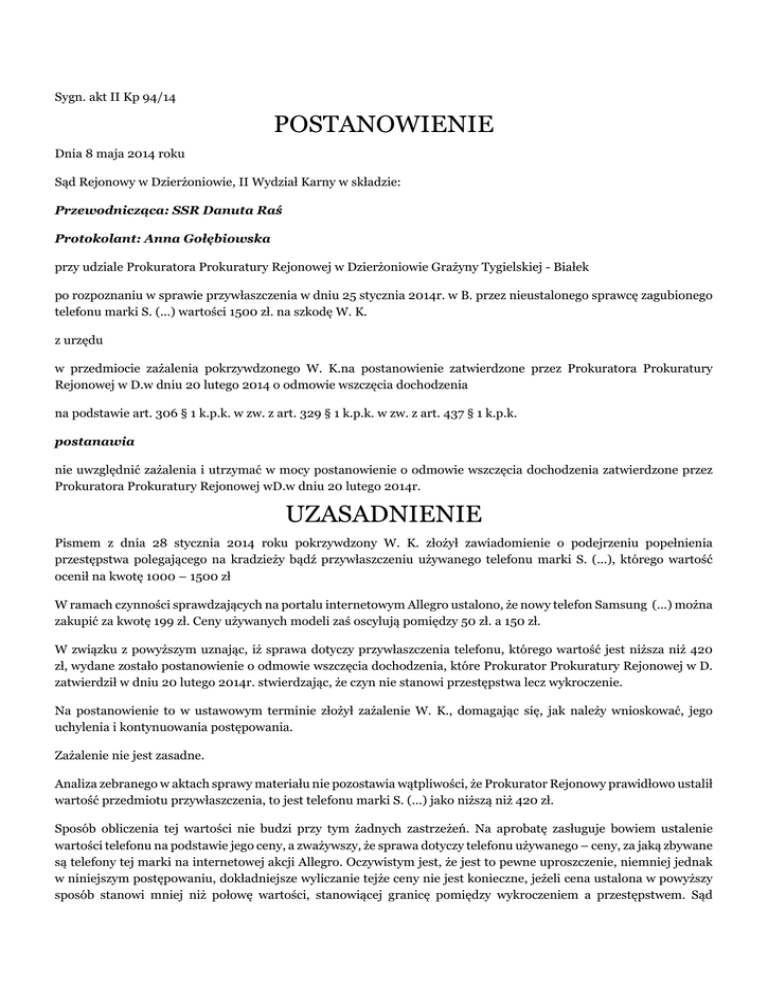 Sygn. akt II Kp 94/14 POSTANOWIENIE Dnia 8 maja 2014 roku Sąd Rejonowy w Dzierżoniowie, II Wydział Karny w składzie: Przewodnicząca: SSR Danuta Raś Protokolant: Anna Gołębiowska przy udziale Prokuratora Prokuratury Rejonowej w Dzierżoniowie Grażyny Tygielskiej - Białek po rozpoznaniu w sprawie przywłaszczenia w dniu 25 stycznia 2014r. w B. przez nieustalonego sprawcę zagubionego telefonu marki S. (...) wartości 1500 zł. na szkodę W. K. z urzędu w przedmiocie zażalenia pokrzywdzonego W. K.na postanowienie zatwierdzone przez Prokuratora Prokuratury Rejonowej w D.w dniu 20 lutego 2014 o odmowie wszczęcia dochodzenia na podstawie art. 306 § 1 k.p.k. w zw. z art. 329 § 1 k.p.k. w zw. z art. 437 § 1 k.p.k. postanawia nie uwzględnić zażalenia i utrzymać w mocy postanowienie o odmowie wszczęcia dochodzenia zatwierdzone przez Prokuratora Prokuratury Rejonowej wD.w dniu 20 lutego 2014r. UZASADNIENIE Pismem z dnia 28 stycznia 2014 roku pokrzywdzony W. K. złożył zawiadomienie o podejrzeniu popełnienia przestępstwa polegającego na kradzieży bądź przywłaszczeniu używanego telefonu marki S. (...), którego wartość ocenił na kwotę 1000 – 1500 zł W ramach czynności sprawdzających na portalu internetowym Allegro ustalono, że nowy telefon Samsung (...) można zakupić za kwotę 199 zł. Ceny używanych modeli zaś oscylują pomiędzy 50 zł. a 150 zł. W związku z powyższym uznając, iż sprawa dotyczy przywłaszczenia telefonu, którego wartość jest niższa niż 420 zł, wydane zostało postanowienie o odmowie wszczęcia dochodzenia, które Prokurator Prokuratury Rejonowej w D. zatwierdził w dniu 20 lutego 2014r. stwierdzając, że czyn nie stanowi przestępstwa lecz wykroczenie. Na postanowienie to w ustawowym terminie złożył zażalenie W. K., domagając się, jak należy wnioskować, jego uchylenia i kontynuowania postępowania. Zażalenie nie jest zasadne. Analiza zebranego w aktach sprawy materiału nie pozostawia wątpliwości, że Prokurator Rejonowy prawidłowo ustalił wartość przedmiotu przywłaszczenia, to jest telefonu marki S. (...) jako niższą niż 420 zł. Sposób obliczenia tej wartości nie budzi przy tym żadnych zastrzeżeń. Na aprobatę zasługuje bowiem ustalenie wartości telefonu na podstawie jego ceny, a zważywszy, że sprawa dotyczy telefonu używanego – ceny, za jaką zbywane są telefony tej marki na internetowej akcji Allegro. Oczywistym jest, że jest to pewne uproszczenie, niemniej jednak w niniejszym postępowaniu, dokładniejsze wyliczanie tejże ceny nie jest konieczne, jeżeli cena ustalona w powyższy sposób stanowi mniej niż połowę wartości, stanowiącej granicę pomiędzy wykroczeniem a przestępstwem. Sąd podziela przy tym stanowisko Prokuratora, iż nie można uznać za słuszne subiektywne przekonanie pokrzywdzonego, że wartość przywłaszczonego na jego szkodę telefonu wynosiła w chwili dokonania czynu 1500 zł. Zgodzić się też trzeba, że możliwość zakupienia nowego telefonu za 199 zł. wyklucza możliwość przyjęcia, że wartość używanego, starego typu aparatu telefonicznego jest dwukrotnie wyższa od wskazanej kwoty. Zgodnie z przepisem art. 119 § 1 k.w. kto kradnie lub przywłaszcza sobie cudzą rzecz ruchomą, jeżeli jej wartość nie przekracza 1/4 minimalnego wynagrodzenia, podlega karze aresztu, ograniczenia wolności albo grzywny. Wykroczenie z art. 119 zawiera bowiem konstrukcję tzw. czynu przepołowionego, co oznacza, że ustalenie, czy konkretne działanie sprawcy kradzieży lub przywłaszczenia wyczerpuje ustawowe znamiona wykroczenia, czy też stanowi przestępstwo, decyduje wartość mienia zabranego lub przywłaszczonego przez sprawcę, która obecnie stanowi kwotę 420 zł. Skoro zatem wartość przywłaszczonego pokrzywdzonemu mienia jest niższa niż 420 zł., to postępowanie winno być prowadzone nie w trybie dochodzenia lecz w trybie przepisów postępowania w sprawach o wykroczenia, a co za tym idzie decyzję Prokuratora o odmowie wszczęcia dochodzenia uznać należy za słuszną. (...) (...)