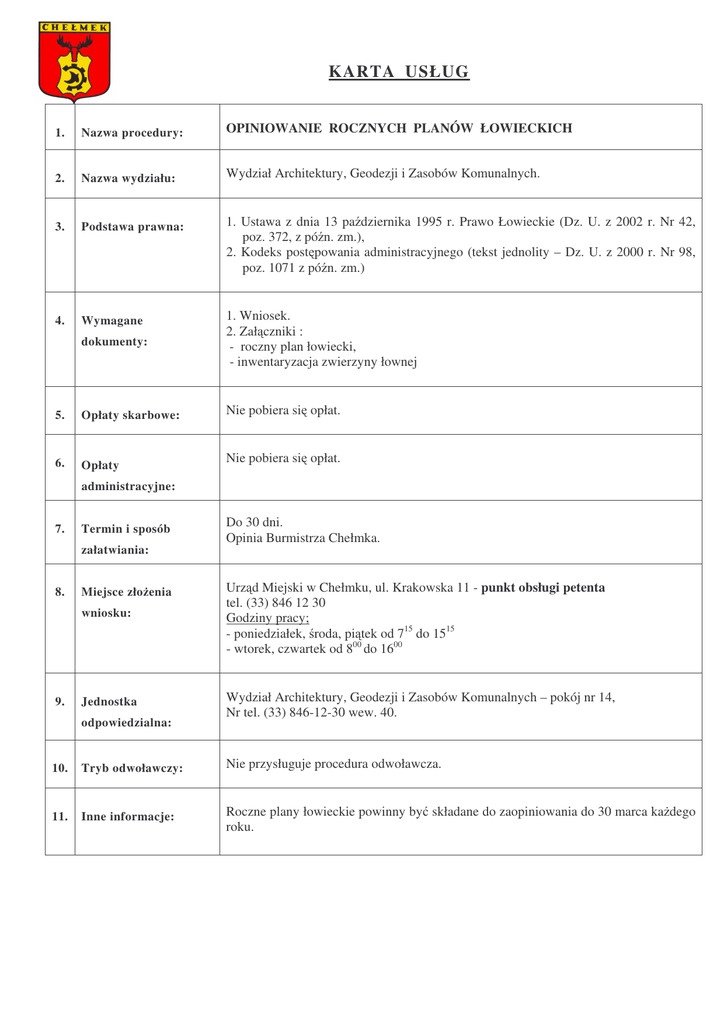 KARTA USŁUG 1. Nazwa procedury: OPINIOWANIE ROCZNYCH PLANÓW ŁOWIECKICH 2. Nazwa wydziału: Wydział Architektury, Geodezji i Zasobów Komunalnych. 3. Podstawa prawna: 1. Ustawa z dnia 13 pa dziernika 1995 r. Prawo Łowieckie (Dz. U. z 2002 r. Nr 42, poz. 372, z pó n. zm.), 2. Kodeks post powania administracyjnego (tekst jednolity – Dz. U. z 2000 r. Nr 98, poz. 1071 z pó n. zm.) 4. Wymagane dokumenty: 1. Wniosek. 2. Zał czniki : - roczny plan łowiecki, - inwentaryzacja zwierzyny łownej 5. Opłaty skarbowe: Nie pobiera si opłat. 6. Opłaty Nie pobiera si opłat. administracyjne: 7. Termin i sposób załatwiania: 8. 9. Do 30 dni. Opinia Burmistrza Chełmka. wniosku: Urz d Miejski w Chełmku, ul. Krakowska 11 - punkt obsługi petenta tel. (33) 846 12 30 Godziny pracy; - poniedziałek, roda, pi tek od 715 do 1515 - wtorek, czwartek od 800 do 1600 Jednostka Wydział Architektury, Geodezji i Zasobów Komunalnych – pokój nr 14, Nr tel. (33) 846-12-30 wew. 40. Miejsce zło enia odpowiedzialna: 10. Tryb odwoławczy: Nie przysługuje procedura odwoławcza. 11. Inne informacje: Roczne plany łowieckie powinny by składane do zaopiniowania do 30 marca ka dego roku.