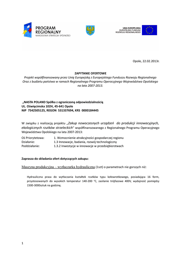Opole, 22.02.2013r. ZAPYTANIE OFERTOWE Projekt współfinansowany przez Unię Europejską z Europejskiego Funduszu Rozwoju Regionalnego Oraz z budżetu państwa w ramach Regionalnego Programu Operacyjnego Województwa Opolskiego na lata 2007-2013. „NASTA POLAND Spółka z ograniczoną odpowiedzialnością UL. Oświęcimska 102H, 45-641 Opole NIP 7542505125, REGON 531337694, KRS 0000184445 W związku z realizacją projektu „ Zakup nowoczesnych urządzeń do produkcji innowacyjnych, ekologicznych rzutków strzeleckich” współfinansowanego z Regionalnego Programu Operacyjnego Województwa Opolskiego na lata 2007-2013: Oś Priorytetowa: Działanie: Poddziałanie: 1. Wzmocnienie atrakcyjności gospodarczej regionu 1.3 Innowacje, badania, rozwój technologiczny 1.3.2 Inwestycje w innowacje w przedsiębiorstwach Zaprasza do składania ofert dotyczących zakupu: Maszyna produkcyjna – wytłaczarka hydrauliczna (1szt) o parametrach nie gorszych niż: Hydrauliczna prasa do wytłaczania kształtek rzutków typu kołowrotkowego, posiadająca 16 form, przystosowanych do wysokich temperatur 140-200 °C, zasilanie trójfazowe 400V, wydajność pomiędzy 1500-3000sztuk na godzinę. 1 Transport , montaż i uruchomienie urządzenia oraz szkolenie na koszt dostawcy. I. Termin i miejsce realizacji zamówienia: Miejsce realizacji zamówienia: „NASTA POLAND Spółka z ograniczoną odpowiedzialnością UL. Oświęcimska 102H, 45-641 Opole Termin wykonania: III.2013 – IV. 2013r. II. Sposób obliczania ceny: cena powinna uwzględniać transport i winna być podana w PLN lub EUR , cena powinna być podana w wartościach netto. III. Zawartość oferty: Oferta powinna zawierać: 1. Dane oferenta. 2. Datę sporządzenia 3. Cenę przedmiotu zamówienia 4. Opis przedmiotu zamówienia 5. Termin ważności oferty 6. Termin wykonania od dnia podpisania umowy Oferta powinna być sporządzona na papierze firmowym oferenta i/lub być opatrzona pieczątką firmową oraz podpisana przez oferenta, według zasad reprezentacji. Oferta powinna być ważna minimum do: 30.04.2013 IV. Miejsce, sposób, termin składania ofert: Ofert proszę składać : 1. Osobiście w siedzibie firmy: „NASTA POLAND Spółka z ograniczoną odpowiedzialnością UL. Oświęcimska 102H, 45-641 Opole lub 2. Drogą pocztową na adres : „NASTA POLAND Spółka z ograniczoną odpowiedzialnością UL. Oświęcimska 102H, 45-641 Opole lub 3. Drogą elektroniczną na adres: [email protected] Zapytanie ofertowe zamieszczono również na stronie internetowej i w siedzibie firmy w miejscu publicznie dostępnym. 2 Termin składania ofert: Do dnia 8.03.2013r do godz. 15.00 (decyduje data i godzina wpływu do spółki) V. Rozstrzygnięcie/wybór oferty: Wybrany oferent zostanie powiadomiony o wybraniu jego oferty drogą mailową. VI. Sposób udzielania informacji i wyjaśnień: Szczegółowych informacji na temat przedmiotu zamówienia udziela Bartosz Adamczyk e-mail: [email protected] w trakcie trwania konkursu ofert nie będą udzielane żadne informacje, które mogłyby mieć wpływ na treść składanych ofert. VII. Kryterium wyboru oferty: Wybór najkorzystniejszej oferty nastąpi w oparciu o następujące kryteria: a. Cena całkowita netto i brutto - najniższa cena -50 pkt - druga cena – 25 pkt - pozostałe- 0 pkt b. Czas realizacji zlecenia od dnia podpisania umowy - oferent, który zrealizuje zadanie w najkrótszym czasie- 30 pkt. - oferent, który jako drugi zrealizuje zadanie – 15 pkt. - pozostali oferenci – 0 pkt c. Gwarancja i serwis pogwarancyjny - najbardziej korzystna oferta – 20 pkt - druga najbardziej korzystna oferta – 10pkt - pozostałe – 0 pkt RAZEM 100 PKT ZAMAWIAJĄCY WYBIERZE NAJKORZYSTNIEJSZĄ OFERTĘ, KTÓRA UZYSKA NAJWYŻSZĄ ILOŚĆ PUNKTÓW W OPARCIU O USTALONE KRYTERIA I PODPISZE UMOWĘ Z WYBRANYM WYKONAWCĄ. 3 W przypadku uzyskania takiej samej ilości punktów przez dwóch oferentów, o miejscu na liście rankingowej zadecyduje termin złożenia oferty (oferta złożona wcześniej będzie wyżej na liście rankingowej). z poważaniem Prezes Zarządu Bartosz Adamczyk 4
