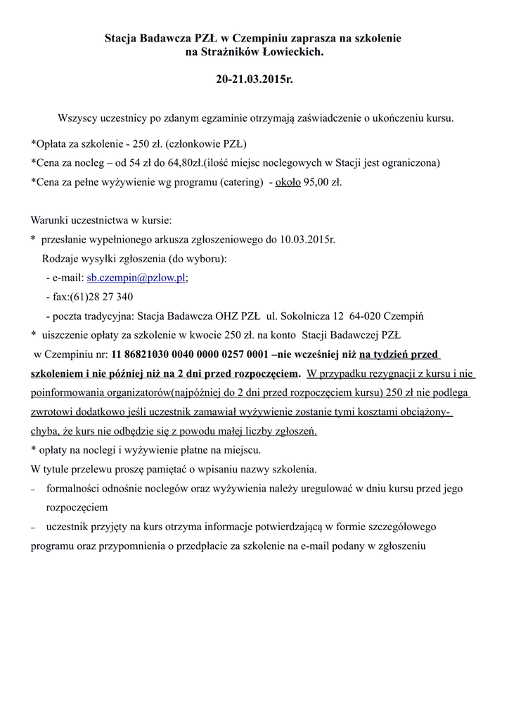 Stacja Badawcza PZŁ w Czempiniu zaprasza na szkolenie na Strażników Łowieckich. 20-21.03.2015r. Wszyscy uczestnicy po zdanym egzaminie otrzymają zaświadczenie o ukończeniu kursu. *Opłata za szkolenie - 250 zł. (członkowie PZŁ) *Cena za nocleg – od 54 zł do 64,80zł.(ilość miejsc noclegowych w Stacji jest ograniczona) *Cena za pełne wyżywienie wg programu (catering) - około 95,00 zł. Warunki uczestnictwa w kursie: * przesłanie wypełnionego arkusza zgłoszeniowego do 10.03.2015r. Rodzaje wysyłki zgłoszenia (do wyboru): - e-mail: [email protected]; - fax:(61)28 27 340 - poczta tradycyjna: Stacja Badawcza OHZ PZŁ ul. Sokolnicza 12 64-020 Czempiń * uiszczenie opłaty za szkolenie w kwocie 250 zł. na konto Stacji Badawczej PZŁ w Czempiniu nr: 11 86821030 0040 0000 0257 0001 –nie wcześniej niż na tydzień przed szkoleniem i nie później niż na 2 dni przed rozpoczęciem. W przypadku rezygnacji z kursu i nie poinformowania organizatorów(najpóźniej do 2 dni przed rozpoczęciem kursu) 250 zł nie podlega zwrotowi dodatkowo jeśli uczestnik zamawiał wyżywienie zostanie tymi kosztami obciążonychyba, że kurs nie odbędzie się z powodu małej liczby zgłoszeń. * opłaty na noclegi i wyżywienie płatne na miejscu. W tytule przelewu proszę pamiętać o wpisaniu nazwy szkolenia. formalności odnośnie noclegów oraz wyżywienia należy uregulować w dniu kursu przed jego rozpoczęciem uczestnik przyjęty na kurs otrzyma informacje potwierdzającą w formie szczegółowego programu oraz przypomnienia o przedpłacie za szkolenie na e-mail podany w zgłoszeniu Program: Piątek: godz. 8:30- przyjazd uczestników i zakwaterowanie godz. 9.00 – 19.30 – wykłady (Obiad 13.00-14.00) godz. 19.30 – Kolacja Sobota: godz. 07.00 - Śniadanie godz. 07.30 – 15.00 – wykłady (Obiad 15.00) TEMATYKA SZKOLENIA: 1.Uprawnienia strażników łowieckich i wymagania kwalifikacyjne dla kandydatów na strażników. 2.Wybrane zagadnienia z: Ustawy Prawo łowieckie i aktów wykonawczych do tej ustawy, Ustawy o ochronie zwierząt Ustawy o lasach. 3.Gospodarka łowiecka. 4.Elementy prawa karnego i postępowania karnego. 5.Elementy materialnego prawa wykroczeń i postępowania w sprawach o wykroczenia. 6.Zasady stosowania środków przymusu bezpośredniego oraz elementy taktyki i technik interwencyjnych (elementy samoobrony). 7.Budowa broni, prawidłowe przechowywanie, przenoszenie oraz zasady obchodzenia się z bronią. 8.Wybrane zagadnienia z ochrony przeciwpożarowej obszarów leśnych, nieleśnych i obiektów. 9.Zasady współdziałania z Policją, Państwową Strażą Łowiecką, Strażą Graniczną, Służbą Leśną (w tym Strażą Leśną), Służbą Parków Narodowych (w tym Strażą Parków Narodowych), Państwową Strażą Rybacką, itp. 10.Pomoc przedmedyczna. FORMULARZ ZGŁOSZENIOWY POLSKI ZWIĄZEK ŁOWIECKI STACJA BADAWCZA OŚRODEK HODOWLI ZWIERZYNY ZG PZŁ 64-020 CZEMPIŃ, tel. +48 61 2826563-4, ul. Sokolnicza 12 fax: +48 61 2827340, ZGŁOSZENIE UDZIAŁU W KURSIE e-mail: [email protected] www.czempin.pzlow.pl NA STRAŻNIKÓW ŁOWIECKICH 20-21.02.2015r. 1. DANE UCZESTNIKA SZKOLENIA (PROSIMY O WYPEŁNIENIE BIAŁYCH RUBRYK DUŻYMI DRUKOWANYMI LITERAMI) NAZWISKO I IMIĘ *: NR LEGITYMACJI PZŁ*: ADRES* : DATA I MIEJSCE URODZENIA* : TEL/FAKS* : ADRES E-MAIL*: NR i NAZWA KOŁA ŁOWIECKIEGO : *wymagane 2. ZAKWATEROWANIE, WYŻYWIENIE (PROSIMY O ZAZNACZENIE WŁAŚCIWEGO POLA POPRZEZ WSTAWIENIE ZNAKU „X”) NIE [ ZAMAWIAM: PEŁNE WYŻYWIENIE TAK [ ] ] Rezerwacja noclegu w SB Czempiń- telefonicznie przez uczestnika kursu po przesłaniu zgłoszenia (TAK [ ] NIE [ ] -wypełnia organizator ) 3. FORMA ROZLICZENIA (PROSIMY O ZAZNACZENIE WŁAŚCIWEGO POLA POPRZEZ WSTAWIENIE ZNAKU „X”) FAKTURA VAT [] PARAGON [ ] 4. DANE PŁATNIKA - DO WYSTAWIENIA FAKTURY (PROSIMY O WYPEŁNIENIE BIAŁYCH RUBRYK DUŻYMI DRUKOWANYMI LITERAMI) NAZWA KOŁA/FIRMY: ADRES: NIP: TELEFON: ADRES E-MAIL: FAKS: (MIEJSCE I DATA) PIECZĘĆ FIRMY I PODPISY