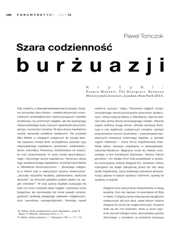 100 zima 2016 Paweł Tomczok Szara codzienność burżuazji k r y t y k i : Franco Moretti, The Bourgeois. Between H i s t o r y a n d L i te ra t u re , L o n d o n - Ne w Yo r k 2 0 1 3 . Gdy myślimy o dziewiętnastowiecznej burżuazji, może- rodzinne uczucia i więzy. Panorama ciągłych zmian, my przywołać dwa obrazy – wielkiej aktywności nowo- nieustannego rewolucjonizowania stosunków społecz- czesnych przedsiębiorców wykorzystujących wszelkie nych, którą roztacza Marks w Manifeście, stanowi jed- możliwości, by pomnożyć majątek, ale też spokojnego nak tylko jedną stronę burżuazyjnego medalu. Równie mieszczańskiego życia, licznych ograniczeń etycznych, często widzimy drugą stronę: zamiast rewolucji domi- ascezy i surowości moralnej. Te dwa obrazy kapitalizmu nuje w niej stabilność codziennych rytuałów, zamiast zwykle sprawiały problemy badaczom. Na przykład poszukiwania nowych dochodów – poszukiwanie bez- Max Weber w Uwagach wstępnych do swojej sław- piecznych inwestycji rodzinnego kapitału, a zamiast nej rozprawy musiał dość szczegółowo wyliczać typy nagich interesów – różne formy wspólnotowej etyki. niepożądanego kapitalizmu (pionierski, wielkospeku- Wiele takich obrazów znajdziemy w dziewiętnasto- lancki, kolonialny, finansowy, zorientowany na wojnę ), wiecznej literaturze. Sięgnijmy może do niezbyt oczy- by móc przeciwstawić im swój model racjonalistycz- wistego w tym kontekście Germinalu. Oprócz historii nego i etycznego ducha kapitalizmu. Heroiczny obraz górników i ich strajku Emil Zola przedstawił w powie- tego awanturniczego kapitalizmu rozwinął Karol Marks ści burżuazyjną rodzinę Grégoire’ów, rentierów, którzy w Manifeście komunistycznym – „Burżuazja odegra- wzbogacili się dzięki zakupionej przed stu laty akcji ła w historii rolę w najwyższym stopniu rewolucyjną”: spółki kopalnianej. Życie kolejnego pokolenia akcjona- „zburzyła wszystkie feudalne, patriarchalne, idylliczne riuszy upływa w szarym spokoju i harmonii, opartej na stosunki”, by stworzyć globalny system oparty na „na- zaufaniu w kapitał: 1 gim interesie” . W wizji autora Kapitału burżuazja nie 2 tylko na nowo rozdziela stare majątki i wytwarza nowe Grégoire’owie wierzyli teraz niezachwianie w swoją bogactwa, ale wprowadza też nowe zasady uznania, kopalnię. Kurs się naprawi, to pewniejsze niż Bóg godność osobistą zastępując statusem majątkowym, w niebie. Z religijną niemal wiarą łączyła się głęboka etos zawodowy wynagrodzeniem, likwiduje nawet wdzięczność dla tych akcji, dzięki którym rodzina Grégoire’ów od stu lat mogła próżnować. Kopalnia 1 2 M. Weber, Etyka protestancka a duch kapitalizmu, przeł. B. Baran, P. Miziński, Warszawa 2010, s. 11. K. Marks, Dzieła wybrane, t. 1, Warszawa 1947, s. 171-172. stała się dla nich bóstwem, które w swym egoizmie otaczali rodzajem kultu, dobrodziejką ogniska domowego, z pokolenia na pokolenie kołyszącą krytyki | Paweł Tomczok, Szara codzienność burzuazji ich w wielkim łożu lenistwa, tuczącą smakowitymi żuazyjna codzienność. Badacze nowoczesnej literatury posiłkami […] dla obojga ideałem był dobrobyt. Od od dawna zwracali uwagę na bliskość burżuazji i po- czterdziestu lat żyli ze sobą w atmosferze wzajem- wieści, więc temat może wydawać się już wyczerpany, nej serdeczności i drobnych starań. Było to życie ale książka Morettiego wyznacza nowy sposób myśle- uregulowane, ciche spożywanie czterdziestu tysię- nia o literaturze realistycznej, a także o samej burżuazji. cy rocznie. […] Każdy wydatek, który nie przynosił Według najbardziej znanej formuły Györgya Lukácsa im korzyści, wydawał im się bezsensowny . powieść to mieszczańska epopeja, której forma „wyra- 3 ża uczucie transcendentalnej bezdomności”5 i w której W tym krótkim fragmencie pojawia się wiele ważnych zapisały się zarówno heroiczne, jak i dekadenckie etapy elementów obrazu burżuazji zaproponowanego przez przemian europejskiej burżuazji. Tam, gdzie autor Teo- Franco Morettiego . Świat uległ odczarowaniu, ale rii powieści zbyt łatwo dostrzegał heroiczne elementy w miejsce chrześcijańskiego Boga wkroczyła wiara wielkiego realizmu, albo naturalistyczną degenerację, w stabilność kapitału, który co roku ma przynosić ta- Moretti rozpoznaje zmieniający się, ale zarazem dość kie same dywidendy. To wiara nie mniej metafizyczna jednolity idealny typ burżuazji. 4 i nie mniej pewna niż wizja zbawienia w zaświatach! Ale umożliwia życie w spokoju i dobrobycie, komforcie – da- Podtytuł książki sytuuje ją między historią a literaturą lekie zarówno od luksusu arystokratycznych wzorców, – Moretti nie pisze żadnej autonomicznej historii lite- jak też ubóstwa proletariackich mas. ratury. Chociaż jego książka często korzysta z badań stylistycznych, a sam autor w innych pracach6 wykorzy- Podstawę tego życia stanowi oszczędność, rachunek, stywał modele biologiczne do interpretacji historii gatun- sprawdzanie, czy wydatki są potrzebne i korzystne. Ro- ków literackich, w omawianej pracy nie traktuje historii dzina Grégoire’ów ukazuje stan burżuazji, która dawno literatury jako oddzielnej sfery, która miałaby mieć swoje porzuciła już awanturniczy model zdobywania majątku, własne prawa. Przeciwnie – jakby rozpuszczał auto- która odcięła się od ryzyka, by konsumować dobra zdo- nomię tekstów literackich w historii pojęć oraz historii byte przez przodków. Zola przedstawia w nich ten nie- społecznej7, choć nie chodzi też o napisanie historii na zbyt atrakcyjny aspekt kapitalizmu, pozbawiony miejsca podstawie tekstów literackich, a raczej zbadanie relacji na wielkie opowieści o zdobywaniu pozycji społecznej, między formami literackimi a nowymi klasami społecz- a pozostaje wyłącznie troska o spokojne życie z pozor- nymi. Formy literacki