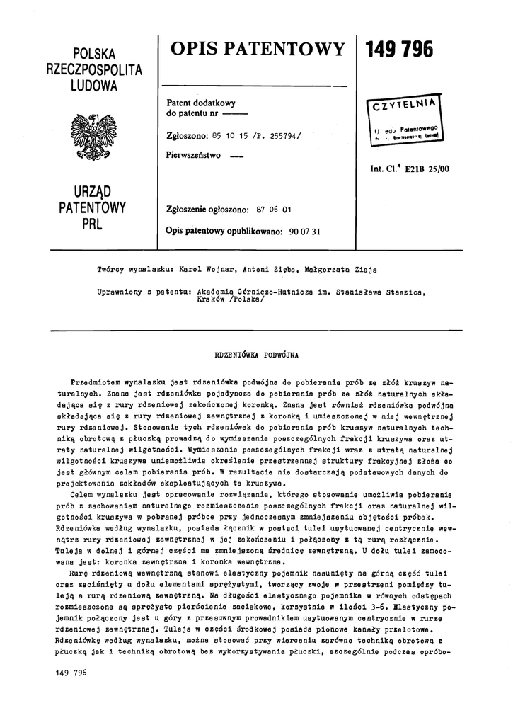 POLSKA OPIS PATENTOWY 149 796 37C^N7DACnAI ITA "iZbOZPOSPOLITA LUDOWA [czytelnia! Patent dodatkowy do patentu nr fili "W Zgłoszono: 85 10 15 /P. 255794/ Pierwszeństwo 1 u edu Polotowego 1 — Int. CL4 E21B 25/00 URZĄD PATENTOWY PRL Zgłoszenie ogłoszono: 87 06 01 Opis patentowy opublikowano: 90 07 31 Twórcy wynalazku: Karol Wojnar, Antoni Zięba, Małgorzata Ziaja Uprawniony z patentu: Akademia Górniczo-Hutnicza im. Stanisława Staszica, Kraków /Polska/ RDZENIÓWKA PODWÓJNA Przedmiotem wynalazku jest rdzeniówka podwójna do pobierania prób ze złóż kruszyw na¬ turalnych. Znana jest rdzeniówka pojedyncza do pobierania prób ze złóż naturalnych skła¬ dająca się z rury rdzeniowej zakończonej koronką. Znana jest również rdzeniówka podwójna składająca się z rury rdzeniowej zewnętrznej z koronką i umieszczonej w niej wewnętrznej rury rdzeniowej. Stosowanie tych rdzeniówek do pobierania prób kruszyw naturalnych teohniką obrotową z płuczką prowadzą do wymieszania poszczególnych frakcji kruszywa oraz ut¬ raty naturalnej wilgotności. Wymieszanie poszczególnych frakcji wraz z utratą naturalnej wilgotnośoi kruszywa uniemożliwia określenie przestrzennej struktury frakcyjnej złoża oo jest głównym celem pobierania prób. W rezultacie nie dostarczają podstawowych danych do projektowania zakładów eksploatujących te kruszywa. Celem wynalazku jest opracowanie rozwiązania, którego stosowanie umożliwia pobieranie prób z zachowaniem naturalnego rozmieszczenia poszczególnych frakcji oraz naturalnej wil¬ gotności kruszywa w pobranej próbce przy jednoczesnym zmniejszeniu objętości próbek. Rdzeniówka według wynalazku, posiada łącznik w postaci tulei usytuowanej centrycznie wew¬ nątrz rury rdzeniowej zewnętrznej w jej zakończeniu i połączony z tą rurą rozłącznie. Tuleja w dolnej i górnej części ma zmniejszoną średnicę zewnętrzną. U dołu tulei zamooowana jest: koronka zewnętrzna i koronka wewnętrzna. Rurę rdzeniową wewnętrzną stanowi elastyczny pojemnik nasunięty na górną część tulei oraz zaciśnięty u dołu elementami sprężystymi, tworzący zwoje w przestrzeni pomiędzy tu¬ leją a rurą rdzeniową zewnętrzną* Na długości elastycznego pojemnika w równyoh odstępach rozmieszczone są sprężyste pierścienie zaoiskowe, korzystnie w ilości 3-6. Elastyczny po¬ jemnik połączony jest u góry z przesuwnym prowadnikiem usytuowanym centrycznie w rurze rdzeniowej zewnętrznej. Tuleja w ozęśoi środkowej posiada pionowe kanały przelotowe. Rdzeniówkę według wynalazku, można stosować przy wierceniu zarówno techniką obrotową z płuczką jak i techniką obrotową bez wykorzystywania płuczki, szczególnie podczas opróbo149 796 149 796 2 wywania złóż kruszyw naturalnych zawodnionych. Wynalazek umożliwia dokładne określenie granio oraz głębokości zalegania poszczególnych frakcji kruszyw naturalnyoh, oo elimi¬ nuje pomyłki w projektowaniu zakładów przeróbczych obniżając koszty. Rdzeniówka według wynalazku, może być również zastosowana do pobierania rdzeni o na¬ turalnej zawartości różnych mediów występujących w złożu. Przedmiot wynalazku uwidocznio¬ ny jest w przykładzie wykonania na rysunku, na którym fig. 1 przedstawia schemat ideowy rdzeniówki w początkowym okresie wiercenia, fig. 2 - przekrój poprzeczny rdzeniówki wed¬ ług linii A-A oznaczonej na fig. 1, a fig. 3 przedstawia schemat ideowy rdzeniówki w końcowym procesie wiercenia. Jak przedstawia fig. 1 do rury rdzeniowej zewnętrznej 1 przyłączony jest rozłącznie łącznik w postaoi tulei 3 umożliwiającej zamocowanie dwóch koronek: koronki zewnętrznej 2 i koronki wewnętrznej 13* Rurę rdzeniową wewnętrzną stanowi foliowy pojemnik 7 nasunię¬ ty na górną część tulei 3 tworzący zwoje w przestrzeni pomiędzy tuleją 3 a rurą Rdzenio¬ wą zewnętrzną 1. Foliowy pojemnik 7 zaciśnięty jest u dołu tulei 3 elementami sprężystymi 9 w postaoi pierścienia o przekroju kołowym. Na długości foliowego pojemnika 7 w równych odstępach rozmieszczone są 3 sprężyste pierścienie zaciskowe 4 o przekroju owalnym. Prawidłowe prowadzenie foliowego pojemnika 7 zapewnia trójskrzydłowy prowadnik 5t któ¬ ry umocowany jest na obudowie zaworu kulowego 6. Prawidłowe działanie rdzeniówki zapewnia¬ ją kanały przelotowe 10 dla płuczki i zawory kulowe 8 usytuowane w łączniku 11 łączącym rdzeniówkę z przewodem wiertniczym 12. W procesie wiercenia w luźnych warstwach następuje wypełnienie etapami foliowego pojemnika 7 i zaciskanie pierścieniami sprężystymi 4 po¬ szczególnych jego odcinków. Po wypełnieniu foliowego pojemnika 7 rdzeniem i wyciągnięciu przewodu wiertniczego 12 na powierzchnię, odkręcamy tuleję 3 wraz z koronkami 2, 13» co umożliwia wyjęcie pojemnika, odkręcenie trójskrzydłowego prowadnika 5 i oddanie próbki wraz z opakowaniem do badań laboratoryjnych. Dalsze wiercenie prowadzimy zakładając do rdzeniówki inny foliowy pojemnik. Pojemnik jest opakowaniem wielokrotnego użycia i umoż¬ liwia wstępną ocenę próbki bez jej wyciągania z wnętrze dzięki swojej przezroczystości. Możliwe jest również wykorzystanie traconej części próbki na długości tulei 3 przy zamk¬ nięciu przelotu koronki wewnętrznej 13* W miarę potrzeby można zastosować ułożyskowania w prowadniku 5 i elemencie sprężystym 9 aby pojemnik 7 nie obracał się względem rdzenia. W zależności od własności przewiercanych warstw do tulei 3 można mocować dowolne ko¬ ronki wiertnicze na przykład diamentowe, słupkowe, gryzowe, zębate. Zastrzeżenia patentowe 1. Rdzeniówka podwójna, składająca się z rury rdzeniowej zewnętrznej, rury rdzeniowej wewnętrznej oraz łącznika do mocowania rury rdzeniowej wewnętrznej, znamię nna t y m, że łącznik ma postać tulei /3/ usytuowanej centrycznie wewnątrz rury rdzeniowej zewnętrznej /1/ w jej zakończeniu i połączon