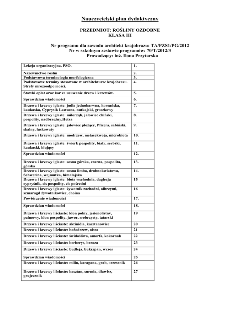Nauczycielski plan dydaktyczny PRZEDMIOT: ROŚLINY OZDOBNE KLASA III Nr programu dla zawodu architekt krajobrazu: TA/PZS1/PG/2012 Nr w szkolnym zestawie programów: 70/T/2012/3 Prowadzący: inż. Ilona Przytarska Lekcja organizacyjna. PSO. 1. Nazewnictwo roślin Podstawowa terminologia morfologiczna Podstawowe terminy stosowane w architekturze krajobrazu. Strefy mrozoodporności. 2. 3. 4. Stawki opłat oraz kar za usuwanie drzew i krzewów. 5. Sprawdzian wiadomości 6. Drzewa i krzewy iglaste: jodła jednobarwna, koreańska, kaukaska, Cyprysik Lawsona, nutkajski, groszkowy Drzewa i krzewy iglaste: miłorząb, jałowiec chiński, pospolity, nadbrzeżny,Hetza 7. 8. Drzewa i krzewy iglaste: jałowiec płożący, Pfizera, sabiński, skalny, łuskowaty 9. Drzewa i krzewy iglaste: modrzew, metasekwoja, microbiota 10. Drzewa i krzewy iglaste: świerk pospolity, biały, serbski, kaukaski, kłujący 11. Sprawdzian wiadomości 12. Drzewa i krzewy iglaste: sosna górska, czarna, pospolita, górska Drzewa i krzewy iglaste: sosna limba, drobnokwiatowa, Schwerina, wejmutka, himalajska Drzewa i krzewy iglaste: biota wschodnia, daglezja cypryśnik, cis pospolity, cis pośredni Drzewa i krzewy iglaste: żywotnik zachodni, olbrzymi, szmaragd żywotnikowiec, choina Powtórzenie wiadomości 13. 14. 15 16 17. Sprawdzian wiadomości 18. Drzewa i krzewy liściaste: klon polny, jesionolistny, palmowy, klon pospolity, jawor, srebrzysty, tatarski 19 Drzewa i krzewy liściaste: aktinidia, kasztanowiec 20 Drzewa i krzewy liściaste: bożodrzew, olsza 21 Drzewa i krzewy liściaste: świdośliwa, amorfa, kokornak 22 Drzewa i krzewy liściaste: berberys, brzoza 23 Drzewa i krzewy liściaste: budleja, bukszpan, wrzos 24 Sprawdzian wiadomości 25 Drzewa i krzewy liściaste: milin, karagana, grab, orzesznik 26 Drzewa i krzewy liściaste: kasztan, surmia, dławisz, grujecznik 27 Drzewa i krzewy liściaste: pigwowiec 28 Drzewa i krzewy liściaste: powojnik 29 Drzewa i krzewy liściaste: dereń, leszczyna 30 Drzewa i krzewy liściaste: perukowiec, irga 31 Drzewa i krzewy liściaste: głóg, szczodrzeniec, wawrzynek 32 Drzewa i krzewy liściaste: żylistek, oliwnik, wrzosiec 33 Drzewa i krzewy liściaste: trzmielina, buk 34 Drzewa i krzewy liściaste: rdestówka, forsycja, jesion 35 Drzewa i krzewy liściaste: glediczja, oczar, bluszcz, rokitnik 36 Drzewa i krzewy liściaste: hortensja Drzewa i krzewy liściaste: orzech, złotlin, kolkwicja, złotokap 37 38 Drzewa i krzewy liściaste: lawenda, ligustr 39 Sprawdzian wiadomości 40 Drzewa i krzewy liściaste: ambrowiec, tulipanowiec, suchodrzew Drzewa i krzewy liściaste: wiciokrzew, kolcowój 41 42 Drzewa i krzewy liściaste: magnolia, mahonia 43 Drzewa i krzewy liściaste: jabłoń, morwa 44 Drzewa i krzewy liściaste: runianka, winobluszcz, korkowiec Drzewa i krzewy liściaste: jaśminowiec, pęcherznica, platan 45 46 Drzewa i krzewy liściaste: topola 47 Drzewa i krzewy liściaste: pięciornik, ałycza, wiśnia osobliwa, laurowiśnia, wiśnia wonna 48 Drzewa i krzewy liściaste: czeremcha, wiśnia piłkowana, migdałek Sprawdzian wiadomości 49 50 Drzewa i krzewy liściaste: skrzydłorzech, ognik, grusza 51 Drzewa i krzewy liściaste: dąb 52 Drzewa i krzewy liściaste: różanecznik, azalia 53 Drzewa i krzewy liściaste: sumak, porzeczka, robinia, róża 54 Drzewa i krzewy liściaste: wierzba, bez, tawlina 55 Drzewa i krzewy liściaste: jarząb, tawuła 56 Drzewa i krzewy liściaste: tawulec, śnieguliczka 57 Drzewa i krzewy liściaste: lilak, tamaryszek 58 Drzewa i krzewy liściaste: lipa 59 Drzewa i krzewy liściaste: wiąz 60