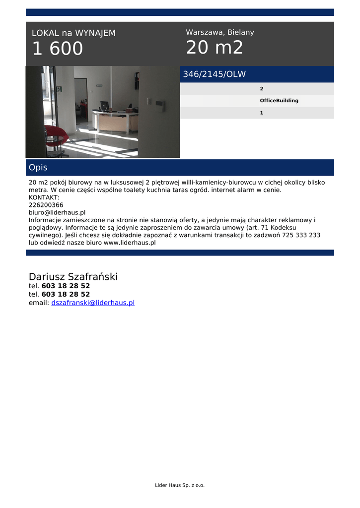 LOKAL na WYNAJEM 1 600 Warszawa, Bielany 20 m2 346/2145/OLW 2 OfficeBuilding 1 Opis 20 m2 pokój biurowy na w luksusowej 2 piętrowej willi-kamienicy-biurowcu w cichej okolicy blisko metra. W cenie części wspólne toalety kuchnia taras ogród. internet alarm w cenie. KONTAKT: 226200366 [email protected] Informacje zamieszczone na stronie nie stanowią oferty, a jedynie mają charakter reklamowy i poglądowy. Informacje te są jedynie zaproszeniem do zawarcia umowy (art. 71 Kodeksu cywilnego). Jeśli chcesz się dokładnie zapoznać z warunkami transakcji to zadzwoń 725 333 233 lub odwiedź nasze biuro www.liderhaus.pl Dariusz Szafrański tel. 603 18 28 52 tel. 603 18 28 52 email: [email protected] Lider Haus Sp. z o.o. Powered by TCPDF (www.tcpdf.org)