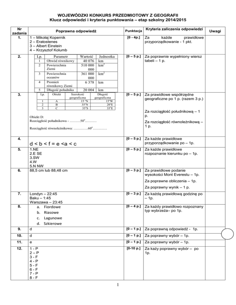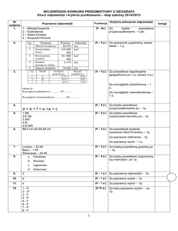 WOJEWÓDZKI KONKURS PRZEDMIOTOWY Z GEOGRAFII Klucz odpowiedzi i kryteria punktowania – etap szkolny 2014/2015 Nr Poprawna odpowiedź zadania 1. 1 – Mikołaj Kopernik 2 – Eratostenes 3 – Albert Einstein 4 – Krzysztof Kolumb 2. Lp. Parametr 1 2 Obwód równikowy Powierzchnia Ziemi Powierzchnia oceanów Promień równikowy Ziemi Długość południka 3 4 5 3. Lp. Obiekt 1 2 3 A B C Wartość 40 076 510 000 000 361 000 000 6 378 Jednostka km km2 [0 - 4p.] Za każde prawidłowe przyporządkowanie - 1 pkt. [0 – 5 p.] Za poprawnie wypełniony wiersz tabeli – 1 p. [0 – 5 p.] Za prawidłowe współrzędne geograficzne po 1 p. (razem 3 p.) km km Długość geograficzna 15oW 20oE 35oE Za rozciągłość południkową – 1 p. Obiekt D: Rozciągłość południkowa - ………50o.……… Za rozciągłość równoleżnikową – 1 p. o Rozciągłość równoleżnikowa: …………60 ………… 4. [0 – 5 p.] Za każde prawidłowe przyporządkowanie po – 1p. [0 – 5 p.] Za każde prawidłowe rozpoznanie kierunku po – 1p. [0 – 3 p.] Za prawidłowe podanie wysokości Mont Everestu – 1p. d < b < f = e <a < c 5. 6. Kryteria zaliczenia odpowiedzi km2 20 004 Szerokość geograficzna 15 oN 35oN 35oS Punktacja 1.NE 2.E SE 3.SW 4.W 5.N NW 88,5 cm lub 88,48 cm Za poprawne obliczenia – 1p. Za poprawny wynik – 1 p. 7. Londyn – 22:45 Baku – 1:45 Warszawa – 23:45 8. a. b. c. d. Fiordowe Riasowe Lagunowe Szkierowe [0 – 3 p.] Za każdą prawidłową godzinę po – 1p. [0 – 4 p.] Za każdy prawidłowo rozpoznany typ wybrzeża– po 1p. 9. d [0 – 1 p.] Za poprawną odpowiedź - 1p. 10. d [0 – 1 p.] Za poprawny wybór – 1p. 11. e [0 – 1 p.] Za poprawny wybór – 1p. 12. 1-P 2–P 3-F 4-P 5-F 6-F 7-P 8-F [0-10 p.] Za każy poprawny wybór – po 1p. 1 Uwagi 9-P 10 - F a [0 – 1 p.] Za poprawny wybór – 1p. 1. powstawanie gór 2. powstawanie rowów oceanicznych 3. wulkanizm 4. trzęsienia ziemi 5. rowy tektoniczne 6. grzbiety oceaniczne a. gejzer b. wykreślone: Litwa, Polska, Słowacja [0 – 3 p.] Każda poprawna odpowiedz – po 1p. [0 – 4 p.] 16. A. barchan B. paraboliczna [0 – 2 p.] Za poprawne nazwanie źródła – 1p. Za każde wykreślone państwo po 1 p. (max. 3 p.) Za prawidłowe nazwanie wydm – po 1 p. 17. Ciepły/ zimny prąd Kanaryjski/Północnoatlantycki wpływa na klimat Norwegii/Turcji podwyższając/obniżając temperaturę powietrza zimą oraz powoduje, że Murmańsk w Rosji, jest portem niezamarzającym/zamarzającym zimą. [0 – 5 p.] Za każde poprawne wykreślenie – po1p. 18. c [0 – 1 p.] Za poprawny wybór – 1p. 19. Pejpus, Uznam, Pustynia Błędowska, Apeniny, Korsyka, Sarema. [0 – 3 p.] Za poprawny wybór 13. 14. 15. 6 obiektów – 3 p. 5 – 2 p. 4 – 1 p. 20. Hasło: Unia Europejska 1 U R 2 A L N K I U R A N E L S I L W I A 5 W I E Ż Y C A 6 S U B D U K C 7 W R O C Ł A W 3 H 4 Za każdą prawidłową odpowiedź – po 1p. [0-14 p.] J A 8 O S U W I S K O 9 P O R T U G A L Z Y S K O M 10 W Y W I E R 11 A B R A Z J A 12 G O L F S Z T R O 13 B R U K S E A 14 E T N A L 80p. Razem 2 I A Za wykreślenie więcej niż 3 obiektów – 0 p. za tę część zadania