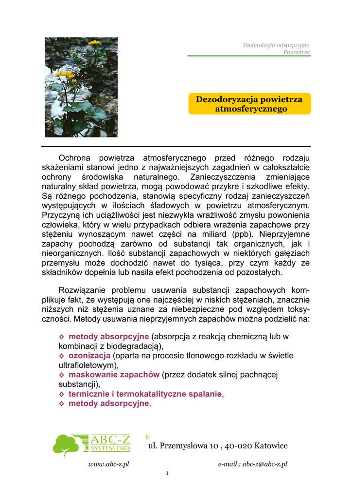 Technologia adsorpcyjna Powietrze Dezodoryzacja powietrza atmosferycznego Ochrona powietrza atmosferycznego przed różnego rodzaju skażeniami stanowi jedno z najważniejszych zagadnień w całokształcie ochrony środowiska naturalnego. Zanieczyszczenia zmieniające naturalny skład powietrza, mogą powodować przykre i szkodliwe efekty. Są różnego pochodzenia, stanowią specyficzny rodzaj zanieczyszczeń występujących w ilościach śladowych w powietrzu atmosferycznym. Przyczyną ich uciążliwości jest niezwykła wrażliwość zmysłu powonienia człowieka, który w wielu przypadkach odbiera wrażenia zapachowe przy stężeniu wynoszącym nawet części na miliard (ppb). Nieprzyjemne zapachy pochodzą zarówno od substancji tak organicznych, jak i nieorganicznych. Ilość substancji zapachowych w niektórych gałęziach przemysłu może dochodzić nawet do tysiąca, przy czym każdy ze składników dopełnia lub nasila efekt pochodzenia od pozostałych. Rozwiązanie problemu usuwania substancji zapachowych komplikuje fakt, że występują one najczęściej w niskich stężeniach, znacznie niższych niż stężenia uznane za niebezpieczne pod względem toksyczności. Metody usuwania nieprzyjemnych zapachów można podzielić na: ◊ metody absorpcyjne (absorpcja z reakcją chemiczną lub w kombinacji z biodegradacją), ◊ ozonizacja (oparta na procesie tlenowego rozkładu w świetle ultrafioletowym), ◊ maskowanie zapachów (przez dodatek silnej pachnącej substancji), ◊ termicznie i termokatalityczne spalanie, ◊ metody adsorpcyjne. ® ul. Przemysłowa 10 , 40-020 Katowice . www.abc-z.pl e-mail : [email protected] 1 Technologia adsorpcyjna Powietrze Dezodoryzacja powietrza atmosferycznego Jedną z najprostszych i godnych polecenia jest metoda adsorpcyjna. Pozwala w łatwy sposób usunąć przykre zapachy. Do procesu filtracji powierza używa się różnego rodzaju rozwiązań np.: - filtry z granulowanym węglem aktywnym, - masy filtracyjne z naniesionym węglem aktywnym, - aktywne włókna węglowe. Efektywny czas trwałości filtru zależy od warunków stosowania, temperatury i wilgotności powietrza, a przede wszystkim od ilości i charakteru zanieczyszczeń. ® ul. Przemysłowa 10 , 40-020 Katowice . www.abc-z.pl e-mail : [email protected] 2