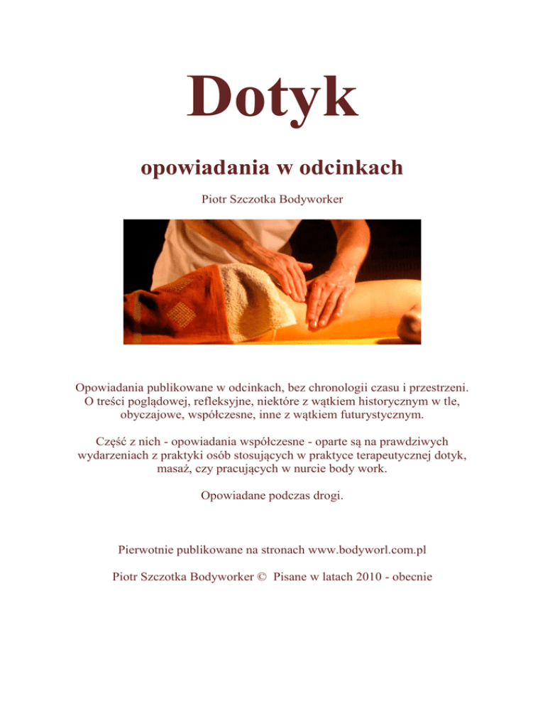 Dotyk opowiadania w odcinkach Piotr Szczotka Bodyworker Opowiadania publikowane w odcinkach, bez chronologii czasu i przestrzeni. O treści poglądowej, refleksyjne, niektóre z wątkiem historycznym w tle, obyczajowe, współczesne, inne z wątkiem futurystycznym. Część z nich - opowiadania współczesne - oparte są na prawdziwych wydarzeniach z praktyki osób stosujących w praktyce terapeutycznej dotyk, masaż, czy pracujących w nurcie body work. Opowiadane podczas drogi. Pierwotnie publikowane na stronach www.bodyworl.com.pl Piotr Szczotka Bodyworker © Pisane w latach 2010 - obecnie Wymarzone wakacje z dodatkową niespodzianką Anna dopakowała kilka osobistych rzeczy i zerknęła na zegar. Kuzyn miał się zaraz pojawić, a to była jej coroczna podróż na którą pakowała się raczej symbolicznie. Nie było potrzeby, aby się spieszyć. Spakowała kolejne dwie książki i wygodnie usiadła w fotelu. Do domu kuzynostwa na skraju miasta jechali przez zatłoczone miasto ponad pół godziny, co w przypadku tego miasta było raczej rekordowe o tej porze dnia. Rozmawiali spokojnie, kuzyn sprawnie prowadził, jednocześnie tłumacząc co i jak się zmieniło w systemie zasilającym dom i ogród. Wjechali na podjazd posesji, wysiedli z samochodu. Anna przywitała się z wszystkimi, ekscytacja dosięgała zenitu, z trudem sama ukrywała że cieszy się na te kolejne wakacje. Od prawie 17-tego roku życia pracowała jako pomocnik przewodnika, potem sama podjęła pracę w biurze turystycznym. Zwiedziła przeróżne zakątki nie tylko Europy. Pakowanie, sen, przesiadanie, odliczanie, rejestracja gości, pakowanie, sen, liczenie uczestników, pilnowanie i tak w kółko, obrazy te przemknęły jej przez myśl, patrząc na pakującą się rodzinę. Odkąd zaproponowali jej pomoc w pilnowaniu ich rozległego domu, coraz bardziej nie miała ochoty na wakacyjne wyjazdy gdziekolwiek. Małe mieszkanie jej w zupełności wystarczało, zresztą jak na obieżyświata przystało, traktowała go trochę jako sypialnię. Dlatego też, dom kuzynostwa jawił się jak pobyt w naturalnym, wymarzonym Spa. Zresztą był tak urządzony, że niektórzy projektanci mogli by się na nim uczyć. Dom nie był sporych rozmiarów w porównaniu z sąsiednimi, ale niezwykle przemyślany, dając poczucie wspólnoty, a zarazem można było się schować w jego licznych zakamarkach. Annę przywitał pies i dwa łaszące się koty. Ostatnie wskazówki co do sprzętu, koperta z rachunkami, pieniądze na zakupy, kilka ważnych adresów i danych. Była też druga koperta. - Anno tą otwórz później, ale koniecznie dzisiaj, przed godziną 17 00. Ok? - Dobrze, dobrze – odpowiedziała. Wszystkim udzielał się coraz lepszy humor. Po pół godziny została sama, ale nie samotna. Odwiedziła spokojnie najważniejsze zakamarki posesji i domu który uwielbiała. Obszerny pokój łazienny z sauną, stołem do zabiegów, kupionym przez kuzyna wraz ze stołem bilardowym. Jak zwykł mawiać w jednym pakiecie. Ten pierwszy zabiegowy, służył czasem nie tylko do masażu, ale jako „szwedzki stół” jak podczas rodzinnych uroczystości gdy zabrakło podręcznych stołów na drobne przekąski. Wszyscy się śmiali że tak przesiąkł zapachami dań, że zapewne podczas masażu nie jednego skręcało z głodu. Przeszła się po ogrodzie, basen letni był już rozstawiony. Słońce jeszcze mocno grzało, było po 16 – tej. Pomyślała o kąpieli, książkach i następnym tygodniu w tym uroczym miejscu. Podeszła do torby aby przebrać się w strój kąpielowy, kiedy nagle zadzwonił telefon. - A wy gdzie – zapytała ? - A daj spokój, jeszcze nie wylecieliśmy nawet, siedzimy na lotnisku już 2 godziny, jest opóźnienie. Ale samolot na szczęście już przyleciał. Dzwonię czy wszystko ok. Głos żony kuzyna był spokojny ale i tajemniczy. - Anno czy otworzyłaś drugą kopertę? - Ojej, zapomniałam, a to coś ważnego? - Dla ciebie tak! Myślę że tak. No i wszystkiego najlepszego z okazji imienin. Roześmiała się. Anna sięgnęła po kopertę, otworzyła i wysypały się małe kartonowe kartki. Popatrzyła na pierwszą z dzisiejsza datą: „Środa, godzina 17 00 masaż w domu, zgodnie z ofertą gabinetu” ….. Druga kartka: „Czwartek, godzina 17 00 kosmetyka do wyboru z oferty”, trzecia kartka: „Piątek godzina 17 00 masaż w domu” … itd. Rozbawiło ją to, wiedzieli bowiem jak uwielbia masaż i jak jednocześnie w swoim zabieganiu ma na niego mało czasu, nie tyle ile by chciała. Gorąco podziękowała kuzynce i życzyła miłego lotu, oczyma wyobraźni była z nimi na lotnisku: tłum, zmęczone dzieciaki, podenerwowanie, oczekiwanie, itd. Chyba nic nie było by w stanie jej teraz zaciągnąć do wyjazdu, tym bardziej na lotnisko. Popatrzyła na zadbany, aczkolwiek minimalistyczny ogród zgodny z dewizą kuzyna: „ To ogród jest dla nas, a nie my dla ogrodu”. Popatrzyła na zegarek, była 16:20. Od razu spojrzała na bezchmurne niebo, potem pobiegła na pierwszy poziom domu, gdzie stał stół do masażu. Uśmiechając się złożyła go i przeniosła do pobliskiej altanki, w której w letnie dni korzystali z zabiegów. Rozłożyła go, nakryła i pobiegła pod prysznic. Coraz bardziej podekscytowana po kwadransie czekała z filiżanką herbaty. Znajome logo firmy na zaproszeniu, nie dawało jej złudzeń że będzie to rewelacyjny początek wakacji. Sama w wielkim mieście, ale nie samotna. Dom kuzynostwa był jak wyspa. Zielona dosłownie, pełna uroku, wszystko było tak bardzo na miejscu. Zadzwonił dzwonek, popatrzyła kto przyszedł. W drzwiach pojawił się zaprzyjaźniony od lat masażysta. Wiedziała że to będzie bajeczny wieczór. Przywitali się, nie musiała się spieszyć. Krzysztof nigdy nie pracował w pośpiechu, ani też nie stwarzał pozorów wiecznie zabieganego terapeuty. Był niezwykle stonowany, zapytał czy chce mieć masaż wykonany przez niego, czy przez koleżankę, któ