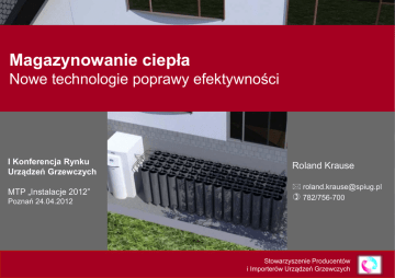 Magazynowanie ciepła Nowe technologie poprawy efektywności I Konferencja Rynku Urządzeń Grzewczych Roland Krause MTP „Instalacje 2012” [email protected] 782/756-700 Poznań 24.04.2012 Stowarzyszenie Producentów i Importerów Urządzeń Grzewczych Wyzwanie dla przyszłości energetyki ? Efektywne magazynowanie i wykorzystanie nadwyżek ciepła i innych form energii Stowarzyszenie Producentów i Importerów Urządzeń Grzewczych Potrzeba magazynowania ciepła – przykłady Moc (kW) Układy kogeneracyjne Instalacje słoneczne Niedobór ciepła Kocioł Kogeneracja Nadwyżka ciepła Nadwyżka ciepła Ciepło wykorzystane Czas Czas Stowarzyszenie Producentów i Importerów Urządzeń Grzewczych Możliwości magazynowania ciepła Stowarzyszenie Producentów i Importerów Urządzeń Grzewczych Magazynowanie ciepła – 2 podstawowe warianty… ZASOBNIK / WODA Dostarczanie ciepła podnosi temperaturę medium Stan skupienia nie zmienia się Wykorzystanie ciepła jawnego TERMOAKUMULATOR / PCM (Phase Change Material) Dostarczanie ciepła nie podnosi temperatury medium Stan skupienia zmienia się Wykorzystanie ciepła utajonego Stowarzyszenie Producentów i Importerów Urządzeń Grzewczych Przemiana fazowa, a ciepło do jej przeprowadzenia Ciepło potrzebne dla stopienia lodu ±0oC Ciepło potrzebne podgrzania wody 0÷80oC Wniosek? Wykorzystanie przemiany fazowej pozwala dostarczać i odbierać więcej ciepła Stowarzyszenie Producentów i Importerów Urządzeń Grzewczych Temperatura Termoakumulator z wykorzystaniem przemiany fazowej T1 Ciepło utajone (przemiana fazowa – topnienie) T2 T = 58oC Wykorzystanie OCTANU SODU pozwala obniżyć temperaturę przemiany (topnienia) do 58oC Ta sama ilość ciepła może być zgromadzona w niższej temperaturze, dzięki wykorzystaniu ciepła utajonego Zakumulowane ciepło Stowarzyszenie Producentów i Importerów Urządzeń Grzewczych Nazywany potocznie „ciepłym lodem” Nie jest niebezpieczny dla zdrowia w myśl obowiązujących przepisów Jeden z nielicznych związków chemicznych występujący w żywności Niepalny i niewybuchowy Nie wymagający regeneracji Biodegradacja: 99% (po 28 dniach) Pojemność cieplna znacznie wyższa niż dla wody Pojemność cieplna (kJ/kg) Octan sodu – cechy szczególne i zalety zastosowania Stowarzyszenie Producentów i Importerów Urządzeń Grzewczych Gdzie na co dzień wykorzystuje się mechanizm magazynowania ciepła? Ogrzewacze termiczne np. do dłoni Wykorzystanie octanu sodu Czas działania do 30 min. Temperatura do 54oC Uruchomienie „impulsem mechanicznym” Regeneracja przez wygotowanie Stowarzyszenie Producentów i Importerów Urządzeń Grzewczych Termoakumulatory – budowa i możliwości zabudowy Termoakumulatory budowane w formie zasobników zawierających 4÷6 cel z octanem sodu Zabudowa termoakumulatorów na zewnątrz lub wewnątrz budynku Źródło: ecotec-energiespartechnik.de, solarenergie-freund.de Stowarzyszenie Producentów i Importerów Urządzeń Grzewczych Termobaterie – przykład wykorzystania w systemie grzewczym domu Źródło: Isocal Heiz- Kühlsysteme, Friedrichshafen Stowarzyszenie Producentów i Importerów Urządzeń Grzewczych Termobaterie – faza pilotażu 2012 Pierwsze wdrożenia pilotażowe w Niemczech bazują na założeniach, że: Dom jednorodzinny: 140 m2 Zapotrzebowanie ciepła: 30 kWh/m2rok Liczba mieszkańców: 4 os. Zużycie ciepłej wody: 50 dm3/os.d Zapewnienie całkowitego rocznego zapotrzebowania na ciepło dzięki: 50 m2 instalacji słonecznej + 15 termobaterii (60 cel) Stowarzyszenie Producentów i Importerów Urządzeń Grzewczych Magazynowanie ciepła Nowe technologie poprawy efektywności Roland Krause MTP Instalacje 2012” Poznań 24.04.2012 [email protected] 782/756-700 Stowarzyszenie Producentów i Importerów Urządzeń Grzewczych