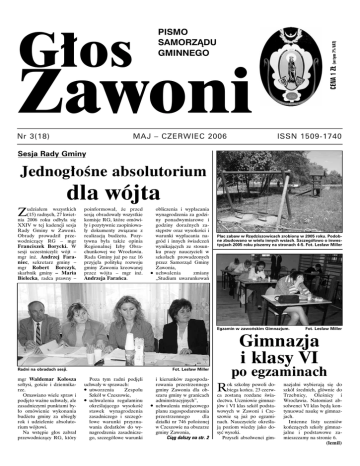 Głos CENA 1 ZŁ (w tym 7% VAT) PISMO SAMORZĄDU GMINNEGO Zawoni Nr 3(18) MAJ – CZERWIEC 2006 ISSN 1509-1740 Sesja Rady Gminy Jednogłośne absolutorium dla wójta udziałem wszystkich (15) radnych, 27 kwietnia 2006 roku odbyła się XXIV w tej kadencji sesja Rady Gminy w Zawoni. Obrady prowadził przewodniczący RG – mgr Franciszek Borycki. W sesji uczestniczyli: wójt – mgr inż. Andrzej Faraniec, sekretarz gminy – mgr Robert Borczyk, skarbnik gminy – Maria Bielecka, radca prawny – Z poinformował, że przed sesją obradowały wszystkie komisje RG, które omówiły i pozytywnie zaopiniowały dokumenty związane z realizacją budżetu. Pozytywna była także opinia Regionalnej Izby Obrachunkowej we Wrocławiu. Rada Gminy już po raz 16 przyjęła politykę rozwoju gminy Zawonia kreowanej przez wójta – mgr inż. Andrzeja Farańca. G obliczenia i wypłacania wynagrodzenia za godziny ponadwymiarowe i godziny doraźnych zastępstw oraz wysokości i warunki wypłacania nagród i innych świadczeń wynikających ze stosunku pracy nauczycieli w szkołach prowadzonych przez Samorząd Gminy Zawonia, uchwalenia zmiany „Studium uwarunkowań Plac zabaw w Rzędziszowicach zrobiony w 2005 roku. Podobne zbudowano w wielu innych wsiach. Szczegółowo o inwestycjach 2005 roku piszemy na stronach 4-5. Fot. Lesław Miller Egzamin w zawońskim Gimnazjum. Fot. Lesław Miller Gimnazja i klasy VI Radni na obradach sesji. mgr Waldemar Kołosza sołtysi, goście i dziennikarze. Omawiano wiele spraw i podjęto ważne uchwały, ale zasadniczymi punktami było omówienie wykonania budżetu gminy za ubiegły rok i udzielenie absolutorium wójtowi. Na wstępie głos zabrał przewodniczący RG, który po egzaminach Fot. Lesław Miller Poza tym radni podjęli uchwały w sprawach: G utworzenia Zespołu Szkół w Czeszowie, G uchwalenia regulaminu określającego wysokość stawek wynagrodzenia zasadniczego i szczegółowe warunki przyznawania dodatków do wynagrodzenia zasadniczego, szczegółowe warunki G i kierunków zagospodarowania przestrzennego gminy Zawonia dla obszaru gminy w granicach administracyjnych”, uchwalenia miejscowego planu zagospodarowania przestrzennego dla działki nr 746 położonej w Czeszowie na obszarze gminy Zawonia, Ciąg dalszy na str. 2 ok szkolny powoli dobiega końca. 23 czerwca zostaną rozdane świadectwa. Uczniowie gimnazjów i VI klas szkół podstawowych w Zawoni i Czeszowie są już po egzaminach. Nauczyciele określają poziom wiedzy jako dosyć wysoki. Przyszli absolwenci gim- R nazjalni wybierają się do szkół średnich, głównie do Trzebnicy, Oleśnicy i Wrocławia. Natomiast absolwenci VI klas będą kontynuować naukę w gimnazjach. Imienne listy uczniów kończących szkoły gimnazjalne i podstawowe zamieszczamy na stronie 6. (lemil) 2 Nr 3(18) GŁOS ZAWONI 16 absolutorium dla wójta gminy Urząd Gminy w Zawoni Dokończenie ze str. 1 G zmiany uchwały RG dla zagospodarowania przestrzennego terenu w Czeszowie, G wego dróg gminnych na cele niezwiązane z potrzebami zarządzania drogami lub potrzebami ruchu, zmian w budżecie gminy. kich składowisk śmieci oraz czystości w gminie. W tej sprawie wójt wyjaśnił, że realizowana jest akcja likwidacji dzikich wysypisk. W miejscach zlikwidowanych 55-106 Zawonia, ul. Trzebnicka 11 tel./fax (0-71) 312-81-82, 312-81-93 e-mail: [email protected] NIP: 915-10-10-521 Godziny otwarcia Urzędu Gminy: poniedziałki od 8.00 do 16.00 od wtorku do piątku od 7.30 do 15.30 I piętro Nr pokoju 1 2 3 4 5 6 7 Nr tel. wew. 31 46 44 45 41 Stanowiska pracy Sekretariat – podinspektor Jadwiga Bryłka Sekretarz Gminy – mgr Robert Borczyk Wójt Gminy – mgr inż. Andrzej Faraniec Magazyn obrony cywilnej Drogi, telefony, roboty publiczne – podinspektor Piotr Lis Biuro Rady Gminy Zawonia Sprzedaż i dzierżawa gruntów rolnych i budowlanych, najem lokali, dodatki mieszkaniowe, podział działek – podinspektor Wanda Łopyta Sołtysi przysłuchujący się obradom sesji. G II piętro 8 34 9 10 37 39 11 32 12 13 14 15 33 Meldunki, dowody osobiste, obrona cywilna, straż pożarna, wojskowość – podinspektor Wanda Mądra Skarbnik Gminy - Maria Bielecka Rolnictwo, gospodarka gruntami, budownictwo, gospodarka komunalna – podinspektor mgr Paulina Warzecha – podinspektor Jadwiga Wądołkowska Księgowość podatkowa: – wymiar podatków, wydawanie zaświadczeń o stanie majątkowym, wnioski o ulgi mieszkaniowe, zawieszenia, zwolnienia – podinspektor Leokadia Maciąg Terminowa realizacja zobowiązań pieniężnych, opłata za dostarczaną wodę, czynsz z tytułu najmu lokali mieszkaniowych i użytkowych, czynsz za dzierżawione grunty, prowadzenie postępowania egzekucyjnego w stosunku do zalegających – podinspektor Jadwiga Kaczmarek Archiwum Plany zagospodarowania przestrzennego – mgr inż. arch. Katarzyna Grochowska Rejestracja działalności gospodarczej, zezwolenia na sprzedaż alkoholu – podinspektor Kazimiera Grabkowska Sala konferencyjna Skargi i wnioski są przyjmowane codziennie w godzinach pracy przez Sekretarza Gminy – mgr Roberta Borczyka, pokój nr 2. G G G G uchwalenia miejscowego planu zagospodarowania przestrzennego terenu w Czeszowie, Programu Ochrony Środowiska dla Gminy Zawonia, Planu Gospodarki Odpadami dla Gminy Zawonia, górnych stawek opłat ponoszonych przez właścicieli nieruchomości za usługi w zakresie odbioru odpadów komunalnych oraz opróżniania zbiorników bezodpływowych w 2006 roku, ustalenia stawek opłat za zajmowanie pasa drogo- W wolnych wnioskach i interpelacjach zabrał głos radny Marian Podrygajło. Spośród wielu poruszonych spaw odniósł się do odśnieżania drogi w Pęciszowie. Radny powiedział, że podczas dużych opadów śniegu droga nie była właściwie utrzymana. Odpowiedzi udzielił wójt mówiąc, że trudne warunki panowały na wszystkich drogach, od gminnych po powiatowe i wojewódzkie. Jednakże w przypadku drogi w Pęciszowie, jej utrzymanie należał