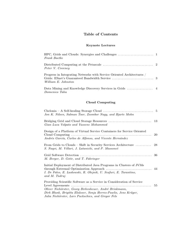 Table of Contents Keynote Lectures HPC, Grids and Clouds: Synergies and Challenges . . . . . . . . . . . . . . . . . . . . . . . . . 1 Frank Baetke Distributed Computing at the Petascale . . . . . . . . . . . . . . . . . . . . . . . . . . . . . . . . . . . 2 Peter V. Coveney Progress in Integrating Networks with Service Oriented Architectures / Grids: ESnet’s Guaranteed Bandwidth Service . . . . . . . . . . . . . . . . . . . . . . . . . . . . . 3 William E. Johnston Data Mining and Knowledge Discovery Services in Grids . . . . . . . . . . . . . . . . . . 4 Domenico Talia Cloud Computing Chelonia – A Self-healing Storage Cloud . . . . . . . . . . . . . . . . . . . . . . . . . . . . . . . . . . . 5 Jon K. Nilsen, Salman Toor, Zsombor Nagy, and Bjarte Mohn Bridging Grid and Cloud Storage Resources . . . . . . . . . . . . . . . . . . . . . . . . . . . . . . 13 Gian Luca Volpato and Yassene Mohammed Design of a Platform of Virtual Service Containers for Service Oriented Cloud Computing . . . . . . . . . . . . . . . . . . . . . . . . . . . . . . . . . . . . . . . . . . . . . . . . . . . . . . . . 20 Andrés García, Carlos de Alfonso, and Vicente Hernández From Grids to Clouds – Shift in Security Services Architecture . . . . . . . . . . . 28 S. Naqvi, M. Villari, J. Latanicki, and P. Massonet Grid Software Detection . . . . . . . . . . . . . . . . . . . . . . . . . . . . . . . . . . . . . . . . . . . . . . . . . . 36 M. Berger, D. Gstir, and T. Fahringer Initial Deployment of Distributed Java Programs in Clusters of JVMs through Extremal Optimization Approach . . . . . . . . . . . . . . . . . . . . . . . . . . . . . . . . 44 I. De Falco, E. Laskowski, R. Olejnik, U. Scafuri, E. Tarantino, and M. Tudruj Providing Scientific Software as a Service in Consideration of Service Level Agreements . . . . . . . . . . . . . . . . . . . . . . . . . . . . . . . . . . . . . . . . . . . . . . . . . . . . . . . . 55 Oliver Niehörster, Georg Birkenheuer, André Brinkmann, Dirk Blunk, Brigitta Elsässer, Sonja Herres-Pawlis, Jens Krüger, Julia Niehörster, Lars Packschies, and Gregor Fels Virtual Clusters as a New Service of MetaCentrum, the Czech NGI . . . . . . . 64 M. Ruda, Z. Šustr, J. Sitera, D. Antoš, L. Hejtmánek, P. Holub Virtualization – what can we Learn from Commercial Datacenters? . . . . . . . 72 I. Wawrzyniak Virtual Organisations Architecture for the Propagation of Changes of VO Membership Data to a Heterogeneous Application Landscape . . . . . . . . . . . . . . . . . . . . . . . . . . . . . . . 80 O. Strauß and A. Weisbecker Virtual Organization Security Layer Deployment Assistance . . . . . . . . . . . . . . 88 J. Fibinger, B. Puzoń, B. Kryza, R. Słota, and J. Kitowski Connecting Communities on the Meta-Scheduling Level: The DGSI Approach! . . . . . . . . . . . . . . . . . . . . . . . . . . . . . . . . . . . . . . . . . . . . . . . . . . . . . . . . . . . . . . . 96 Georg Birkenheuer, Arthur Carlson, Alexander Fölling, Mikael Högqvist, Andreas Hoheisel, Alexander Papaspyrou, Klaus Rieger, Bernhard Schott, and Wolfgang Ziegler Processing and Negotiation of Natural Language Based Contracts for Virtual Organizations . . . . . . . . . . . . . . . . . . . . . . . . . . . . . . . . . . . . . . . . . . . . . . . . . . . 104 Mikołaj Pastuszko, Bartosz Kryza, Renata Słota, and Jacek Kitowski Securing Software Licenses in a Location Independent Manner . . . . . . . . . . . 112 B. Hagemeier, D. Mallmann, and W. Ziegler Monitoring: Tools and Methods A Scalable Infrastructure for Job-Centric Monitoring Data from Distributed Systems . . . . . . . . . . . . . . . . . . . . . . . . . . . . . . . . . . . . . . . . . . . . . . . . . . . . . 120 Marcus Hilbrich and Ralph Müller-Pfefferkorn A Test Infrastructure for Inspecting the Availability of Grid Resources . . . 126 Jie Tao and Holger Marten Simon 6 – Monitoring UNICORE 6 Resources . . . . . . . . . . . . . . . . . . . . . . . . . . . 134 M. Rambadt and M. Romberg Online Retrieval, Evaluation and Visualisation of Messages in the UNICORE 6 Workflow System . . . . . . . . . . . . . . . . . . . . . . . . . . . . . . . . . . . . . . 143 S. Bergmann and B. Demuth Semantic-Based SLA-Oriented Performance Monitoring in the ProActive Environment . . . . . . . . . . . . . . . . . . . . . . . . . . . . . . . . . . . . . . . . . . . . . . . . . . . . . . . . . . . . 151 Dariusz Król and Włodzimierz Funika Integration of the OCM-G Monitoring System into the MonALISA Infrastructure . . . . . . . . . . . . . . . . . . . . . . . . . . . . . . . . . . . . . . . . . . . . . . . . . . . . . . . . . . . 158 Włodzimierz Funika, Bartosz Jakubowski, and Jakub Jaroszewski Virtual Laboratories and Workflow Systems A Priori Modeling of Chemical Reactions on a Grid-based Virtual Laboratory . . . . . . . . . . . . . . . . . . . . . . . . . . . . . . . . . . . . . . . . . . . . . . . . . . . . . . . . . . . . . . 164 S. Rampino, A. Monari, S. Evangelisti, E. Rossi, K. Ruud, and A. Laganà Secure Grid Workflow Repository for ASKALON . . . . . . . . . . . . . . . . . . . . . . . . 172 Malik Muhammad Junaid, Max Berger, Tomas Vitvar, and Thomas Fahringer Globus plug-in for WINGS Wokflow Engine . . . . . . . . . . . . . . . . . . . . . . . . . . . . . 179 C. de Alfonso, M. Caballer, V. Hernández, and E. Martí GRIF: a New Collaborative Grid Framework for SSCs . . . . . . . . . . . . . . . . . . . 188 C. Manuali and A. Laganà Molecular Distributed Computing on the Grid: Quantum Reactive Scattering and Visualization Tools . . . . . . . . . . . . . . . . . . . . . . . . . . . . . . . . . . . . . . 196 Alessandro Costantini, Osvaldo Gervasi, and Antonio Laganà Grid Middleware ValueGrids: Using Grids in Dynamic Service Value Networks . . . . . . . . . . . . 204 F. Schulz, C. Momm, D. Westermann, B. Blau, W. Michalk, M. Hedwig, D. Rolli, O.K. Afaghi, and A. Schmidt Extensions for the ETICS Client for Multi-Platform Support in NGIs Driven by User Requirements . . . .