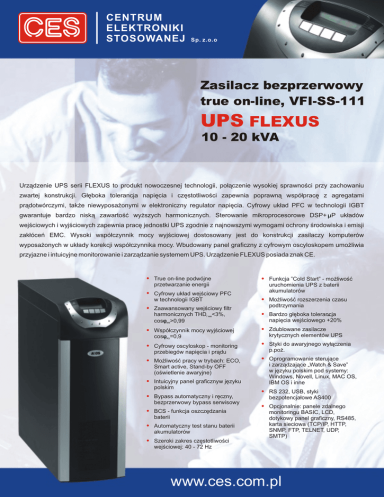 CENTRUM ELEKTRONIKI STOSOWANEJ Sp. z.o.o Zasilacz bezprzerwowy true on-line, VFI-SS-111 UPS FLEXUS 10 - 20 kVA Urz¹dzenie UPS serii FLEXUS to produkt nowoczesnej technologii, po³¹czenie wysokiej sprawnoœci przy zachowaniu zwartej konstrukcji. G³êboka tolerancja napiêcia i czêstotliwoœci zapewnia poprawn¹ wspó³pracê z agregatami pr¹dotwórczymi, tak¿e niewyposa¿onymi w elektroniczny regulator napiêcia. Cyfrowy uk³ad PFC w technologii IGBT gwarantuje bardzo nisk¹ zawartoœæ wy¿szych harmonicznych. Sterowanie mikroprocesorowe DSP+ P uk³adów wejœciowych i wyjœciowych zapewnia pracê jednostki UPS zgodnie z najnowszymi wymogami ochrony œrodowiska i emisji zak³óceñ EMC. Wysoki wspó³czynnik mocy wyjœciowej dostosowany jest do konstrukcji zasilaczy komputerów wyposa¿onych w uk³ady korekcji wspó³czynnika mocy. Wbudowany panel graficzny z cyfrowym oscyloskopem umo¿liwia przyjazne i intuicyjne monitorowanie i zarz¹dzanie systemem UPS. Urz¹dzenie FLEXUS posiada znak CE. ! True on-line podwójne przetwarzanie energii ! Cyfrowy uk³ad wejœciowy PFC w technologii IGBT ! Zaawansowany wejœciowy filtr harmonicznych THDI we<3%, cos we>0,99 ! Wspó³czynnik mocy wyjœciowej cos wy=0,9 ! Cyfrowy oscyloskop - monitoring przebiegów napiêcia i pr¹du ! Mo¿liwoœæ pracy w trybach: ECO, Smart active, Stand-by OFF (oœwietlenie awaryjne) ! Intuicyjny panel graficznyw jêzyku polskim ! Bypass automatyczny i rêczny, bezprzerwowy bypass serwisowy ! BCS - funkcja oszczêdzania baterii ! Automatyczny test stanu baterii akumulatorów ! Szeroki zakres czêstotliwoœci wejœciowej: 40 - 72 Hz ! Funkcja ”Cold Start” - mo¿liwoœæ uruchomienia UPS z baterii akumulatorów ! Mo¿liwoœæ rozszerzenia czasu podtrzymania ! Bardzo g³êboka tolerancja napiêcia wejœciowego +20% ! Zdublowane zasilacze krytycznych elementów UPS ! Styki do awaryjnego wy³¹czenia p.po¿. ! Oprogramowanie steruj¹ce i zarz¹dzaj¹ce „Watch & Save” w jêzyku polskim pod systemy: Windows, Novell, Linux, MAC OS, IBM OS i inne ! RS 232, USB, styki bezpotencja³owe AS400 ! Opcjonalnie: panele zdalnego monitoringu BASIC, LCD, dotykowy panel graficzny, RS485, karta sieciowa (TCP/IP, HTTP, SNMP, FTP, TELNET, UDP, SMTP) www.ces.com.pl UPS Flexus WYJŒCIE WEJŒCIE MODEL kVA Napiêcie wejœciowe prostownika Czêstotliwoœæ Napiêcie wejœciowe bypassu Zniekszta³cenia pr¹du (THDI) Wspó³czynnik mocy Moc znamionowa Napiêcie Stabilnoœæ napiêcia Kszta³t napiêcia Czêstotliwoœæ V Hz V % % kVA kW V % Hz Stabilnoœæ czêstotliwoœci % SYSTEM Wspó³czynnik szczytu (CF) Przeci¹¿enie, przy cos =0,8 %Pn Czas prze³¹czenia Ca³kowita sprawnoœæ AC-AC Podwójna konwersja energii Sprawnoœæ w trybie ECO Bypass Wysokoœæ robocza Temperatura pracy Wilgotnoœæ (bez kondensacji) Poziom ha³asu Normy ms % FT 10 FT 15 FT 20 400 + N, +20% -40% do +20% dla 50% obci¹¿enia 40-72 400 + N (opcja) <3% >0,99 10 12 15 20 9 10,8 13,5 18 400 + N +1 Sinusoidalny, THD=1% 50/60 wybieralna 0,01 przy braku synchronizacji z sieci¹ zasilaj¹c¹ lub przy pracy z baterii 3:1 Inwerter: 115% ci¹gle, 125% przez 10 min., 150% przez 1 min. Bypass: 133% przez 60 min., 150% przez 10 min. 0 (true on-line) >93,5 % >93,6 >94,0 >94,0 >98 Statyczny + rêczny, bezprzerwowy dla celów konserwacji 1000 (bez pogorszenia parametrów) 0-40 (najlepsza dla baterii od 15 do 25) <95 <48 <52 Bezpieczeñstwo: EN 62040-1-1, dyrektywy 73/23/EEC i 93/68/EEC Kompatybilnoœæ EMC: EN 62040-2 czêœæ 2, dyrektywy 2004/108/EEC, 93/68/EEC i 89/336/EEC Klasyfikacja wg normy IEC 62040-3: VFI-SS-111 m n.p.m 0 C % dB(A) Zdalna sygnalizacja Stopieñ ochrony Interfejs FT 12 Styki bezpotencja³owe (AS400) + pomocnicze Ÿród³o zasilania IP 20 RS232, USB, wyjœcia typu OC Slot na opcje: 1. Adapter sieciowy NETMAN 102p (protokó³ TCP/IP, HTTP, SNMP, FTP, TELNET, UDP, SMTP) zdalnie konfigurowalny przez sieæ. 2. MULTICOM 302-RS232+RS484 z protoko³em JBUS/MODBUS. 3. MOLTICOM 352 duplexer (2xRS232) Zdalne wy³¹czenie EPO (p.po¿.), wy³¹czenie falownika, za³¹czenie bypassu RAL 7024 (ciemnoszary) Zdalne sterowanie Kolor obudowy Masa z bateriami Czas podtrzymania* Wymiary (szer. x g³. x wys.) kg 185 187 195 min. mm 15 12 8 320 x 840 x 930 195 5 *Czasy podtrzymania podano dla typowego obci¹¿enia. Wyd³u¿enie czasu podtrzymania na zapytanie Pozosta³e urz¹dzenia zasilania rezerwowego oferowane przez CES: UPS SENTINEL 5 PLUS 6 - 10 kVA UPS SENTRY MULTISTANDARD 10 - 30 kVA UPS SENTRY MULTISTANDARD 40 - 80 kVA UPS SENTRY MPS 100 - 800 kVA 30-347 Kraków, ul. Wadowicka 3, tel.: 12 269 00 11, fax: 12 267 37 28; www.ces.com.pl, e-mail:[email protected] AGREGATY PR¥DOTWÓRCZE 2,2 - 2800 kVA ISO 9001-2000 UPS SENTINEL 6 0,7 - 3 kVA