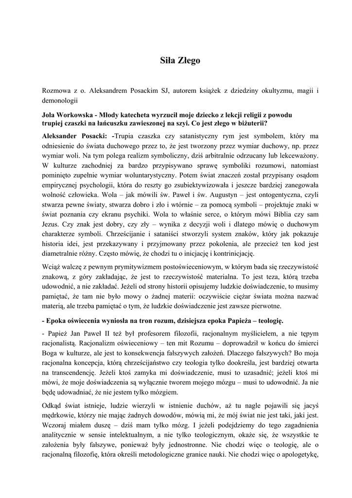 Siła Złego Rozmowa z o. Aleksandrem Posackim SJ, autorem książek z dziedziny okultyzmu, magii i demonologii Jola Workowska - Młody katecheta wyrzucił moje dziecko z lekcji religii z powodu trupiej czaszki na łańcuszku zawieszonej na szyi. Co jest złego w biżuterii? Aleksander Posacki: -Trupia czaszka czy satanistyczny rym jest symbolem, który ma odniesienie do świata duchowego przez to, że jest tworzony przez wymiar duchowy, np. przez wymiar woli. Na tym polega realizm symboliczny, dziś arbitralnie odrzucany lub lekceważony. W kulturze zachodniej za bardzo przypisywano sprawę symboliki rozumowi, natomiast pominięto zupełnie wymiar woluntarystyczny. Potem świat znaczeń został przypisany osądom empirycznej psychologii, która do reszty go zsubiektywizowała i jeszcze bardziej zanegowała wolność człowieka. Wola – jak mówili św. Paweł i św. Augustyn – jest ontogentyczna, czyli stwarza pewne światy, stwarza dobro i zło i wtórnie – za pomocą symboli – projektuje znaki w świat poznania czy ekranu psychiki. Wola to właśnie serce, o którym mówi Biblia czy sam Jezus. Czy znak jest dobry, czy zły – wynika z decyzji woli i dlatego mówię o duchowym charakterze symboli. Chrześcijanie i sataniści stworzyli system znaków, który jak pokazuje historia idei, jest przekazywany i przyjmowany przez pokolenia, ale przecież ten kod jest diametralnie różny. Często mówię, że chodzi tu o inicjację i kontrinicjację. Wciąż walczę z pewnym prymitywizmem postoświeceniowym, w którym bada się rzeczywistość znakową, z góry zakładając, że jest to rzeczywistość materialna. To jest teza, którą trzeba udowodnić, a nie zakładać. Jeżeli od strony historii opisujemy ludzkie doświadczenie, to musimy pamiętać, że tam nie było mowy o żadnej materii: oczywiście ciężar świata można nazwać materią, ale trzeba pamiętać o tym, że ludzkie doświadczenie jest zawsze pierwotne. - Epoka oświecenia wyniosła na tron rozum, dzisiejsza epoka Papieża – teologię. - Papież Jan Paweł II też był profesorem filozofii, racjonalnym myślicielem, a nie tępym racjonalistą. Racjonalizm oświeceniowy – ten mit Rozumu – doprowadził w końcu do śmierci Boga w kulturze, ale jest to konsekwencja fałszywych założeń. Dlaczego fałszywych? Bo moja racjonalna koncepcja, którą chrześcijaństwo czy teologia tylko dookreśla, jest bardziej otwarta na transcendencję. Jeżeli ktoś zamyka mi doświadczenie, musi to uzasadnić; jeżeli ktoś mi mówi, że moje doświadczenia są wyłącznie tworem mojego mózgu – musi to udowodnić. Ja nie będę udowadniać, że nie jestem tylko mózgiem. Odkąd świat istnieje, ludzie wierzyli w istnienie duchów, aż tu nagle pojawili się jacyś mędrkowie, którzy nie mając żadnych dowodów, mówią mi, że mój świat nie jest taki, jaki jest. Wczoraj miałem duszę – dziś mam tylko mózg. I jeżeli podejdziemy do tego zagadnienia analitycznie w sensie intelektualnym, a nie tylko teologicznym, okaże się, że wszystkie te założenia były fałszywe, ponieważ były jednostronne. Nie chodzi więc o teologię, ale o racjonalną filozofię, która określi metodologiczne granice nauki. Nie chodzi więc o apologetykę, 2 ale o uczciwość intelektualną. Pisał o tym Papież w encyklice Fides et Ratio, przypominając zasady relacji pomiędzy rozumem a wiarą, filozofią a teologią. - Skoro ludzie zawsze wierzyli w duchy, to dlaczego Kościół walczy z szamanami, którzy chcą oczyścić świat ze zła? - Chrześcijanie wierzą tylko w jedną moc – Jezusa Chrystusa. - Demonologia, czyli nauka o złym duchu, budzi wątpliwości w łonie samego Kościoła. - Wiele robimy, ale widocznie wciąż za mało, np. w 1999 r. wydano nowy rytuał egzorcyzmu, który jest normalną księgą liturgiczną, jak księgi dotyczących bierzmowania czy chrztu, co świadczy o tym, że Kościół oficjalnie kontynuuje tę praktykę. Faktem jest oczywiście, że tę naukę wielu księży czy teologów kwestionuje, ale proszę pamiętać o tym, że prawie wszyscy ludzie wierzą w dobrą i złą energię. Jest to jakieś doświadczenie pierwotne, które wraz z upływem czasu zyskuje teoretyczne podwaliny. Można też siłom dobra i zła stworzyć taki dobry kierunek, że – jak w Harrym Potterze – siła Pottera jest częścią siły Voldemorta. Takie zagadkowe przedstawienie dobra i zła nie przyczyni się do rozkwitu prawdziwej odwagi czy przyjaźni, co podkreślała Gabriele Kuby w liście do kardynała Ratzingera. Moda na okultyzm lub na czary Harryego Pottera pokazuje, że ludzie wciąż szukają jakiegoś łatwego rozwiązania swoich życiowych problemów. Niestety, błędne interpretacje pchają ich w sidła Złego. - Czyli są złe duchy chrześcijańskie i złe “cywilne”? Nie, są to te same duchy, ale przybierają różne maski, np. demon współczesności nazywa się kultura, a jego umiłowanym dziecięciem jest idea neutralności czy tolerancji. Zresztą widać to już po samej rozmaitości imion szatana w Biblii. Proszę pamiętać, że diabeł świadomie i dobrowolnie wypowiedział posłuszeństwo Panu Bogu, a przedstawiciele magii czy okultyzmu nie są tak absolutnie jednoznacznie przeciwni eschatologicznej wizji Chrystusa. - Zło magii polega na tym, że nie jest nasza, chrześcijańska, tak? Niewierzącemu opętanie nie zagraża? - Nie. Ateiści bywają opętani, są często narzędziem Złego. Tym bardziej że ateiści najczęściej bywają anty-teistami, którzy nie chcą lub nienawidzą Boga. Czasem się nawracają, nie mogąc znieść opętania, nie otrzymując pomocy od umiłowanej przez siebie psychiatrii. Nie jest więc do końca tak, że gdyby nie wiara w Boga, wiara w diabła nie miałaby sensu. Szatan przychodzi tam, gdzie jest grzech, świadomie czynione zło – także wtedy, jeśli świadomość religijna zła jest odrzucana, nieuświadomiona czy zwyczajnie nieobecna. - Jak odróżnić 
