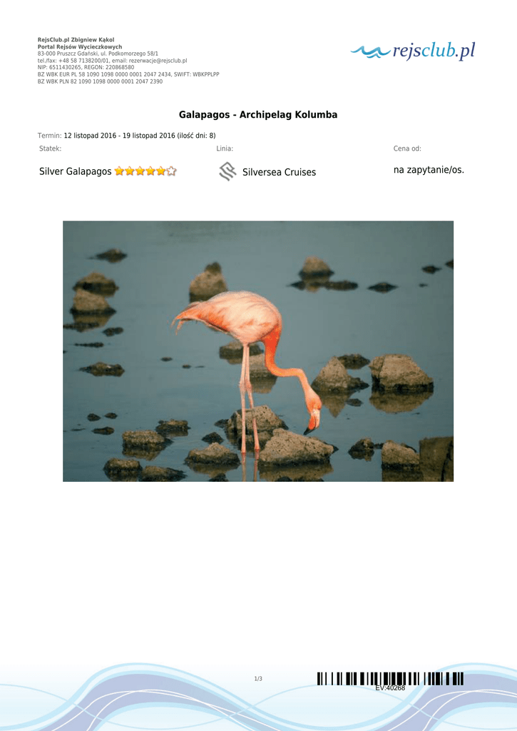 RejsClub.pl Zbigniew Kąkol Portal Rejsów Wycieczkowych 83-000 Pruszcz Gdański, ul. Podkomorzego 58/1 tel./fax: +48 58 7138200/01, email: [email protected] NIP: 6511430265, REGON: 220868580 BZ WBK EUR PL 58 1090 1098 0000 0001 2047 2434, SWIFT: WBKPPLPP BZ WBK PLN 82 1090 1098 0000 0001 2047 2390 Galapagos - Archipelag Kolumba Termin: 12 listopad 2016 - 19 listopad 2016 (ilość dni: 8) Statek: Silver Galapagos Linia: Cena od: Silversea Cruises na zapytanie/os. 1/3 EV:40268 RejsClub.pl Zbigniew Kąkol Portal Rejsów Wycieczkowych 83-000 Pruszcz Gdański, ul. Podkomorzego 58/1 tel./fax: +48 58 7138200/01, email: [email protected] NIP: 6511430265, REGON: 220868580 BZ WBK EUR PL 58 1090 1098 0000 0001 2047 2434, SWIFT: WBKPPLPP BZ WBK PLN 82 1090 1098 0000 0001 2047 2390 TRASA REJSU dzień 1 dzień 2 dzień 2 Data Port Wpłynięcie Wypłynięcie sobota 12.11.2016 Baltra, Wyspy Galapagos --:-- --:-- niedziela 13.11.2016 Bartolome, Wyspy Galapagos --:-- --:-- niedziela 13.11.2016 Playa Espumilla, Wyspy Galapagos --:-- --:-- --:-- --:-- --:-- --:-- --:-- --:-- --:-- --:-- --:-- --:-- --:-- --:-- --:-- --:-- --:-- --:-- Ekwador Ekwador Ekwador dzień 3 poniedziałek 14.11.2016 Punta Vecente Roca, Isabela, Wyspy Galapagos Ekwador dzień 3 poniedziałek 14.11.2016 Punta Espinoza, Wyspy Galapagos Ekwador dzień 4 dzień 4 wtorek 15.11.2016 Caleta Tagus, Wyspy Galapagos wtorek 15.11.2016 Bahia Elizabeth, Wyspy Galapagos Ekwador Ekwador dzień 5 środa 16.11.2016 Post Office Bay, Wyspy Galapagos Ekwador dzień 5 środa 16.11.2016 Cormorant Point, Wyspy Galapagos Ekwador dzień 6 czwartek 17.11.2016 Galapaguero Cerro Colorado, Wyspy Galapagos Ekwador dzień 6 czwartek 17.11.2016 Wizard Hill, San Cristobal, Wyspy Galapogos Ekwador 2/3 EV:40268 Legenda RejsClub.pl Zbigniew Kąkol Portal Rejsów Wycieczkowych 83-000 Pruszcz Gdański, ul. Podkomorzego 58/1 tel./fax: +48 58 7138200/01, email: [email protected] NIP: 6511430265, REGON: 220868580 BZ WBK EUR PL 58 1090 1098 0000 0001 2047 2434, SWIFT: WBKPPLPP BZ WBK PLN 82 1090 1098 0000 0001 2047 2390 dzień 7 dzień 7 dzień 8 Data Port Wpłynięcie Wypłynięcie piątek 18.11.2016 Los Gemelos, Wyspy Galapagos --:-- --:-- piątek 18.11.2016 Puerto Ayora, Wyspy Galapagos --:-- --:-- sobota 19.11.2016 Baltra, Wyspy Galapagos --:-- --:-- Legenda Ekwador Ekwador Ekwador CENNIK Cena katalogowa Suite (apartament) €6 450.00 - €10 150.00 Kabina jednoosobowa na zapytanie 3 osoba dorosła w kabinie na zapytanie dziecko do 12 lat jako 3 osoba w kabinie na zapytanie Opłaty portowe Cena promocyjna w cenie Uwaga! Ceny za osobę w kabinie dwuosobowej. Cena zawiera: zakwaterowanie w kabinie wybranej kategorii; wyżywienie - 3 główne posiłki, przekąski między posiłkami, bufet lub przekąski o północy; 24 - godzinny serwis kabinowy; serwis kamerdynera; napoje - open bar: kawa, herbata, woda, wybrane wina, alkohole i napoje bezalkoholowe, mini bar w kabinie uzupełniany na zamówienie; serwis bagażowy podczas wejścia i zejścia ze statku; korzystanie ze wszystkich urządzeń sportowo - rekreacyjnych znajdujących się na pokładzie statku (basen, jacuzzi, sala fitness, itp.); udział we wszystkich imprezach organizowanych na statku (przedstawienia w teatrze, koncerty, programy animacyjne itp.) oraz sportach wodnych: snorkeling, narty wodne, windsurfing, banan, kajaki; napiwki dla obsługi statku. W wybranych miastach transport port - centrum. Cena nie zawiera: kosztów dojazdu do portu; ewentualnych noclegów w hotelu przed/po rejsie i transferów; wycieczek fakultatywnych w trakcie rejsu; napojów, wina i alkoholi premium nie objętych ofertą open baru ; korzystania z punktów usługowych (fryzjer, pralnia, fotograf, salon piękności i odnowy biologicznej, internet) i wydatków osobistych; ubezpieczenia KL, NNW i bagaż; kosztu wymaganych wiz. 3/3 EV:40268