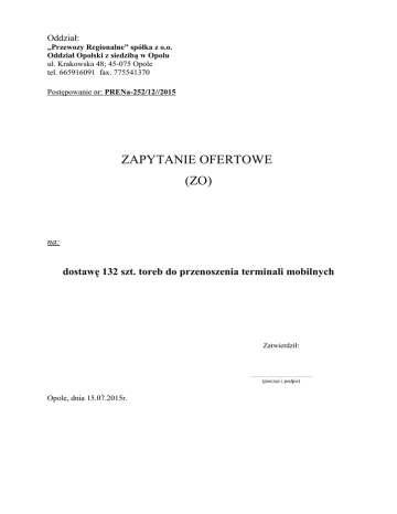 Oddział: „Przewozy Regionalne” spółka z o.o. Oddział Opolski z siedzibą w Opolu ul. Krakowska 48; 45-075 Opole tel. 665916091 fax. 775541370 Postępowanie nr: PRENa-252/12//2015 ZAPYTANIE OFERTOWE (ZO) na: dostawę 132 szt. toreb do przenoszenia terminali mobilnych Zatwierdził: DYREKTOR Jerzy Machnicki …………………………….. (pieczęć i podpis) Opole, dnia 15.07.2015r. § 1 – Informacje ogólne: 1. Słowniczek pojęć: 1) Oddział – „Przewozy Regionalne” spółka z o.o. Oddział Opolski z siedzibą w Opolu ul. Krakowska 48, 45-075 Opole; tel. 665 916 091; fax. (077) 5541370. 2) Oferent – osoba fizyczna, osoba prawna albo jednostka organizacyjna nieposiadająca osobowości prawnej, która uczestniczy w postępowaniu o udzielenie zamówienia. 3) Spółka – „Przewozy Regionalne” spółka z o.o. Centrala Spółki i jednostki wykonawcze (Oddziały, Zakłady Naprawcze Taboru); 4) Wykonawca - osoba fizyczna, osoba prawna albo jednostka organizacyjna nieposiadająca osobowości prawnej, której oferta została wybrana jako najkorzystniejsza lub która uzyskała zamówienie. 2. Postępowanie, którego dotyczy niniejsze Zapytanie ofertowe (zwane dalej ZO), oznaczone jest znakiem: PRENa-252/12/2015. Oferenci / Wykonawcy zobowiązani są do powoływania się na wyŜej podane oznaczenie we wszystkich kontaktach z Oddziałem. 3. Postępowanie prowadzone będzie w języku polskim. Wszelkie oświadczenia, zawiadomienia i inne dokumenty sporządzone w postępowaniu, jak równieŜ umowa w sprawie zamówienia sporządzone winny być w języku polskim. 4. Przed złoŜeniem oferty wstępnej, Oferent zobowiązany jest do szczegółowego zapoznania się z treścią niniejszego ZO. 5. Postępowanie o udzielnie zamówienia jest dwuetapowe: I etap - złoŜenie oferty wstępnej, II etap – negocjacje. 6. Oferta moŜe być złoŜona tylko poprzez platformę zakupową OpenNexus do wyznaczonego dnia zakończenia postępowania. 7. Ofertę naleŜy złoŜyć do dnia 22 lipca 2015 r. do godz. 13:00 drogą elektroniczną na platformie Open Nexus. 8. Wszelkie koszty związane z przygotowaniem i złoŜeniem oferty finalnej ponosi Oferent. 9. Rozliczenia między Zamawiającym a Oferentem prowadzone będą w walucie PLN. 10. Zamawiający zastrzega sobie moŜliwość zakończenia postępowania bez dokonania wyboru i bez podania przyczyny oraz uniewaŜnienia postępowania na kaŜdym jego etapie (bez dokonania wyboru oferty) bez podania przyczyny. 11. Zamawiający ma prawo zmieniać treść ZO przed upływem terminu składania ofert. § 2 – Przedmiot zamówienia: 1. Przedmiotem niniejszego zamówienia jest dostawa 132 szt. toreb do przenoszenia terminali mobilnych. 2. Torby do przenoszenia terminali mobilnych muszą spełniać następujące wymagania: 1) rok produkcji: nie starszy niŜ 2015 rok; 2) wymiary: 27 cm x 31 cm x12 cm; 3) kolor grafitowy lub czarny (całe zamówienie w jednym kolorze); 4) zapinany na zamek plastykowy; 5) regulowany pasek na ramię; 6) wewnętrzna komora do osadzenia terminala w pozycji pionowej; 7) przestrzeń do przechowywania dwóch baterii CASIO DT-9723LI oraz dwóch rolek papieru termicznego o szerokości 82,55 mm i średnicy 44 mm; 8) konstrukcja torby usztywniona (przynajmniej tył i dół torby); 9) materiał odporny na wycieranie; 10) podkładki antypoślizgowe na spodzie; 2 11) kaŜda sztuka przedmiotu dostawy musi posiadać etykietę, zawierającą nazwę producenta, rok produkcji, sposób konserwacji oraz oznaczenie kontroli jakości, informacje i oznaczenia na etykiecie muszą być sformułowane w języku polskim. 3. Miejsce realizacji zamówienia: „Przewozy Regionalne” sp. z o.o. Opolski Zakład Przewozów Regionalnych Sekcja DruŜyn Konduktorskich ul. Krakowska 48, 45-075 Opole. Koszty dostawy pokrywa Oferent. 4. Oddział nie dopuszcza moŜliwości składania ofert częściowych ani wariantowych. 5. W celu potwierdzenia, Ŝe oferowane dostawy odpowiadają wymaganiom określonym przez Zamawiającego, Zamawiający wymaga złoŜenia próbki oferowanego przedmiotu postępowania, którą naleŜy złoŜyć do dnia 22.07.2015r. do godziny 13:00. 6. Próbkę opatrzoną napisem „Torba do terminali mobilnych-próbka” moŜna złoŜyć osobiście w siedzibie Zamawiającego w Opolu ul. Ozimska 40 (4 piętro pokój 409) – sekretariat – za pośrednictwem poczty lub kuriera. 7. Po dokonaniu wyboru oferty najkorzystniejszej złoŜona próbka zostanie zaliczona na poczet pierwszej dostawy. Pozostałym Oferentom, których oferty nie zostały wybrane, Zamawiający zwróci złoŜone przez nich próbki. 8. Szczegółowe zasady realizacji przedmiotu postępowania, warunki płatności oraz inne istotne postanowienia zostały zawarte we wzorze umowy, która stanowi załącznik do niniejszych warunków. 9. Termin realizacji postępowania: od dnia podpisania umowy do dnia 31 stycznia 2016r., w miesięcznych transzach po 22 sztuk kaŜda. § 3 – Warunki udziału w postępowaniu 1. Z postępowania Oddział moŜne wykluczyć: 1) Oferentów, którzy wyrządzili szkodę Spółce poprzez nie wykonanie zamówienia lub nienaleŜytego jego wykonania w okresie 3 lat przed wszczęciem niniejszego postępowania; 2) Oferentów, z którymi Spółka rozwiązała albo wypowiedziała Umowę w sprawie zamówienia albo odstąpiła od umowy w sprawie zamówienia, z powodu okoliczności, za które Oferent ponosi odpowiedzialność, jeŜeli rozwiązanie albo wypowiedzenie Umowy, albo odstąpienie od Umowy nastąpiło w okresie 3 lat przed wszczęciem niniejszego postępowania; 3) Oferentów w stosunku, do których otwarto likwidację lub, których upadłość ogłoszono; 4) Oferentów, którzy zalegają z opłaceniem podatków, opłat i składek na ubezpieczenie społeczne i zdrowotne, z wyjątkiem przypadków, gdy uzyskali przewidziane prawem zwolnienie, odroczenie lub rozłoŜenie na raty zaległych płatności lub wstrzymanie w całości wykonania decyzji właściwego organu; 5)