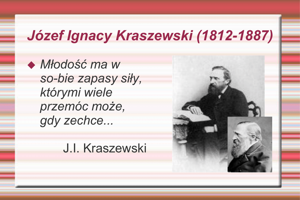 Józef Ignacy Kraszewski (1812-1887) Młodość ma w sobie zapasy siły, którymi wiele przemóc może, gdy zechce... J.I. Kraszewski Kim on był??? "Ja nie jestem pono ani Józef Ignacy literatem, ani artystą, Kraszewski- pisarz, choć piszę wiele i kocham dziennikarz, malarz, wszelkie piękno rysownik, muzyk, ja jestem człowiekiem kolekcjoner. mojego wieku, Urodzony 28 lipca dzieckiem narodu mego." 1812 w Warszawie, J. I. Kraszewski zmarł 19 marca 1887 w Genewie Biografia Kraszewskiego Urodził się w Warszawie jako syn Jana i Zofii z Malskich. Rodzice mieszkali na Grodzieńszczyźnie, we wsi Dołhe koło Prużan. Rodzina pieczętowała się herbem Jastrzębiec. Matka szukała w Warszawie schronienia w obawie przed wojną francusko-rosyjską. Oboje rodzice pojawiali się w późniejszej twórczości Kraszewskiego, jako wzorce postaci powieściowych. Ojciec, Jan Kraszewski (1788-1864), chorąży powiatu prużańskiego, został przedstawiony w roli seniora rodziny w Powieści bez tytułu (1855). Zofię Kraszewską (1791-1859) syn sportretował m.in. w Pamiętnikach nieznajomego (1846). Józef Ignacy był najstarszy z pięciorga rodzeństwa; najmłodszy brat Kajetan (1827-1896) także zajął się literaturą, był autorem opowiadań i powieści. Kraszewski wychowywał się w Romanowie w powiecie włodawskim pod opieką babki Zofii Malskiej i prababki Konstancji Nowomiejskiej. Wyniósł stamtąd pierwsze zainteresowania kulturą i literaturą. Kształcił się w szkole wydziałowej w Białej Podlaskiej (1822-1826), szkole wojewódzkiej w Lublinie (1826-1827), wreszcie w gimnazjum w Świsłoczy (1827-1829), gdzie zdał egzamin dojrzałości. We wrześniu 1829 podjął studia na Wydziale Lekarskim Uniwersytetu Wileńskiego, wkrótce przeniósł się na literaturę. Pod pseudonimem Kleofasa Fakunda Pasternaka ogłaszał pierwsze utwory literackie. Zawarł związek małżeński (10 czerwca 1838) z Zofią Woroniczówną, bratanicą prymasa Jana Pawła Woronicza. W 1838 wraz z żoną osiedlił się na Wołyniu. W 1838 wraz z żoną osiedlił się na Wołyniu. Początkowo był dzierżawcą wsi Omelno (powiat łucki), następnie (1840) zakupił wieś Gródek koło Łucka. Tam, obok codziennych zajęć gospodarskich, musiał zmierzyć się z procesem o zatajone zadłużenie ciążące na wiosce. Odbył w tym okresie kilka podróży, m.in. do Kijowa i Odessy, które zaowocowały Wspomnieniami Odessy, Jedyssanu i Budżaku (1845-1846). W 1846 gościł w Warszawie, rok później na leczeniu w Druskiennikach. W 1848 Kraszewski sprzedał Gródek i przeniósł się do kolejnego nabytku - wsi Hubin (także powiat łucki). Stąd, zrażony niepowodzeniami gospodarskimi, a zarazem przymuszony koniecznością kształcenia czwórki dzieci (Konstancja, ur. 1839; Jan, ur. 1841; Franciszek, ur. 1843; Augusta, ur. 1849), przeniósł się w 1853 do Żytomierza. W Żytomierzu, będącym w tym okresie 40-tysięcznym miastem, ośrodkiem życia społecznego i towarzyskiego polskiej szlachty oraz siedzibą carskich władz gubernialnych, Kraszewski pełnił szereg funkcji i godności. Był m.in. kuratorem szkół polskich (o ograniczonych kompetencjach), dyrektorem Teatru Żytomierskiego (od 1856), dyrektorem Klubu Szlacheckiego, prezesem Towarzystwa Dobroczynności. Cieszył się jednocześnie rosnącą sławą jako pisarz. Mimo pełnionych godności szlacheckich Kraszewski dostrzegał problemy społeczne i występował przeciwko systemowi pańszczyźnianemu, ogłosił m.in. memoriał popierający projekt nadania ziemi chłopom, przedstawiony na zjeździe gubernialnym szlachty w Żytomierzu na początku 1858. Wkrótce, po odbyciu w 1858 półrocznej podróży po Europie, nabrał także sympatii do idei demokratycznych i gospodarczych zachodniej Europy. Po powrocie z podróży pisarz poróżnił się ostatecznie ze środowiskiem szlachty wołyńskiej i podjął decyzję o przeniesieniu do Warszawy. Został redaktorem "Gazety Codziennej" Leopolda Cronenberga, podnosząc znaczenie pisma (co wyraziło się m.in. kilkunastokrotnym wzrostem liczby prenumeratorów). Propagował kapitalistyczne formy gospodarki rolniczej, inwestycje, uprzemysłowienie, rozwój kolei, tworzenie zrzeszeń handlowo-finansowych. Odbywał dalsze podróże zagraniczne, był w Belgii i Francji (dwukrotnie), Włoszech, Rosji. Angażował się w działalność polityczną emigracji i analizował możliwość wybuchu powstania (opublikował w Paryżu broszurę Sprawa polska w r. 1861, 1861). Zgodnie z nabytymi przed trzydziestu laty poglądami nie był zwolennikiem powstania, starając się publikacjami w "Gazecie Polskiej" (1861 nastąpiła zmiana nazwy z "Gazeta Codzienna") tonować atmosferę przedpowstańczą. Jednak jako zdecydowany krytyk polityki margrabiego Wielopolskiego, a także mając opinię "człowieka Cronenberga" (lidera stronnictwa Białych), pod koniec stycznia 1863 został zmuszony do opuszczenia Warszawy. Wyjechał do Drezna. W Dreźnie, od czasów rozbiorowych jednym z głównych ośrodków polskiej emigracji, Kraszewski zajął się pomocą dla szukających schronienia za granicą powstańców styczniowych. W pracy literackiej skupił się na publicystyce politycznej, pod pseudonimem Bogdan Bolesławita ogłosił szereg powieści o tematyce powstańczej. Utwory te zamknęły mu drogę powrotną do Warszawy po upadku powstania, odbywał natomiast kolejne podróże po Europie, w pierwszych latach emigracji szukając wsparcia dla sprawy powstańczej, potem także dla kuracji i wypoczynku - obok klęsk narodowych Kraszewski przeżywał niepowodzenia prywatne, problemy finansowe, długi zięcia i syna Jana, deportację brata Lucjana do Rosji, zesłanie zięcia i wyjazd wraz z nim córki Konstancji z dziećmi. Jako doświadczony dziennikarz podjął w 1865 pracę redaktora tworzonego we Lwowie pisma "Hasło". Spotkał się z dużym zawodem - nie otrzymał zezwolenia na pobyt we Lwowie i został zmuszony do współpracy na odległość