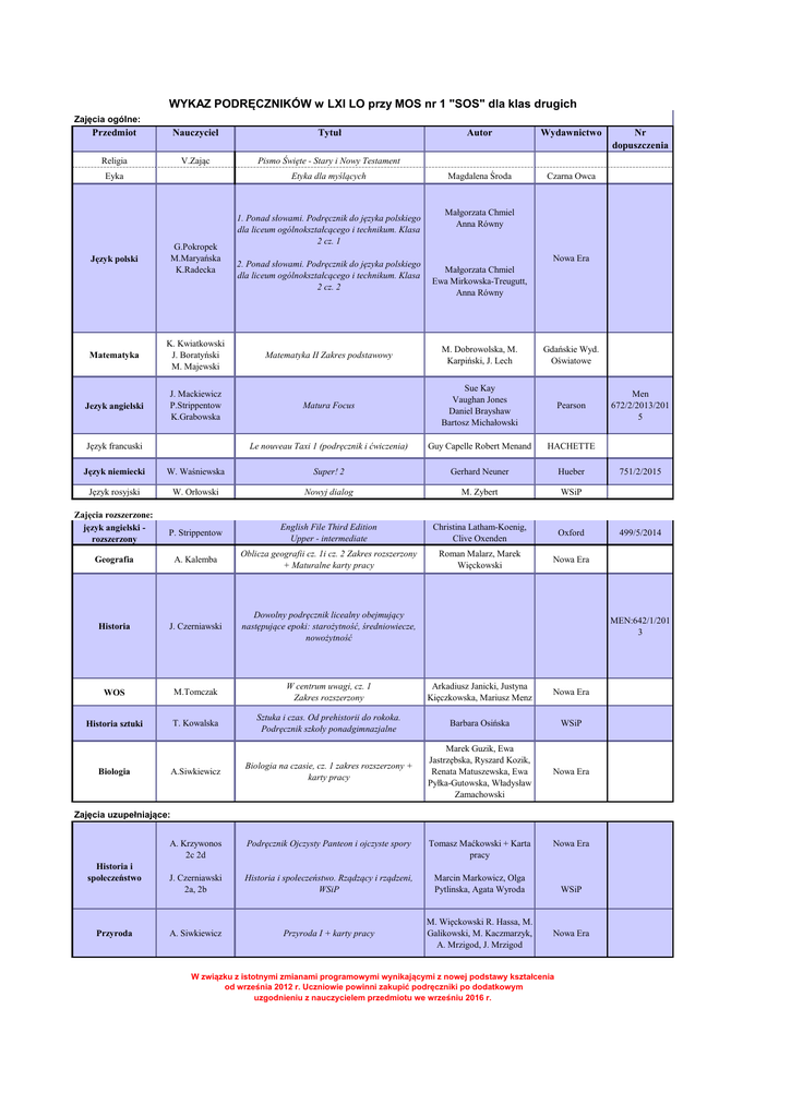 WYKAZ PODRĘCZNIKÓW w LXI LO przy MOS nr 1 "SOS" dla klas drugich Zajęcia ogólne: Przedmiot Nauczyciel Tytuł Religia V.Zając Pismo Święte - Stary i Nowy Testament Etyka dla myślących Eyka G.Pokropek M.Maryańska K.Radecka Język polski 1. Ponad słowami. Podręcznik do języka polskiego dla liceum ogólnokształcącego i technikum. Klasa 2 cz. 1 2. Ponad słowami. Podręcznik do języka polskiego dla liceum ogólnokształcącego i technikum. Klasa 2 cz. 2 Autor Wydawnictwo Magdalena Środa Czarna Owca Małgorzata Chmiel Anna Równy Nowa Era Małgorzata Chmiel Ewa Mirkowska-Treugutt, Anna Równy Matematyka K. Kwiatkowski J. Boratyński M. Majewski Matematyka II Zakres podstawowy M. Dobrowolska, M. Karpiński, J. Lech Gdańskie Wyd. Oświatowe Jezyk angielski J. Mackiewicz P.Strippentow K.Grabowska Matura Focus Sue Kay Vaughan Jones Daniel Brayshaw Bartosz Michałowski Pearson Le nouveau Taxi 1 (podręcznik i ćwiczenia) Guy Capelle Robert Menand HACHETTE Język francuski Język niemiecki W. Waśniewska Super! 2 Gerhard Neuner Hueber Język rosyjski W. Orłowski Nowyj dialog M. Zybert WSiP P. Strippentow English File Third Edition Upper - intermediate Christina Latham-Koenig, Clive Oxenden Oxford Geografia A. Kalemba Oblicza geografii cz. 1i cz. 2 Zakres rozszerzony + Maturalne karty pracy Roman Malarz, Marek Więckowski Nowa Era Historia J. Czerniawski Dowolny podręcznik licealny obejmujący następujące epoki: starożytność, średniowiecze, nowożytność WOS M.Tomczak W centrum uwagi, cz. 1 Zakres rozszerzony Arkadiusz Janicki, Justyna Kięczkowska, Mariusz Menz Nowa Era Historia sztuki T. Kowalska Sztuka i czas. Od prehistorii do rokoka. Podręcznik szkoły ponadgimnazjalne Barbara Osińska WSiP A.Siwkiewicz Biologia na czasie, cz. 1 zakres rozszerzony + karty pracy Marek Guzik, Ewa Jastrzębska, Ryszard Kozik, Renata Matuszewska, Ewa Pyłka-Gutowska, Władysław Zamachowski Nowa Era Zajęcia rozszerzone: język angielski rozszerzony Biologia Przyroda Men 672/2/2013/201 5 751/2/2015 499/5/2014 MEN:642/1/201 3 Zajęcia uzupełniające: Historia i społeczeństwo Nr dopuszczenia A. Krzywonos 2c 2d Podręcznik Ojczysty Panteon i ojczyste spory Tomasz Maćkowski + Karta pracy J. Czerniawski 2a, 2b Historia i społeczeństwo. Rządzący i rządzeni, WSiP Marcin Markowicz, Olga Pytlinska, Agata Wyroda A. Siwkiewicz Przyroda I + karty pracy M. Więckowski R. Hassa, M. Galikowski, M. Kaczmarzyk, A. Mrzigod, J. Mrzigod Nowa Era WSiP Nowa Era W związku z istotnymi zmianami programowymi wynikającymi z nowej podstawy kształcenia od września 2012 r. Uczniowie powinni zakupić podręczniki po dodatkowym uzgodnieniu z nauczycielem przedmiotu we wrześniu 2016 r.