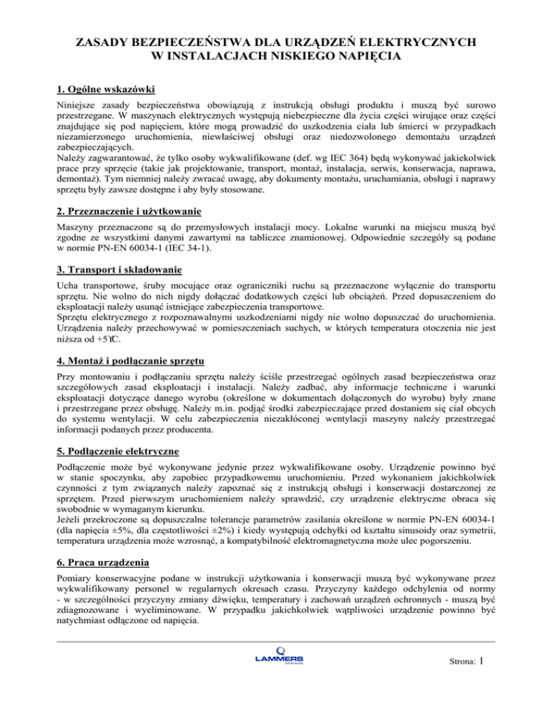 ZASADY BEZPIECZEŃSTWA DLA URZĄDZEŃ ELEKTRYCZNYCH W INSTALACJACH NISKIEGO NAPIĘCIA 1. Ogólne wskazówki Niniejsze zasady bezpieczeństwa obowiązują z instrukcją obsługi produktu i muszą być surowo przestrzegane. W maszynach elektrycznych występują niebezpieczne dla życia części wirujące oraz części znajdujące się pod napięciem, które mogą prowadzić do uszkodzenia ciała lub śmierci w przypadkach niezamierzonego uruchomienia, niewłaściwej obsługi oraz niedozwolonego demontażu urządzeń zabezpieczających. Należy zagwarantować, że tylko osoby wykwalifikowane (def. wg IEC 364) będą wykonywać jakiekolwiek prace przy sprzęcie (takie jak projektowanie, transport, montaż, instalacja, serwis, konserwacja, naprawa, demontaż). Tym niemniej należy zwracać uwagę, aby dokumenty montażu, uruchamiania, obsługi i naprawy sprzętu były zawsze dostępne i aby były stosowane. 2. Przeznaczenie i użytkowanie Maszyny przeznaczone są do przemysłowych instalacji mocy. Lokalne warunki na miejscu muszą być zgodne ze wszystkimi danymi zawartymi na tabliczce znamionowej. Odpowiednie szczegóły są podane w normie PN-EN 60034-1 (IEC 34-1). 3. Transport i składowanie Ucha transportowe, śruby mocujące oraz ograniczniki ruchu są przeznaczone wyłącznie do transportu sprzętu. Nie wolno do nich nigdy dołączać dodatkowych części lub obciążeń. Przed dopuszczeniem do eksploatacji należy usunąć istniejące zabezpieczenia transportowe. Sprzętu elektrycznego z rozpoznawalnymi uszkodzeniami nigdy nie wolno dopuszczać do uruchomienia. Urządzenia należy przechowywać w pomieszczeniach suchych, w których temperatura otoczenia nie jest niższa od +5°C. 4. Montaż i podłączanie sprzętu Przy montowaniu i podłączaniu sprzętu należy ściśle przestrzegać ogólnych zasad bezpieczeństwa oraz szczegółowych zasad eksploatacji i instalacji. Należy zadbać, aby informacje techniczne i warunki eksploatacji dotyczące danego wyrobu (określone w dokumentach dołączonych do wyrobu) były znane i przestrzegane przez obsługę. Należy m.in. podjąć środki zabezpieczające przed dostaniem się ciał obcych do systemu wentylacji. W celu zabezpieczenia niezakłóconej wentylacji maszyny należy przestrzegać informacji podanych przez producenta. 5. Podłączenie elektryczne Podłączenie może być wykonywane jedynie przez wykwalifikowane osoby. Urządzenie powinno być w stanie spoczynku, aby zapobiec przypadkowemu uruchomieniu. Przed wykonaniem jakichkolwiek czynności z tym związanych należy zapoznać się z instrukcją obsługi i konserwacji dostarczonej ze sprzętem. Przed pierwszym uruchomieniem należy sprawdzić, czy urządzenie elektryczne obraca się swobodnie w wymaganym kierunku. Jeżeli przekroczone są dopuszczalne tolerancje parametrów zasilania określone w normie PN-EN 60034-1 (dla napięcia ±5%, dla częstotliwości ±2%) i kiedy występują odchyłki od kształtu sinusoidy oraz symetrii, temperatura urządzenia może wzrosnąć, a kompatybilność elektromagnetyczna może ulec pogorszeniu. 6. Praca urządzenia Pomiary konserwacyjne podane w instrukcji użytkowania i konserwacji muszą być wykonywane przez wykwalifikowany personel w regularnych okresach czasu. Przyczyny każdego odchylenia od normy - w szczególności przyczyny zmiany dźwięku, temperatury i zachowań urządzeń ochronnych - muszą być zdiagnozowane i wyeliminowane. W przypadku jakichkolwiek wątpliwości urządzenie powinno być natychmiast odłączone od napięcia. Strona: 1 7. Ważne informacje Z powodu różnorodności warunków pracy i zastosowań urządzeń ten dokument ma charakter ogólny i musi być rozważany wraz z instrukcją obsługi i konserwacji. W przypadkach specjalnych (takich jak wyjątkowe warunki środowiskowe lub specjalne wymogi bezpieczeństwa) niezbędny jest kontakt z producentem lub dystrybutorem. 8. Gwarancja Utrzymanie gwarancji wymaga zachowania reguł bezpieczeństwa, przestrzegania wskazówek określonych w instrukcji obsługi i konserwacji oraz użytkowania urządzenia zgodnie z przeznaczeniem. W przypadku dalszych pytań, co do szczegółowych wymagań nieokreślonych w instrukcji, prosimy o kontakt podając typ i numer fabryczny silnika. PRODUCENT: Cl. Lammers® GmbH & Co. KG - Elektromaschinen Fabrik DYSTRYBUTOR: ZELTECH Mechatronika Sp. z o.o. Strona: 2 CHARAKTERYSTYKA TECHNICZNA SILNIKÓW SERII „14BG” Informacje ogólne Niniejsza instrukcja dotyczy 3-fazowych silników asynchronicznych, z wirnikiem klatkowym – serii 14BG – w kadłubach odlewanych żeliwnych, budowy zamkniętej, chłodzonych powietrzem (TEFC), wielkości mechanicznej 160÷280 o liczbie biegunów 2, 4 i 6 oraz podzespołów i części tych silników. Silniki serii 14BG mają zastosowanie ogólnoprzemysłowe. Są używane do napędu różnych maszyn i urządzeń, których praca ma charakter ciągły bez częstych rozruchów i nawrotów. Ze względu na stopień ochrony wnętrza mogą pracować w warunkach, gdy otaczające powietrze zawiera zanieczyszczenia. Zapylenie otoczenia nie powinno być wyższe od 10 mg/m3. Nie mogą to być jednak zanieczyszczenia agresywne chemicznie, takie jak opary kwasów i ługów, ani mieszanki wybuchowe. Skrzynka zaciskowa osadzona jest standardowo na górze kadłuba. Przystosowane są do pracy dwukierunkowej – prawego lub lewego kierunku wirowania. Normy Silniki 14BG są zgodne z normami PN-EN 60034-1, IEC34-1/9, PN-IEC72-1, IEC85, DIN 57530/VDE 0530 oraz z normami z nimi związanymi i równoważnymi. Szczegółowe warunki Stopień ochrony: System chłodzenia: Wykonanie mechaniczne: Klasa izolacji: Przyrost temperatury: Temperatura pracy: Wysokość instalowania: IP55 chłodzenie własne IC411 (lub chłodzenie obce IC416 – na życzenie) B3 (IM1001) – poziome na łapach B35 (IM2001) – łapowo-kołnierzowe B5 (IM3001) – kołnierzowe do pracy poziomej F jak dla klasy B (≤80˚C) -20…+40˚C ≤1000 m n.p.m. Łożyskowan