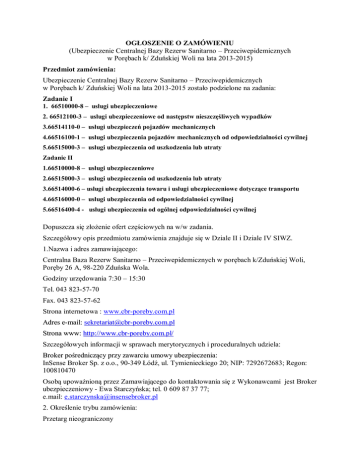 OGŁOSZENIE O ZAMÓWIENIU (Ubezpieczenie Centralnej Bazy Rezerw Sanitarno – Przeciwepidemicznych w Porębach k/ Zduńskiej Woli na lata 2013-2015) Przedmiot zamówienia: Ubezpieczenie Centralnej Bazy Rezerw Sanitarno – Przeciwepidemicznych w Porębach k/ Zduńskiej Woli na lata 2013-2015 zostało podzielone na zadania: Zadanie I 1. 66510000-8 – usługi ubezpieczeniowe 2. 66512100-3 – usługi ubezpieczeniowe od następstw nieszczęśliwych wypadków 3.66514110-0 – usługi ubezpieczeń pojazdów mechanicznych 4.66516100-1 – usługi ubezpieczenia pojazdów mechanicznych od odpowiedzialności cywilnej 5.66515000-3 – usługi ubezpieczenia od uszkodzenia lub utraty Zadanie II 1.66510000-8 – usługi ubezpieczeniowe 2.66515000-3 – usługi ubezpieczenia od uszkodzenia lub utraty 3.66514000-6 – usługi ubezpieczenia towaru i usługi ubezpieczeniowe dotyczące transportu 4.66516000-0 – usługi ubezpieczenia od odpowiedzialności cywilnej 5.66516400-4 - usługi ubezpieczenia od ogólnej odpowiedzialności cywilnej Dopuszcza się złożenie ofert częściowych na w/w zadania. Szczegółowy opis przedmiotu zamówienia znajduje się w Dziale II i Dziale IV SIWZ. 1.Nazwa i adres zamawiającego: Centralna Baza Rezerw Sanitarno – Przeciwepidemicznych w porębach k/Zduńskiej Woli, Poręby 26 A, 98-220 Zduńska Wola. Godziny urzędowania 7:30 – 15:30 Tel. 043 823-57-70 Fax. 043 823-57-62 Strona internetowa : www.cbr-poreby.com.pl Adres e-mail: [email protected] m.pl Strona www: http://www.cbr-poreby.co m.pl/ Szczegółowych informacji w sprawach merytorycznych i proceduralnych udziela: Broker pośredniczący przy zawarciu umowy ubezpieczenia: InSense Broker Sp. z o.o., 90-349 Łódź, ul. Tymienieckiego 20; NIP: 7292672683; Regon: 100810470 Osobą upoważnioną przez Zamawiającego do kontaktowania się z Wykonawcami jest Broker ubezpieczeniowy - Ewa Starczyńska; tel. 0 609 87 37 77; e.mail: [email protected] 2. Określenie trybu zamówienia: Przetarg nieograniczony Wartość szacunkowa zamówienia: poniżej progów ustalonych na podstawieart.11 ust.8 p.z.p. 3. Adres strony internetowej na której zamieszczony jest SIWZ: www.cbr-poreby.com.pl 4. Określenie sposobu uzyskania specyfikacji istotnych warunków zamówienia: SIWZ można odebrać nieodpłatnie w siedzibie Zamawiającego (sekretariat) w godzin ach od godz. 8:00 do 15:00 lub pobrać ze strony internetowej www.cbr-poreby.com.pl 5. Opis przedmiotu oraz wielkość lub zakres zamówienia, z podaniem informacji o możliwości składania ofert częściowych: Szczegółowy zakres ubezpieczenia ujęto w SIWZ. 6. Informacje o możliwości złożenia oferty wariantowej: Zamawiający nie dopuszcza składania ofert wariantowych. Termin wykonania zamówienia: Czas trwania zamówienia lub termin wykonania : 24 miesiące: 19.10.2013 - 18.10.2015 8. Opis warunków w postępowaniu oraz opis sposobu dokonywania oceny spełnienia warunków Warunki udziału i sposób dokonywania oceny zawarte w SIWZ 9. Informacja na temat wadium: Zamawiający nie wymaga wniesienia wadium w przedmiotowym postępowaniu 10. Kryterium oceny ofert Szczegółowo zawarte w SIWZ 11. Miejsce składania ofert: Siedziba Zamawiającego ; Poręby 26A, 98-220 Zduńska Wola, Sekretariat Termin składania ofert : do dnia 30.09.2013 r. godz. 10:00 12. Termin związania ofertą: 30 dni 13. Ogłoszenie zostało opublikowane w Portalu Zamówień Publicznych pod numerem 374690 – 2013 z dnia 16.09.2013 r. 14. Ogłoszenie o zmianie ogłoszenia zostało opublikowane w Portalu Zamówień Publicznych pod numerem 375366-2013 ; data zamieszczenia: 16.09.2013 r. 15. Ogłoszenie o zamówieniu – usługi. Dyrektor Sławomir Racięcki