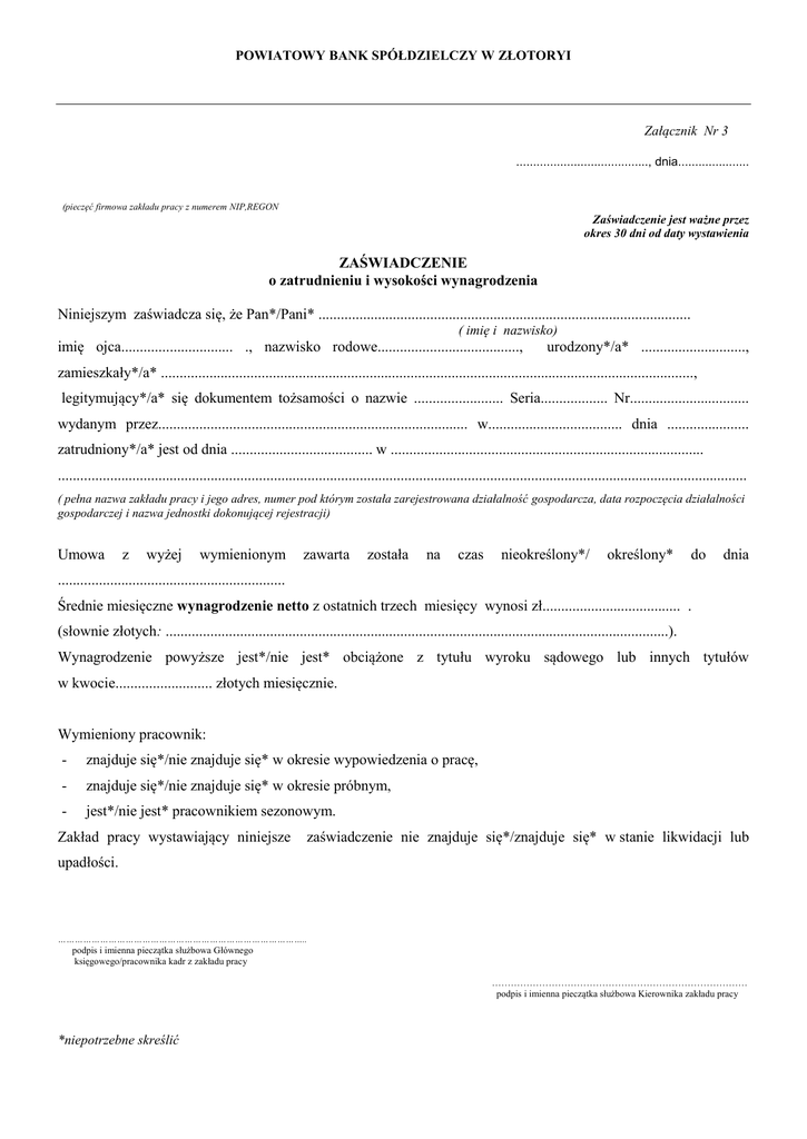 POWIATOWY BANK SPÓŁDZIELCZY W ZŁOTORYI Załącznik Nr 3 ......................................., dnia..................... (pieczęć firmowa zakładu pracy z numerem NIP,REGON Zaświadczenie jest ważne przez okres 30 dni od daty wystawienia ZAŚWIADCZENIE o zatrudnieniu i wysokości wynagrodzenia Niniejszym zaświadcza się, że Pan*/Pani* .................................................................................................... ( imię i nazwisko) imię ojca.............................. ., nazwisko rodowe......................................, urodzony*/a* ............................, zamieszkały*/a* ..............................................................................................................................................., legitymujący*/a* się dokumentem tożsamości o nazwie ........................ Seria.................. Nr................................ wydanym przez................................................................................... w.................................... dnia ...................... zatrudniony*/a* jest od dnia ...................................... w .................................................................................... ......................................................................................................................................................................................... ( pełna nazwa zakładu pracy i jego adres, numer pod którym została zarejestrowana działalność gospodarcza, data rozpoczęcia działalności gospodarczej i nazwa jednostki dokonującej rejestracji) Umowa z wyżej wymienionym zawarta została na czas nieokreślony*/ określony* do dnia ............................................................. Średnie miesięczne wynagrodzenie netto z ostatnich trzech miesięcy wynosi zł..................................... . (słownie złotych: .......................................................................................................................................). Wynagrodzenie powyższe jest*/nie jest* obciążone z tytułu wyroku sądowego lub innych tytułów w kwocie.......................... złotych miesięcznie. Wymieniony pracownik: - znajduje się*/nie znajduje się* w okresie wypowiedzenia o pracę, - znajduje się*/nie znajduje się* w okresie próbnym, - jest*/nie jest* pracownikiem sezonowym. Zakład pracy wystawiający niniejsze zaświadczenie nie znajduje się*/znajduje się* w stanie likwidacji lub upadłości. …………………………………………………………………………….. podpis i imienna pieczątka służbowa Głównego księgowego/pracownika kadr z zakładu pracy ……………………………………………………………………… podpis i imienna pieczątka służbowa Kierownika zakładu pracy *niepotrzebne skreślić