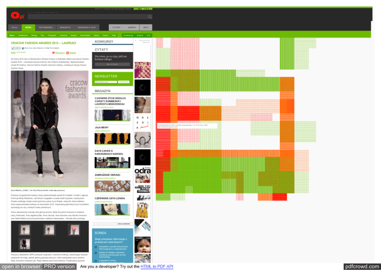 2012-07-17 | imieniny: Aleksego, Bogdana, Martyny Szukaj Home News: NEWS Architektura WYDARZENIA Design Film MAGAZYN Fotografia Literatura NAGRODA O 2010 Muzyka Nowe Media Rejestracja, aby zobaczyć co lubią Tw oi znajomi. Design | 2012-03-28 | Skomentuj (1) Taniec Teatr KARTKI Konferencje INFO Historia + KONKURSY CRACOW FASHION AWARDS 2012 – LAUREACI Lubię to! Sztuka CYTATY Kids Zamów bloc zek reklamowy CYTATY Narzędzia 24 marca 2012 roku w Nowohuckim Centrum Kultury w Krakowie odbyło się Cracow Fashion Nie wiem, po co żyję, jeśli nie kocham nikogo. Awards 2012 – szesnasta edycja konkursu dla młodych projektantów. Zaprezentowano Ma r ek Hła sk o ponad 50 kolekcji. Cracow Fashion Awards otworzyło kolejną, czwartą już edycję Cracow Fashion Week. NEWSLETTER Wpisz adres e-mail... subskrybuj MAGAZYN CUDOWNE ŻYCIE WEDŁUG CHRISTY SOMMERER I LAURENTA MIGNONNEAU MARTA WRÓBLEWSKA © CODEMANIPULATOR, CodePainting-Mad-Man-11111010100.a, 2004 http://c odemanipulator.c om/ JAJA MEWY JACEK SIERADZKI DAYA CAHEN O NARODZINACH NARODU ZAMRAŻANIE OBRAZU ZUZANNA SOKOŁOWSKA Anna Walicka, „N-HILL”, fot. Piotr Kierat (źródło: m ateriały prasow e) Podczas trzygodzinnej imprezy stroje zaprezentowało ponad 40 modelek i modeli z agencji Promocji Mody Reklamex, nad których wyglądem czuwał sztab fryzjerów i wizażystów. CZERWONE USTA LENINA Powiew wielkiego świata wniósł gościnny pokaz Łucji Wojtali, stażystki Johna Galliano, DOROTA GROYECKA która zaprezentowała kolekcję na wiosnę/lato 2012, inspirowaną geometrycznymi kształtami wywodzącymi się z estetyki ludów pierwotnych. Prace absolwentów oceniały dwa gremia jurorów: Rada Wysokich Krawców w składzie: Jerzy Antkowiak, Ewa Jagielska-Żak, Anna Jatczak, Ilona Kanclerz oraz Monika Onoszko oraz Rada Mediów pod przewodnictwem redaktora Newsweeka – Michała Zaczyńskiego. w iecej artykulów SONDA Skąd czerpiesz informacje o premierach teatralnych? korzystam z portali kulturalnych informujących o wydarzeniach Wszyscy absolwenci SAPU pokazali oryginalne i autorskie kolekcje, prezentujące dojrzałe spojrzenie na modę, jednak główną gwiazdą wieczoru, która zawojowała serca zarówno Rady Wysokich Krawców jak i Rady Mediów była Anna Walicka. Projektantka opuściła open in browser PRO version śledzę na bieżąco repertuar instytucji poprzez jego stronę internetową przeglądam prasę codzienną/tygodniki w celu Are you a developer? Try out the HTML to PDF API pdfcrowd.com NCK ze statuetką Cracow Fashion Awards 2012, tytułem Kolekcji Mediów, propozycją stażu w paryskim atelier Joanny Błażejowskiej oraz maszyną do artystycznego łączenia tkanin bez użycia nici ufundowaną przez firmę Husqvarna . Anna Walicka zdobyła także uznanie partnera Cracow Fashion Week – Galerii Kazimierz oraz statuetkę Galeria Kazimierz Awards. Jej geometryczna kolekcja zatytułowana N-HILL wyróżniała się codzienną/tygodniki w celu znalezienia informacji informacje uzyskuje dzięki prenumeracie czasopism zajmujących się tematyką teatralną charakterystyczną kolorystyką tkanin, przechodzących z odcienia jasnego do najciemniejszego, na których dodatkowo autorka nadrukowała linie papilarne oraz motyw słoi w drewnie. Najważniejszym elementem tej kolekcji były buty z drewnianymi, ręcznie rzeźbionymi koturnami w kształcie dłoni. Głosuj Zobacz wyniki Zobacz archiwum WYDARZENIA MALTA FESTIVAL POZNAŃ Od 3 do 7 lipca 2012 roku EUGENIUSZ GERLACH SPORT W SZTUCE – INSPIRACJE OLIMPIJSKIE 2012 Od 10 lipca do 31 sierpnia 2012 roku + Zamów bloc zek reklamowy MARCEL RASQUIN BRAT Od 6 lipca 2012 roku PUBLICZNE OBRONY DYPLOMÓW STUDENTÓW AKADEMII SZTUK PIĘKNYCH Od 28 czerwca do 20 lipca 2012 roku ZMIENNE-STAŁE-BŁĄDZĄCE. AC / DC / IT. DALSZA HISTORIA INSTALACJI WIDEO Od 26 czerwca 2012 roku Łucja Wojtala, kolekcja na w iosnę/lato 2012, fot. Piotr Kierat Wyróżnienia za kreatywność i wizjonerstwo Rada Wysokich Krawców przyznała Adamowi Bakunowi, Ewelinie Jaśkowiec, Xymenie Maciuk, Weronice Szynczewskiej i Annie Wiszniewskiej. Tradycyjnie podczas Cracow Fashion Awards nagrody przyznawali sponsorzy i przedstawiciele mediów związanych z branżą modową: Ilona Kanclerz zaprosiła Annę FESTIWAL KULTURY ŻYDOWSKIEJ W KRAKOWIE Walicką oraz Adama Bakuna do udziału w projekcie Future, stoisko podczas Fashion Week Od 29 czerwca do 8 lipca 2012 roku Poland otrzymała Marta Galik za kolekcję Determine Your Limits, firma Ariadna nagrodziła Marzenę Wolską za kolekcję Kopciuszek na wybiegu, a restauracja Russian Enso przyznała nagrodę pieniężną Sylwii Płonce za kolekcję Anioły i Demony – dwa oblicza k obiety. Przewodniczący Rady Mediów, Michał Zaczyński w imieniu Doroty Wróblewskiej zaprosił do udziału w Warsaw Fashion Street Annę Kraszewską, Agnieszkę Piekarczyk, Joannę Buksiak, Annę Wiszniewską, Weronikę Szynczewską, Annę Walicką i Alicję Walę. Łacznie SOKOŁOWSKO FESTIWAL – HOMMAGE A KIEŚLOWSKI nagrodzono 23 kolekcje, co świadczy o wyrównanym poziomie tegorocznej gali dyplomowej Od 7 do 9 września 2012 roku SAPU. GROLSCH ARTBOOM FESTIVAL Nowohuckie Centrum Kultury w Krakowie, Aleja Jana Pawła II 232 Od 15 do 29 czerwca 2012 roku Pow ielanie, przetw arzanie i dalsze rozpow szechnianie treści i materiałów zamieszczonych w O.pl Polskim Portalu Kultury, w jakikolw iek sposób, w całości lub w części, bez w cześniejszej pisemnej zgody Wydaw cy jest zabronione. Lubię to! Rejestracja, aby zobaczyć co lubią Tw oi znajomi. Tags Anna Walicka Cracow Fashion Awards Cracow Fashion Week Nowohuckie Centrum Kultury w Krakowie Poprzedni news Twarzą w twarz z rasizmem w Muzeum Plakatu Następny news Okna Viktorii Marinov w Białymstoku Kraków SUROWE FORMY (CRUDE LIFE) Od 3 do 24 czerwca 2012 roku JOSEPH BEUYS | TADEUSZ open in browser PRO version Are you a developer? Try out the HTML to PDF API pdfcrowd.com 1 komentarz do artykułu “Cracow Fashion Awards 2012 