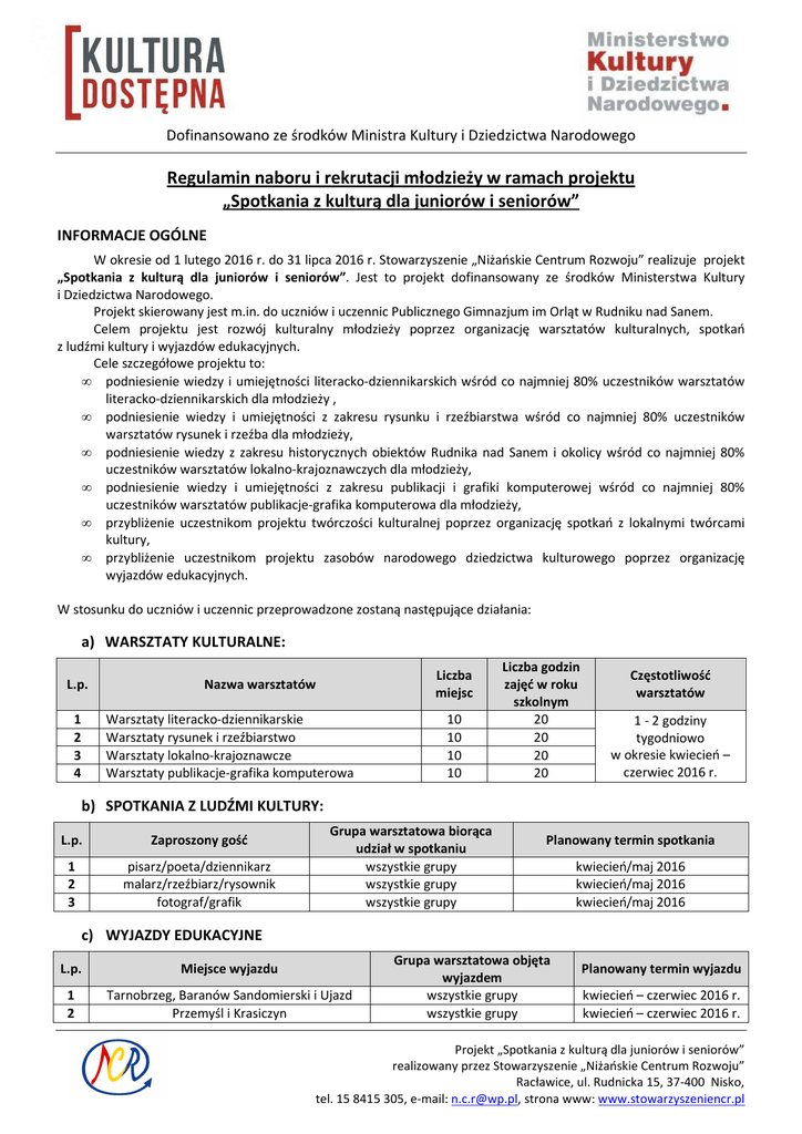 Dofinansowano ze środków Ministra Kultury i Dziedzictwa Narodowego Regulamin naboru i rekrutacji młodzieży w ramach projektu „Spotkania z kulturą dla juniorów i seniorów” INFORMACJE OGÓLNE W okresie od 1 lutego 2016 r. do 31 lipca 2016 r. Stowarzyszenie „Niżańskie Centrum Rozwoju” realizuje projekt „Spotkania z kulturą dla juniorów i seniorów”. Jest to projekt dofinansowany ze środków Ministerstwa Kultury i Dziedzictwa Narodowego. Projekt skierowany jest m.in. do uczniów i uczennic Publicznego Gimnazjum im Orląt w Rudniku nad Sanem. Celem projektu jest rozwój kulturalny młodzieży poprzez organizację warsztatów kulturalnych, spotkań z ludźmi kultury i wyjazdów edukacyjnych. Cele szczegółowe projektu to: • podniesienie wiedzy i umiejętności literacko-dziennikarskich wśród co najmniej 80% uczestników warsztatów literacko-dziennikarskich dla młodzieży , • podniesienie wiedzy i umiejętności z zakresu rysunku i rzeźbiarstwa wśród co najmniej 80% uczestników warsztatów rysunek i rzeźba dla młodzieży, • podniesienie wiedzy z zakresu historycznych obiektów Rudnika nad Sanem i okolicy wśród co najmniej 80% uczestników warsztatów lokalno-krajoznawczych dla młodzieży, • podniesienie wiedzy i umiejętności z zakresu publikacji i grafiki komputerowej wśród co najmniej 80% uczestników warsztatów publikacje-grafika komputerowa dla młodzieży, • przybliżenie uczestnikom projektu twórczości kulturalnej poprzez organizację spotkań z lokalnymi twórcami kultury, • przybliżenie uczestnikom projektu zasobów narodowego dziedzictwa kulturowego poprzez organizację wyjazdów edukacyjnych. W stosunku do uczniów i uczennic przeprowadzone zostaną następujące działania: a) WARSZTATY KULTURALNE: L.p. 1 2 3 4 Liczba miejsc Nazwa warsztatów Warsztaty literacko-dziennikarskie Warsztaty rysunek i rzeźbiarstwo Warsztaty lokalno-krajoznawcze Warsztaty publikacje-grafika komputerowa 10 10 10 10 Liczba godzin zajęć w roku szkolnym 20 20 20 20 Częstotliwość warsztatów 1 - 2 godziny tygodniowo w okresie kwiecień – czerwiec 2016 r. b) SPOTKANIA Z LUDŹMI KULTURY: L.p. Zaproszony gość 1 2 3 pisarz/poeta/dziennikarz malarz/rzeźbiarz/rysownik fotograf/grafik Grupa warsztatowa biorąca udział w spotkaniu wszystkie grupy wszystkie grupy wszystkie grupy Planowany termin spotkania kwiecień/maj 2016 kwiecień/maj 2016 kwiecień/maj 2016 c) WYJAZDY EDUKACYJNE L.p. Miejsce wyjazdu 1 2 Tarnobrzeg, Baranów Sandomierski i Ujazd Przemyśl i Krasiczyn Grupa warsztatowa objęta wyjazdem wszystkie grupy wszystkie grupy Planowany termin wyjazdu kwiecień – czerwiec 2016 r. kwiecień – czerwiec 2016 r. Projekt „Spotkania z kulturą dla juniorów i seniorów” realizowany przez Stowarzyszenie „Niżańskie Centrum Rozwoju” Racławice, ul. Rudnicka 15, 37-400 Nisko, tel. 15 8415 305, e-mail: [email protected], strona www: www.stowarzyszeniencr.pl Dofinansowano ze środków Ministra Kultury i Dziedzictwa Narodowego Udział w projekcie jest całkowicie BEZPŁATNY. Wszelkie wydatki związane z prowadzeniem zajęć, udziałem w spotkaniach i wyjazdach edukacyjnych ponoszone są ze środków projektu. KTO MOŻE UCZESTNICZYĆ W PROJEKCIE: Zgodnie z założeniami Projektu uczestnikami/uczestniczkami projektu mogą być uczniowie Publicznego Gimnazjum im. Orląt w Rudniku nad Sanem – klasy I, II, III. TERMIN PROWADZENIA NABORU I REKRUTACJI Nabór uczniów do projektu będzie prowadzony w okresie od 17 marca 2016 r. – 31 marca 2016 r. Wyniki rekrutacji zostaną podane najpóźniej 10 dni po zakończonym naborze. WARUNKI KWALIFIKACJI Wstępnym warunkiem zakwalifikowania się do udziału w projekcie jest wypełnienie kompletnego formularza zgłoszeniowego i dostarczenie go do osoby wyznaczonej do zbierania formularzy zgłoszeniowych przez Publiczne Gimnazjum im. Orląt w Rudnika nad Sanem – Partnera projektu. W celu przeprowadzenia rekrutacji powołana zostanie Komisja Rekrutacyjna, w skład której wejdą: Koordynator projektu, Nauczyciele/nauczycielki gimnazjum. W pierwszej kolejności komisja dokona weryfikacji dokumentów pod kątem spełnienia wymogów formalnych. Następnie dokonany zostanie wybór chłopców i dziewcząt zgłoszonych do uczestnictwa w warsztatach kulturalnych, według następujących kryteriów: 1. Uzasadnienie potrzeby uczestnictwa w projekcie wypełniane przez ucznia (1-10 pkt). 2. Rozmowa z uczniami chcącymi wziąć udział w projekcie przeprowadzona przez nauczyciela (1-10 pkt). Następnie sporządzone zostaną listy zakwalifikowanych uczestników projektu wraz z listami rezerwowymi w przypadku przekroczenia liczby dostępnych miejsc. W pierwszej kolejności w projekcie będą mogli uczestniczyć uczniowie i uczennice, którzy uzyskają najwyższą liczbę punktów. Decyzje o zakwalifikowaniu do udziału w danych warsztatach kulturalnych podejmuje nauczyciel wyznaczony do rekrutacji danej grupy warsztatowej przez Dyrektora Publicznego Gimnazjum im. Orląt w Rudniku nad Sanem w porozumieniu z Koordynatorem projektu. Jedna osoba będzie mogła wziąć udział w jednych warsztatach. O wynikach rekrutacji uczniowie i uczennice zostaną powiadomieni przez wychowawców oraz poprzez umieszczenie list osób zakwalifikowanych i list rezerwowych do projektu na tablicy ogłoszeń w Publicznym Gimnazjum im. Orląt w Rudniku nad Sanem. W sytuacji małej liczby chętnych przeprowadzony zostanie dodatkowy nabór. Rekrutacja będzie miała charakter otwarty, aby umożliwić wszystkim zainteresowanym uczniom i uczennicom równe szanse dostępu. Aby zapewnić jednakowy dostęp wszystkim potencjalnym uczestnikom i uczestniczkom projektu, uczniowie i uczennice zostaną poinformowani o dniach rekrutacji poprzez plakaty dostępne w szkole, informacje na stronie internetowej Stowarzyszenia „NCR” www.stowarzyszeniencr.pl i szkoły www.pgrudnik.pl, informacje bieżące udzielane przez nauczycieli i personel projektu oraz infor