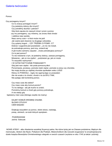 Galeria twórczości Pomoc Czy pomagamy innym? Co to znaczy pomagać innym? Czy jesteśmy dobrzy dla innych? Czy potrafimy słuchać i patrzeć? Gdy ktoś zapuka do naszych drzwi i prosi o pomoc czy mu pomagamy, czy mówimy, że znowu ktoś chodzi i zakłóca nasz spokój. Nasz cenny czas = a ktoś może nie jadł. Jak ważne jest otwarcie na drugiego człowieka, Czy pytamy kogoś :,, CZY TRZEBA CI POMĂ C?' Dobrze i wygodnie jest powiedzieć :,,on nic nie mówił, że potrzebuje pomocy, jest inny, zmienił się' A jak trudno samemu zapytać: ,,może potrzebujesz pomocy?' Co to jest pomoc? To nie mówienie o tym, że jesteśmy dobrzy, zawsze pomagamy, Mówienie:,, jak on ma ciężko', ,,podziwiam go, jak on może To wszystko wytrzymać' I W CZYM FAKTYCZNIE POMAGAMY?! Gdy jest nam ciężko - kto poda pomocną dłoń. Porozmawia, pocieszy, pomoże nieść ciężar, pomoże w pracy czy chorobie. Na mojej drodze po ciężkiej chorobie spotkałam wielu LUDZI Którzy mi POMOGLI , nigdy nie ogarną tego co przeszłam Ale nie wcale o to chodzi, chodzi o to że BYLI TAM, Nie pytając dali konkretną pomoc. Czy masz czas dla siebie? Czy masz czas aby komuś pomóc? To nic takiego - ale jak trudno to zrobić. Pomóżmy komuś w chwili gdy pomocy potrzebuje, A nie wtedy gdy będziemy mieć czas (którego zwykle nie mamy) DAJMY KOMUŚ KROMKĘ CHLEBA SŁOWO OTUCHY CIEŃ NADZIEI Dziękuję wszystkim za pomoc, dobre słowo, nadzieję, pracę, uśmiech, za ludzi których spotykam. POZDRAWIAM Janina Sobczak NOWE ATENY - albo Akademia wszelkiej Scyencyi pełna. Na różne tytuły jak na Classes podzielona, Mądrym dla memoryału, Idiotom dla Nauki, Politykom dla Praktyki, Melancholikom dla rozrywki erygowana' to encyklopedyczne dzieło księdza Benedykta Chmielowskiego odegrało w swoich czasach (wydana w roku 1745 )a także i później) Strona 1/2 znaczącą rolę w rozpowszechnianiu, wśród niewykształconych kręgów szlachty polskiej (zwłaszcza kresowej) poglądów i informacji które już wtedy ludzie światli uważali za zbiór głupstw i idiotyzmów. Nie można jednak księdzu Chmielowskiemu odmówić rzetelności w powoływaniu się na autorów (z pełną wiarą w słowo pisane, choćby rozsądek i doświadczenie mówiły co innego) a także zmysłu obserwacji i celnych sformułowań. Z Nowych Aten pochodzi słynna definicja 'Koń jaki jest, każdy widzi'. No i trudno coś zarzucić poglądom nt. chronicznych niedomogów ojczystego kraju. Poniżej przykładowe hasła: Co w Polszcze jest złego ? Złe są Rządy i złe drogi w Polszcze, złe i mosty.... Jak z ołowiu zrobić żywe srebro? Fallopius Autor każe wziąć ołowiu, ukuć z niego młotkiem na obuchu cienkie blaszki bardzo, przesypać je solą pospolitą, włożyć oboje w naczynie szklane; dobrze zaszpuntować i zakopać w ziemię na całe dni dziewięć, tedy się ta materya zamieni w żywe srebro; jakoż w Olkuszu z ołowiu go wyprowadzają. Próbowałem ja tego, ale bez effektu, znać w ziemię niesposobną zakopałem, albo nie zaszpuntowałem dobrze słoika, albo grube blaszki były z ołowiu Sekret dziwny o węgorzach. Napisał Szentywani z Autorów, że Węgorza uwędziwszy i na kawałki porąbawszy, te kawałki ktoby w sadzawkę, w jezioro powrzucał, miałby z tych kawałków nowe węgorze żywe Strona 2/2