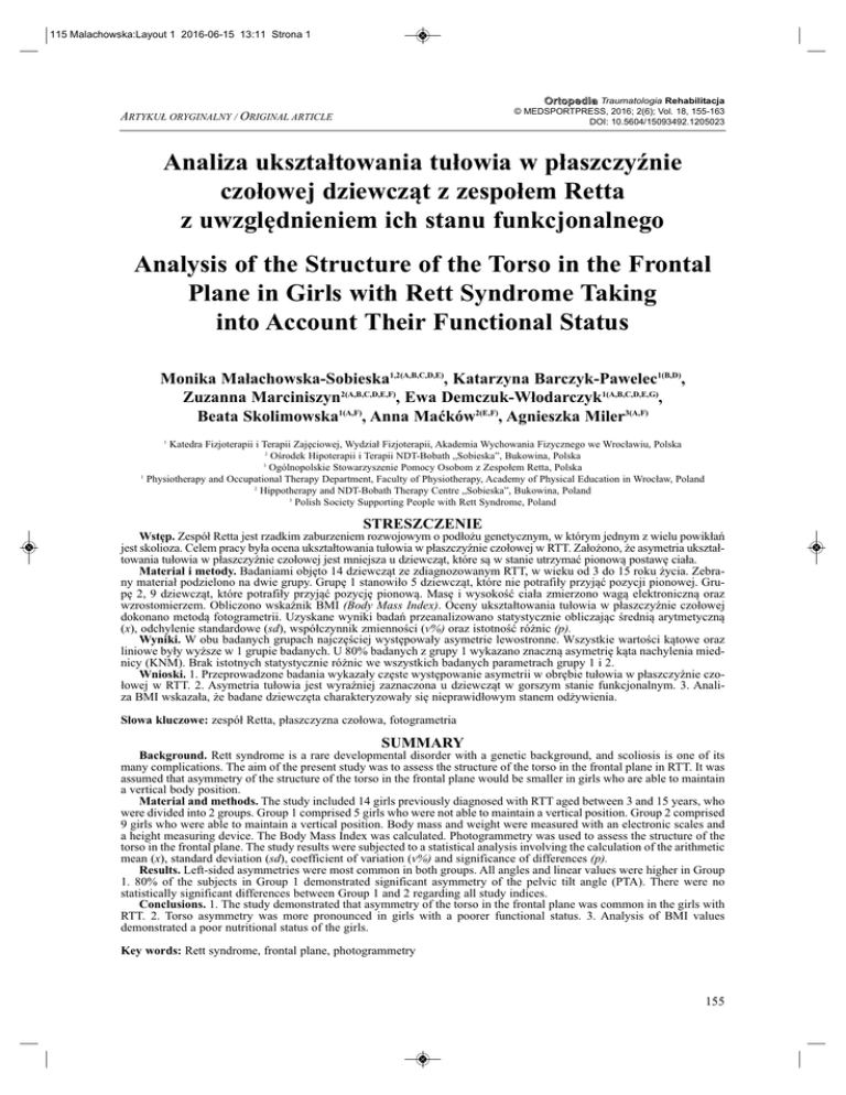 115 Malachowska:Layout 1 2016-06-15 13:11 Strona 1 O r t o p e d i a Traumatologia Rehabilitacja © MEDSPORTPRESS, 2016; 2(6); Vol. 18, 155-163 DOI: 10.5604/15093492.1205023 ARTYKUŁ ORYGINALNY / ORIGINAL ARTICLE Analiza ukształtowania tułowia w płaszczyźnie czołowej dziewcząt z zespołem Retta z uwzględnieniem ich stanu funkcjonalnego Analysis of the Structure of the Torso in the Frontal Plane in Girls with Rett Syndrome Taking into Account Their Functional Status Monika Małachowska-Sobieska1,2(A,B,C,D,E), Katarzyna Barczyk-Pawelec1(B,D), Zuzanna Marciniszyn2(A,B,C,D,E,F), Ewa Demczuk-Włodarczyk1(A,B,C,D,E,G), Beata Skolimowska1(A,F), Anna Maćków2(E,F), Agnieszka Miler3(A,F) 1 Katedra Fizjoterapii i Terapii Zajęciowej, Wydział Fizjoterapii, Akademia Wychowania Fizycznego we Wrocławiu, Polska 2 Ośrodek Hipoterapii i Terapii NDT-Bobath „Sobieska”, Bukowina, Polska 3 Ogólnopolskie Stowarzyszenie Pomocy Osobom z Zespołem Retta, Polska 1 Physiotherapy and Occupational Therapy Department, Faculty of Physiotherapy, Academy of Physical Education in Wrocław, Poland 2 Hippotherapy and NDT-Bobath Therapy Centre „Sobieska”, Bukowina, Poland 3 Polish Society Supporting People with Rett Syndrome, Poland STRESZCZENIE Wstęp. Zespół Retta jest rzadkim zaburzeniem rozwojowym o podłożu genetycznym, w którym jednym z wielu powikłań jest skolioza. Celem pracy była ocena ukształtowania tułowia w płaszczyźnie czołowej w RTT. Założono, że asymetria ukształtowania tułowia w płaszczyźnie czołowej jest mniejsza u dziewcząt, które są w stanie utrzymać pionową postawę ciała. Materiał i metody. Badaniami objęto 14 dziewcząt ze zdiagnozowanym RTT, w wieku od 3 do 15 roku życia. Zebrany materiał podzielono na dwie grupy. Grupę 1 stanowiło 5 dziewcząt, które nie potrafiły przyjąć pozycji pionowej. Grupę 2, 9 dziewcząt, które potrafiły przyjąć pozycję pionową. Masę i wysokość ciała zmierzono wagą elektroniczną oraz wzrostomierzem. Obliczono wskaźnik BMI (Body Mass Index). Oceny ukształtowania tułowia w płaszczyźnie czołowej dokonano metodą fotogrametrii. Uzyskane wyniki badań przeanalizowano statystycznie obliczając średnią arytmetyczną (x), odchylenie standardowe (sd), współczynnik zmienności (v%) oraz istotność różnic (p). Wyniki. W obu badanych grupach najczęściej występowały asymetrie lewostronne. Wszystkie wartości kątowe oraz liniowe były wyższe w 1 grupie badanych. U 80% badanych z grupy 1 wykazano znaczną asymetrię kąta nachylenia miednicy (KNM). Brak istotnych statystycznie różnic we wszystkich badanych parametrach grupy 1 i 2. Wnioski. 1. Przeprowadzone badania wykazały częste występowanie asymetrii w obrębie tułowia w płaszczyźnie czołowej w RTT. 2. Asymetria tułowia jest wyraźniej zaznaczona u dziewcząt w gorszym stanie funkcjonalnym. 3. Analiza BMI wskazała, że badane dziewczęta charakteryzowały się nieprawidłowym stanem odżywienia. Słowa kluczowe: zespół Retta, płaszczyzna czołowa, fotogrametria SUMMARY Background. Rett syndrome is a rare developmental disorder with a genetic background, and scoliosis is one of its many complications. The aim of the present study was to assess the structure of the torso in the frontal plane in RTT. It was assumed that asymmetry of the structure of the torso in the frontal plane would be smaller in girls who are able to maintain a vertical body position. Material and methods. The study included 14 girls previously diagnosed with RTT aged between 3 and 15 years, who were divided into 2 groups. Group 1 comprised 5 girls who were not able to maintain a vertical position. Group 2 comprised 9 girls who were able to maintain a vertical position. Body mass and weight were measured with an electronic scales and a height measuring device. The Body Mass Index was calculated. Photogrammetry was used to assess the structure of the torso in the frontal plane. The study results were subjected to a statistical analysis involving the calculation of the arithmetic mean (x), standard deviation (sd), coefficient of variation (v%) and significance of differences (p). Results. Left-sided asymmetries were most common in both groups. All angles and linear values were higher in Group 1. 80% of the subjects in Group 1 demonstrated significant asymmetry of the pelvic tilt angle (PTA). There were no statistically significant differences between Group 1 and 2 regarding all study indices. Conclusions. 1. The study demonstrated that asymmetry of the torso in the frontal plane was common in the girls with RTT. 2. Torso asymmetry was more pronounced in girls with a poorer functional status. 3. Analysis of BMI values demonstrated a poor nutritional status of the girls. Key words: Rett syndrome, frontal plane, photogrammetry 155 115 Malachowska:Layout 1 2016-06-15 13:11 Strona 2 Małachowska-Sobieska M. i wsp. Analiza ukształtowania tułowia dziewcząt z zespołem Retta WSTĘP Wiedza na temat zespołu Retta (RTT) jest wciąż niewystarczająca. Obraz kliniczny zespołu został po raz pierwszy opisany przez austriackiego pediatrę Andreas Rett w 1965 roku [1]. Jedną z wielu teorii dotyczących pochodzenia RTT jest mutacja genu kodującego białko MECP2 położonego w żeńskim chromosomie X w regionie Xq28 [2]. RTT pojawia się raz na dziesięć tysięcy urodzonych dzieci [3]. Większość pacjentek z klasyczną formą zespołu ma zrównoważoną formę braku aktywności w tkance mózgowej [4]. RTT jest postępującym 4-fazowym zaburzeniem neurorozwojowym. Fazę 1 stanowi okres między 618 miesiącem życia od momentu urodzenia. Dziecko traci stopniowo kontakt wzrokowy oraz przestaje się interesować zabawkami. Faza 2 to okres między 1,54 rokiem życia. Początkowo zauważany jest problem z ruchem kończyn górnych i mową. U części dziewcząt występują zaburzenia równowagi oraz problem z podjęciem jakiegokolwiek ruchu. Faza 3 określana „pozorną stagnacją”, 