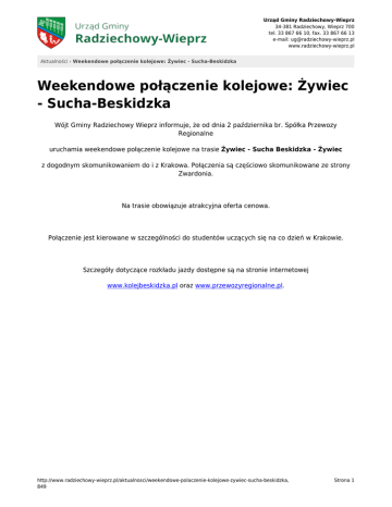 Urząd Gminy Radziechowy-Wieprz 34-381 Radziechowy, Wieprz 700 tel. 33 867 66 10, fax. 33 867 66 13 e-mail: [email protected] www.radziechowy-wieprz.pl Aktualności › Weekendowe połączenie kolejowe: Żywiec - Sucha-Beskidzka Weekendowe połączenie kolejowe: Żywiec - Sucha-Beskidzka Wójt Gminy Radziechowy Wieprz informuje, że od dnia 2 października br. Spółka Przewozy Regionalne uruchamia weekendowe połączenie kolejowe na trasie Żywiec - Sucha Beskidzka - Żywiec z dogodnym skomunikowaniem do i z Krakowa. Połączenia są częściowo skomunikowane ze strony Zwardonia. Na trasie obowiązuje atrakcyjna oferta cenowa. Połączenie jest kierowane w szczególności do studentów uczących się na co dzień w Krakowie. Szczegóły dotyczące rozkładu jazdy dostępne są na stronie internetowej www.kolejbeskidzka.pl oraz www.przewozyregionalne.pl. http://www.radziechowy-wieprz.pl/aktualnosci/weekendowe-polaczenie-kolejowe-zywiec-sucha-beskidzka, 849 Strona 1