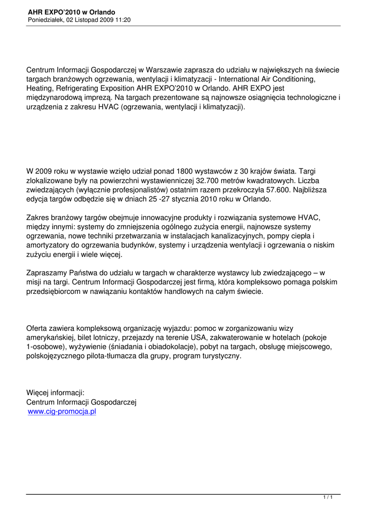 AHR EXPO’2010 w Orlando Poniedziałek, 02 Listopad 2009 11:20 Centrum Informacji Gospodarczej w Warszawie zaprasza do udziału w największych na świecie targach branżowych ogrzewania, wentylacji i klimatyzacji - International Air Conditioning, Heating, Refrigerating Exposition AHR EXPO’2010 w Orlando. AHR EXPO jest międzynarodową imprezą. Na targach prezentowane są najnowsze osiągnięcia technologiczne i urządzenia z zakresu HVAC (ogrzewania, wentylacji i klimatyzacji). W 2009 roku w wystawie wzięło udział ponad 1800 wystawców z 30 krajów świata. Targi zlokalizowane były na powierzchni wystawienniczej 32.700 metrów kwadratowych. Liczba zwiedzających (wyłącznie profesjonalistów) ostatnim razem przekroczyła 57.600. Najbliższa edycja targów odbędzie się w dniach 25 -27 stycznia 2010 roku w Orlando. Zakres branżowy targów obejmuje innowacyjne produkty i rozwiązania systemowe HVAC, między innymi: systemy do zmniejszenia ogólnego zużycia energii, najnowsze systemy ogrzewania, nowe techniki przetwarzania w instalacjach kanalizacyjnych, pompy ciepła i amortyzatory do ogrzewania budynków, systemy i urządzenia wentylacji i ogrzewania o niskim zużyciu energii i wiele więcej. Zapraszamy Państwa do udziału w targach w charakterze wystawcy lub zwiedzającego – w misji na targi. Centrum Informacji Gospodarczej jest firmą, która kompleksowo pomaga polskim przedsiębiorcom w nawiązaniu kontaktów handlowych na całym świecie. Oferta zawiera kompleksową organizację wyjazdu: pomoc w zorganizowaniu wizy amerykańskiej, bilet lotniczy, przejazdy na terenie USA, zakwaterowanie w hotelach (pokoje 1-osobowe), wyżywienie (śniadania i obiadokolacje), pobyt na targach, obsługę miejscowego, polskojęzycznego pilota-tłumacza dla grupy, program turystyczny. Więcej informacji: Centrum Informacji Gospodarczej www.cig-promocja.pl 1/1
